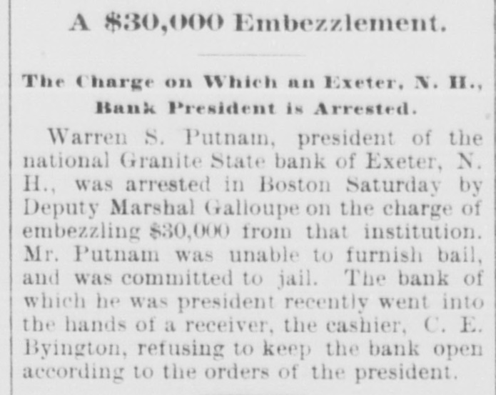 # A $30,000 Embezzlement. The Charge on Which an Exeter, N. H., Bank President is Arrested. Warren S. Putnam, president of the national Granite State bank of Exeter, N. H., was arrested in Boston Saturday by Deputy Marshal Galloupe on the charge of embezzling $30,000 from that institution. Mr. Putnam was unable to furnish bail, and was committed to jail. The bank of which he was president recently went into the hands of a receiver, the cashier, C. E. Byington, refusing to keep the bank open according to the orders of the president.