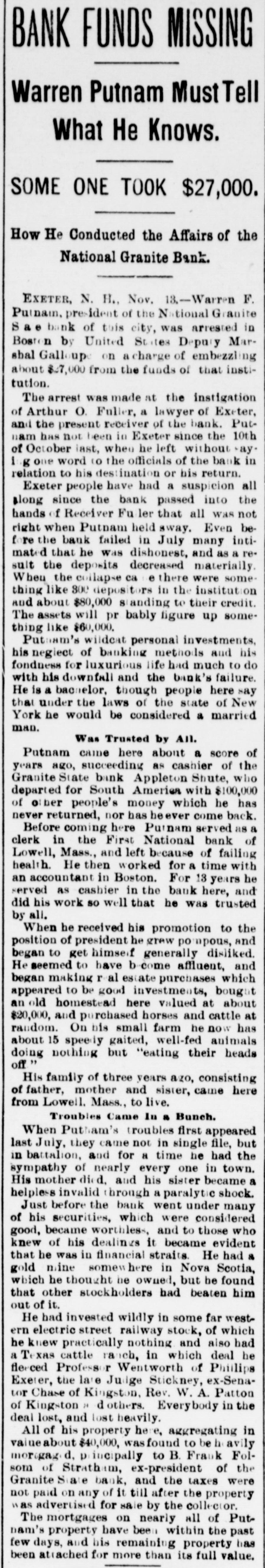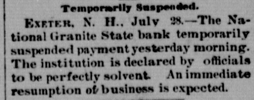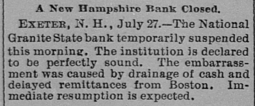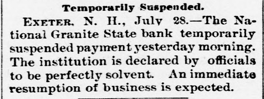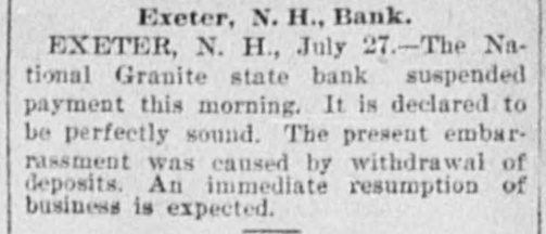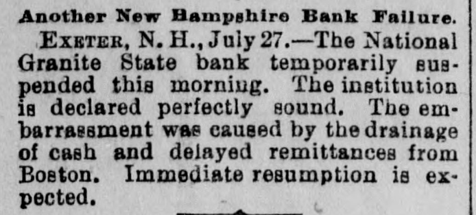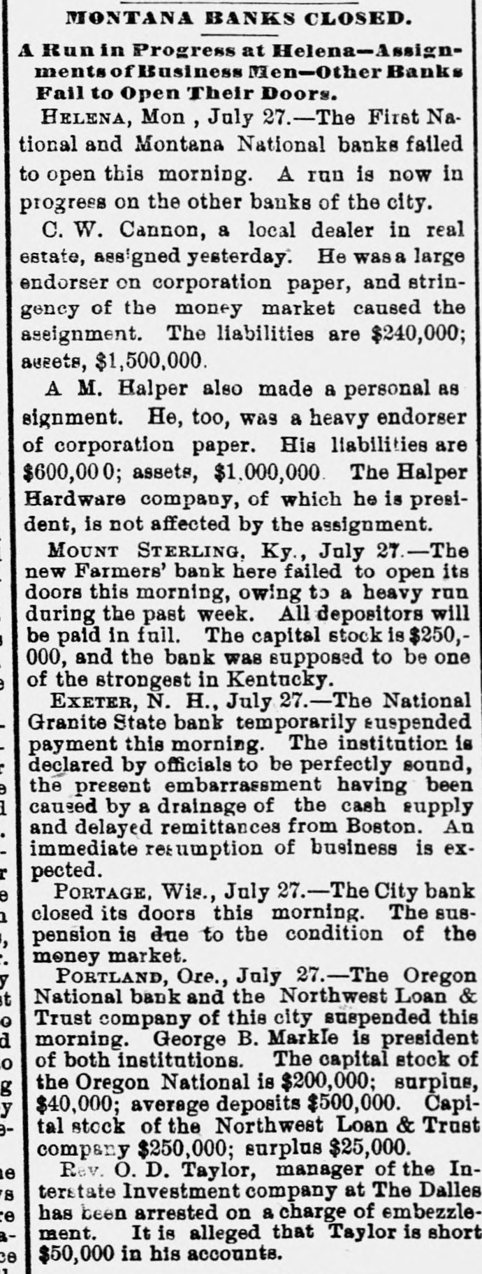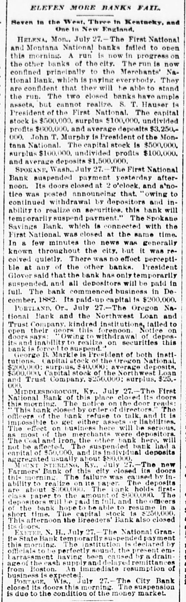 TEN MORE BANKS CLOSED. SIX OF THEM ARE IN STATES OF THE FAR NORTHWEST. INABILITY TO REALIZE ON ASSETS THE CAUSE OF THE SUSPENSION OF ALMOST ALL -THE PANK FAILURES FROM MAY 1 TO JULY 22. Seattle, Wash., July 27.-A dispatch from Spokane says: "The First National Bank suspended payment* yesterday afternoon. Its doors closed at 2 o'clock, and the following notice was posted: "Owing to continued withdrawals by the depositors, and inability to realize on securities, this bank has temporarily suspended payment.' "The Spokane Savings Bank, which is connected with the First National, was closed at the same time. In a few minutes the news was generally known throughout the city, but it was received quietly. There was no effect perceptible at any of the other banks. President Glover says that the suspension is only temporary, and that all depositors will be paid in full." Portland. Ore., July 27.-The Oregon National Bank and the Northwest Loan and Trust Company of this city, suspended this morning. Both institntions were started about live years ago. The rapid withdrawal of depesits and inability to realize on securities are given as the cause of the suspension. George B. Markle is president of both institutions. Capital stock of the Oregon National, $200,000; surplus, $40,000: average deposits, $500,000. Capital stock of the Northwest Loan and Trust Company. $250,000; surplus, $25,000. Helena, Mont., July 27.-The First National and Montana National banks failed to open this morning. Runs were started on the other banks of the city, the most extensive being that on the Merchants' National Bank, which paid everybody. The 1WO closed banks have ample assets, but cannot realize. S. T. Hauser Is president of the First National. The capital stock Is $500,000; surplus, $100,000; the undivided profits are $600,000. and the average deposits $3,250,000. John T. Murphy is president of the Montapa National: its capital stock is $500,000: surplus, $100,000: Its undivided profits are $100,000, and its average deposits $1,500,000. Portage, Wis., July 27.-The City Bank closed its doors this morning. The suspension is due to the condition of the money market. Middlesberoigh. Ky., July 27.-The First National Bank of this place closed its doors this morning. The officers of the bank refuse to talk, and it is impossible to get either assets or liabilities. Most of the merchants here were depositors. Washington, July 27.-The First National Bank of Middlesborough, Ky., which closed its doors this morning, had a capital of $50,000, and 1ts individual deposits aggregated usually about $50,000. Mount Sterling. Ky., July 27.-The new Farmers' Bank of this city closed its doors this morning. The failure was caused by an inability to realize on its paper. The deposits are about $200 000. The bank holds first-class paper to the amount of $000,000. The depositors will be paid in full and the officers of thes bank hope to be able to resume business in a short time. The capital stock is $250,000. Exeter, N. H., July 27 The National Granite State Bank temporarily suspended payment this morning. The institution 18 declared by officials to be perfectly sound, the present embarrassment having been caused by a drainage of the cash supply and delayed mit tances from Boston. An immediate resumption of business is expected. Baltimore. July 27.-A summary of the bank fallures from May 1 to July 22, inclusive, shows that 301 banking institutions. with # total capital of $38,951 033, suspended. The Manufacturers' Record" publishes a complete list of closed banks by States, also a table which shows that five-sixths of these fullures and four fifths of the capital involved were in Western and Pacific States, while only 10 per cent of the failures and 11 per cent of the capital involved were in the South. The number of failures In Southern States was thirty-seven. involving $4.392,100: in the Western and Pacific States the number was 251, involving $31,258,933: and in the Eastern and Northern States, thirteen, with $2,600,000 capital.