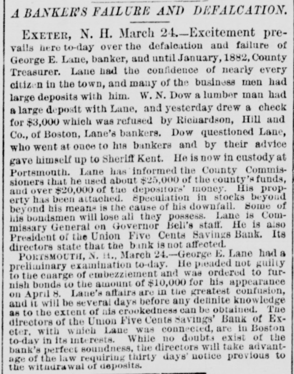 A BANKER'S FAILURE AND DEFALCATION. EXETER, N. H. March 24.-Excitement prevalls here to-day over the defalcation and failure of George E. Lane, banker, and until January, 1882, County Treasurer. Lane had the confidence of nearly every citizen in the town, and many of the business men had large deposits with him. W. N. Dow a lumber man had a large deposit with Lane, and yesterday drew a check for $3,000 which was refused by Richardson, Hill and Co., of Boston, Lane's bankers. Dow questioned Lane, who went at once to his bankers and by their advice gave himself up to Sheriff Kent. He is now in custody at Portsmouth. Lane has informed the County Commissioners that he used about $25,000 of the county's funds, and over $20,000 of the depositors' money. His property has been attached. Speculation in stocks beyond beyond his means is the cause of his downfall. Some of his bondsmen will lose all they possess. Lane is Commissary General on Governor Bell's staff. He is also President of the Union Five Cents Savings Bank. Its directors state that the bank is not affected. PORTSMOUTH, N. 11., March 24.-George E. Lane had a preliminary examination to-day. He preaded not guilty to the enarge of embezziement and was ordered to furnish bonds to the amount of $10,000 for his appearance on April 8. Lane's affairs are in the greatest confusion, and it will be several days before any definite knowledge as to the extent of his crookedness can be obtained. The directors of the Union Five Cents Savings' Bank of Exeter. with which Lane was connected, are in Boston to-day in its interests. While no doubts exist of the bank's perfect soundness, the directors will take advantage of the law requiring thirty days' notice previous to the withdrawal of deposits.