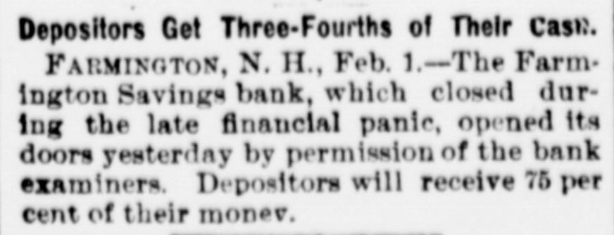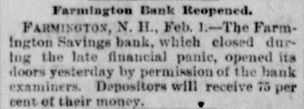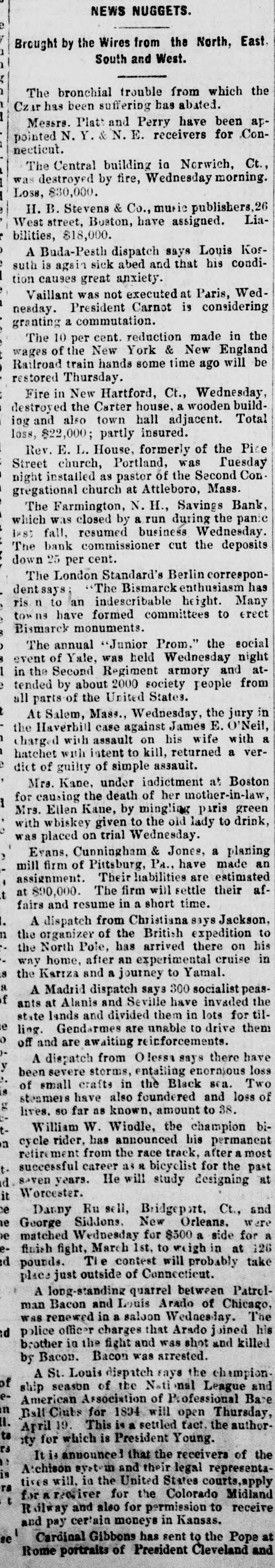 Panic Over in Denver. DENVER, Col., July 20. - There will apparently be no more bank failures in Denver. The panic wore itself out yesterday with the failure of the People's, German and State National Banks. This morning when the First, Colorado, Denver, City and American Nationals opened their doors there was hardly a dozen depositors in all of them at the paying teller's windows. In the First and Colorado Nationals a long string of depositors reaching nearly to the street were lined up in front of the receiving tellers' windows, and the money was going back into the bank vaults almost as rapidly as it was withdrawn during the past three days. The German, State and People's Nationals could pay $3 for $1 if There they could realize on securities. may be a few commercial fallures in the city within the next few days, as a result of the of banks, but it is believed that in no instance, a or a commercial failure be and banking suspension complete, that house, resumption whether will the of business will surely follow shortly. It is stated today that the McNamara dry goods house, which failed Monday for $260,000, have settled with their principal creditors and will resume business on Monday. Run On Banks in Greeley, Col. GREELEY, Col., July 20.-The Union Bank closed its doors at 1p. m. yesterday, and half an hour later the Greeley National pulled down its blinds and turned the key in its door. The Union's statement says that owing to the suspen sion of certain Denver National banks, which had on deposit several thousand dollars of its money, and the fact that there was a steady withdrawal of deposits, about $80,000 in the past 90 days, they were compelled to suspend business. They say their liabilities are about $100,000, with assets and paid up capital $300,000. As soon as the fact of the suspension ot these banks became known a steady run was made on the First National, but it continued to honor all checks and drafts, and even after the regular closing hours cashed two checks presented. On Change in Gotham. NEW YORK, July 20.-There was a sensational decline in general electric securities in the stock exchange after midday. The stocks broke 46 1-2, against 55 3-4 early, the debenture fives sold down to 74 regular. The stock| 1 is absolutely without support and the same crowd in the stock exchange which has been prominent in breaking the stock from 100 down, were conspicuous in today's movement. There were heavy liquidations, holders being unable to stand the pressure any longer. One report was that the company had lost a suit at the West, involving an incandescent lamp patent. Other rumors affeeting the property were of a highly sensational character and up to a late hour this afternoon had not been traced to any authentic source. New Hampshire Bank Enjoined. FARMINGTON, N. H., July 20.-The Farmington Savings bank was enjoined from doing business this afternoon upon the petition of the bank commissioners because of the inability of the institution to realize on its assets, the uneasiness of depositors caused by losses on investments and to prevent a run on the bank. This Plant Cost $1,000,000. SAN FRANCISCO, July 20.-Attachments aggregating several thousand dollars have been filed against the Union Stock Yards company whose packing establishment is at Rodoe, Contra Costa county. The immense,plant, it is said, has practically shut down. The plant cost $1,000,000 and was started May 15. Money Is Tight and the Distillery Closed. FRANKFORT, N. Y., July 20.-A sensation was caused in business circles here today by the assignment of Col. E. H. The Taylor, Jr.. the famous distiller. liabilities are not given out. It is said they are far exceeded by assets. The tightness of the money market caured the assignment.
