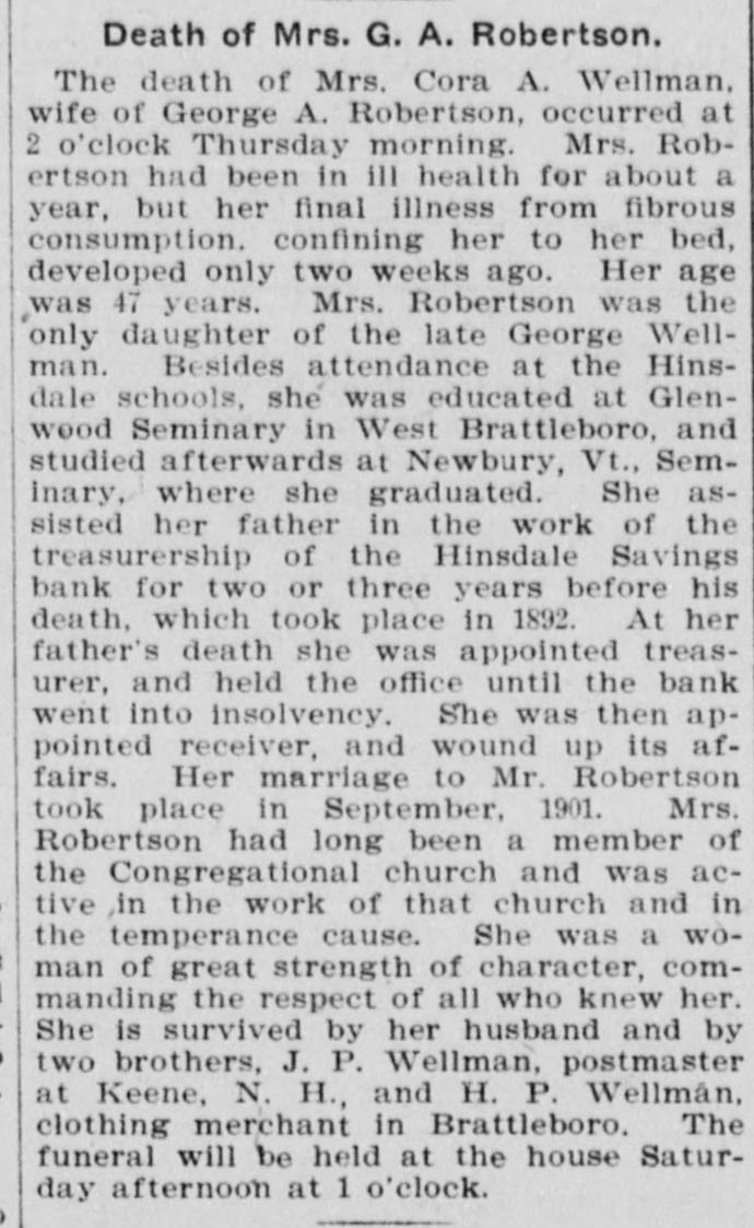 # Death of Mrs. G. A. Robertson. The death of Mrs. Cora A. Wellman, wife of George A. Robertson, occurred at 2 o'clock Thursday morning. Mrs. Robertson had been in ill health for about a year, but her final illness from fibrous consumption, confining her to her bed, developed only two weeks ago. Her age was 47 years. Mrs. Robertson was the only daughter of the late George Wellman. Besides attendance at the Hinsdale schools, she was educated at Glenwood Seminary in West Brattleboro, and studied afterwards at Newbury, Vt., Seminary, where she graduated. She assisted her father in the work of the treasurership of the Hinsdale Savings bank for two or three years before his death, which took place in 1892. At her father's death she was appointed treasurer, and held the office until the bank went into insolvency. She was then appointed receiver, and wound up its affairs. Her marriage to Mr. Robertson took place in September, 1901. Mrs. Robertson had long been a member of the Congregational church and was active in the work of that church and in the temperance cause. She was a woman of great strength of character, commanding the respect of all who knew her. She is survived by her husband and by two brothers, J. P. Wellman, postmaster at Keene, N. H., and H. P. Wellman, clothing merchant in Brattleboro. The funeral will be held at the house Saturday afternoon at 1 o'clock.