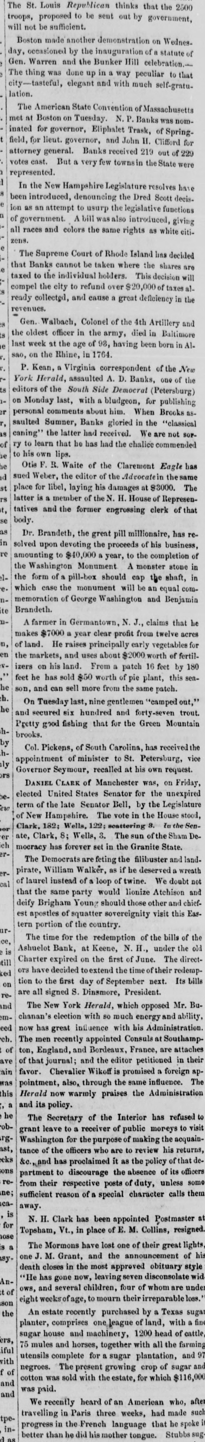 The St. Louis Republican thinks that the 2500 troops, proposed to be sent out by government, will not be sufficient. Boston made another demonstration on Wednesday, occasioned by the inauguration of a statute of Gen. Warren and the Bunker Hill celebration.The thing was done up in a way peculiar to that city-tasteful, elegant and with much self-gratulation. The American State Convention of Massachusetts met at Boston on Tuesday. N. P. Banks was nominated for governor, Eliphalet Trask, of Springfield, for lieut. governor, and John H. Clifford for attorney general. Banks received 219 out of 229 votes cast. But a very few townsin the State were represented. In the New Hampshire Legislature resolves have been introduced, denouncing the Dred Scott decision as an attempt to usurp the legislative functions of government. A bill was also introduced, giving all races and colors the same rights as white citizens. a The Supreme Court of Rhode Island has decided that Banks cannot be taken where the shares are a taxed to the individual holders. This decision will compel the city to refund over $20,000 of taxes alS) ready collected, and cause a great deficiency in the revenues. sa Gen. Walbach, Colonel of the 4th Artillery and S1 the oldest officer in the army, died in Baltimore at last week at the age of 98, having been born in Al1764 n! Rhine the uo 'ous TA is P. Kean, a Virginia correspondent of the New York Herald, assaulted A. D. Banks, one of the S1 editors of the South Side Democrat (Petersburg) on Monday last, with a bludgeon, for publishing Ja personal comments about him. When Brooks as".1 saulted Sumner, Banks gloried in the "classical SE caning" the latter had received. We are not SOFJo ry to learn that he has had the chalice commended at to his own lips. aq Otis F. R. Waite of the Claremont Eagle has pt sued Weber, the editor of the Advocatein thesame 15 place for libel, laying his damages at $3000. The S.I latter is a member of the N. H. House of Represen** tatives and the former engrossing clerk of that as body. SU Dr. Brandeth, the great pill millionaire, has reup solved upon devoting the proceeds of his business, 0.1 amounting to $40,000 a year, to the completion of the Washington Monument A monster stone in -18 up off due planed *** E Jo maoj the e which case the monument will be an equal comE memoration of George Washington and Benjamin Brandeth. to à A farmer in Germantown, N. J., claims that he makes $7000 a year clear profit from twelve acres 'u of land. He raises principally early vegetables for us the markets, and uses about $2000 worth of fertil-si izers on his land. From a patch 16 feet by 180 " feet he has sold $50 worth of pie plant, this seaau son, and can sell more from the same patch. lb. On Tuesday last, nine gentlemen "camped out," by and secured six hundred and forty-seven trout. Pretty good fishing that for the Green Mountain lbbrooks. &q Col. Pickens, of South Carolina, has received the lbappointment of minister to St. Petersburg, vice su Governor Seymour, recalled at his own request. S.10 DANIEL CLARK of Manchester was, on Friday, Deelected United States Senator for the unexpired term of the late Senator Bell, by the Legislature ma of New Hampshire. The vote in the House stood, Clark, 182; Wells, 122; scattering 8. In the SenJO. ate, Clark, 8; Wells, 3. The sun of the Sham Deyou mocracy has forever set in the Granite State. -Ja The Democrats are feting the filibuster and landpirate, William Walker, as if he deserved a wreath -10 of laurel instead of a loop of twine. We doubt not cal that the same party would lionize Atchison and deify Brigham Young should those other and chiefest apostles of squatter sovereignity visit this tern portion of the country. -an The time for the redemption of the bills of 'as Ashuelot Bank, at Keene, N. H., under the s! Charter expired on the first of June. The directII!* per ors have decided toextend the time of their redemption to the first day of September next. Its uo are all signed S. Dinsmore, President. -a.1 pm The New York Herald, which opposed Mr. Bu-ue chanan's election with SO much energy and ability pee now has great influence with his Administration 'yo. The men recently appointed Consuls at Southamp Jo ton, England, and Bordeaux, France, are attaches DAY of that journal; and the editor petitioned in ajv favor. Chevalier Wikoff is promised a foreign SUM pointment, also, through the same influence. this Herald now warmly praises the Administration U and its policy. eq The Secretary of the Interior has refused -qo. grant leave to a receiver of public moreys to -2.1° Washington for the purpose of making the acquain ast tance of the officers who are to review his returns spe that Jo Policy the SU " buy put" 'org suos partment to discourage the absence of its officer -0.1 from their respective posts of duty, unless :eu sufficient reason of a special character calls then -BO 'Sumu !! N. H. Clark has been appointed Postmaster Joj Topsham, Vt., in place of E. M. Collins, resigned tosa U s) The Mormons have lost one of their great lights one J. M. Grant, and the announcement of -Ast death closes in the most approved obituary "He has gone now, leaving seven disconsolate -uy ows, and several children, four of whom are unde Jo $1 eight weeks of age, to mourn their irreparable loss. uos the An estate recently purchased by a Texas planter, comprises one league of land, with a sugar house and machinery, 1200 head of cattle 's.te 75 mules and horses, together with all the farmin Inj! utensils complete for a sugar plantation, and THE negroes. The present growing crop of sugar Jo J cotton was sold with the estate, for which $116,00 puu piud SUM puu We recently heard of an American who, travelling in Paris three weeks, had made the progress in the French language that he spoke in better than he did his mother tongue. Stubbs