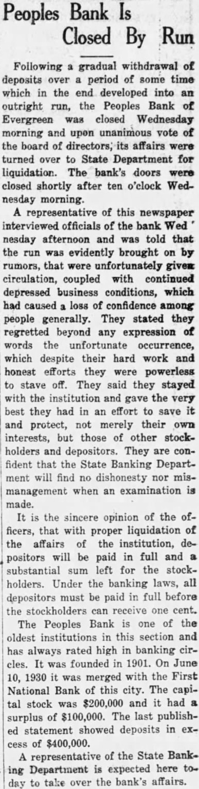 Bank Peoples Closed Run By Following gradual withdrawal of deposits over period of some time which in the end developed into an outright run, the Peoples Bank of Evergreen was closed Wednesday morning and upon unanimous vote of the board of directors; its affairs were turned over to State Department for liquidation. The bank's doors were closed shortly after ten o'clock Wednesday morning. representative of this newspaper interviewed officials of the bank nesday afternoon and was told that the run was evidently brought on by rumors, that were unfortunately given circulation, coupled with continued depressed business conditions, which had caused loss of confidence among people generally. They stated they regretted beyond any expression of words the unfortunate occurrence, which despite their hard work and honest efforts they were powerless stave off. They said they stayed with the institution and gave the very best they had in an effort to save and protect, not merely their OWN interests, but those of other stockholders and depositors. They are confident that the State Banking Department will find no dishonesty nor mismanagement when an examination made. the sincere opinion of the officers, that with proper liquidation of the affairs of the institution, depositors will be paid in full and substantial sum left for the stockholders. Under the banking laws, all depositors must be paid in full before the stockholders can receive one cent. The Peoples Bank is one of the oldest institutions in this section and has always rated high in banking circles. It was founded in 1901. On June 10, was merged with the First National Bank of this city. The capital stock $200,000 and had was surplus of $100,000. The last publishstatement showed deposits in exof $400,000. representative of the State Banking Department expected here today to take over the bank's affairs.