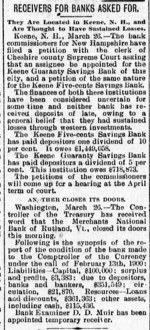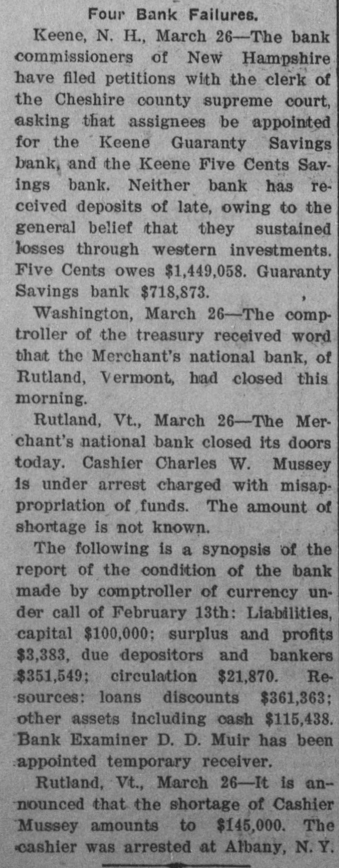 Four Bank Failures. Keene, N. H., March 26-The bank commissioners of New Hampshire have filed petitions with the clerk of the Cheshire county supreme court, asking that assignees be appointed for the Keene Guaranty Savings bank, and the Keene Five Cents Savings bank. Neither bank has received deposits of late, owing to the general belief that they sustained losses through western investments. Five Cents owes $1,449,058. Guaranty Savings bank $718,873. Washington, March 26-The comptroller of the treasury received word that the Merchant's national bank, of Rutland, Vermont, had closed this morning. Rutland, Vt., March 26-The Merchant's national bank closed its doors today. Cashier Charles W. Mussey is under arrest charged with misappropriation of funds. The amount of shortage is not known. The following is a synopsis of the report of the condition of the bank made by comptroller of currency under call of February 13th: Liabilities, capital $100,000; surplus and profits $3,383, due depositors and bankers $351,549; circulation $21,870. Resources: loans discounts $361,363; other assets including cash $115,438. Bank Examiner D. D. Muir has been appointed temporary receiver. Rutland, Vt., March 26-It is announced that the shortage of Cashier Mussey amounts to $145,000. The cashier was arrested at Albany, N.Y.