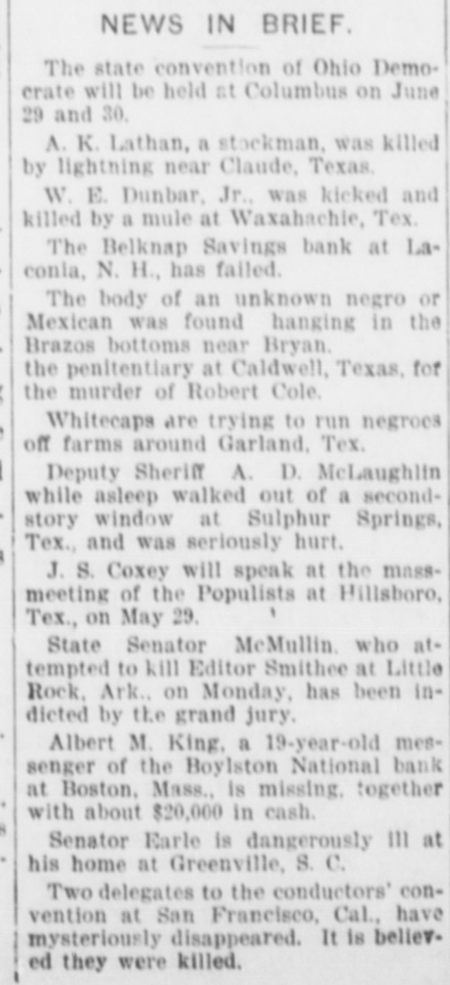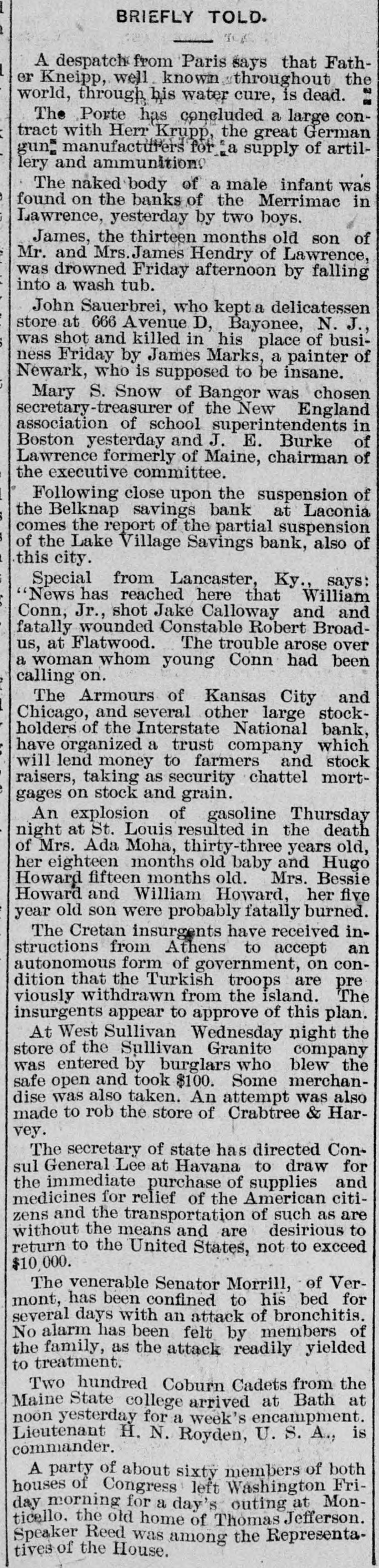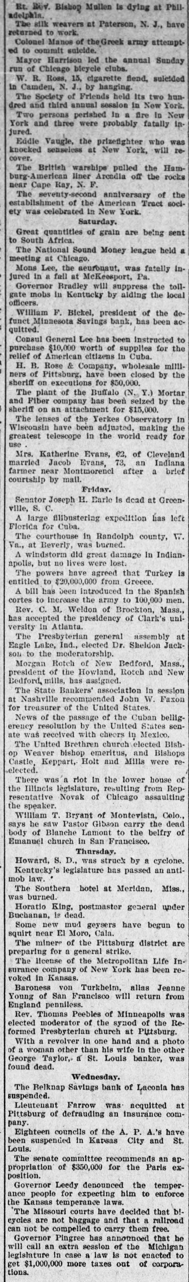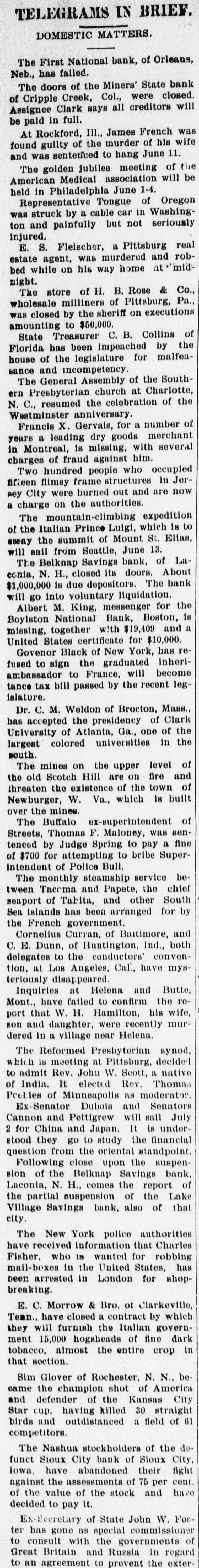 TELEGRAMS IN BRIEF. DOMESTIC MATTERS. The First National bank, of Orleaus, Neb., has failed. The doors of the Miners' State bank of Cripple Creek, Col., were closed. Assignee Clark says all creditors will be paid in full. At Rockford, III., James French was found guilty of the murder of his wife and was sentenced to hang June 11. The golden jubilee meeting of the American Medical association will be held in Philadelphia June 1-4. Representative Tongue of Oregon was struck by a cable car in Washington and painfully but not seriously injured. E. S. Fleischer, a Pittsburg real estate agent, was murdered and robbed while on his way home at "midnight. The store of H. B. Rose & Co., wholesale milliners of Pittsburg, Pa., was closed by the sheriff on executions amounting to $50,000. State Treasurer C. B. Collins of Florida has been impeached by the house of the legislature for malfeasance and incompetency. The General Assembly of the Southern Presbyterian church at Charlotte, N. C., resumed the celebration of the Westminster anniversary. Francis X. Gervais, for a number of years a leading dry goods merchant in Montreal, is missing, with several charges of fraud against him. Two hundred people who occupied fifteen flimsy frame structures in Jersey City were burned out and are now a charge on the authorities. The mountain-climbing expedition of the Italian Prince Luigi, which is to essay the summit of Mount St. Elias, will sail from Seattle, June 13. The Belknap Savings bank, of Laeonia, N. H., closed its doors. About $1,000,000 is due depositors. The bank will go into voluntary liquidation. Albert M. King, messenger for the Boylston National Bank, Boston, is missing, together with $19,409 and a United States certificate for $10,000. Govenor Black of New York, has refused to sign the graduated inheriambassador to France, will become tance tax bill passed by the recent legislature. Dr. C. M. Weldon of Brocton, Mass., has accepted the presidency of Clark University of Atlanta, Ga., one of the largest colored universities in the south. The mines on the upper level of the old Scotch Hill are on fire and threaten the existence of the town of Newburger, W. Va., which is built over the mines. The Buffalo ex-superintendent of Streets, Thomas F. Maloney, was sentenced by Judge Spring to pay a fine of $700 for attempting to bribe Superintendent of Police Bull. The monthly steamship service between Tacoma and Papete, the chief seaport of Tabita, and other South Sea islands has been arranged for by the French government. Cornelius Curran, of Baitimore, and C. E. Dunn, of Huntington, Ind., both delegates to the conductors' convention, at Los Angeles, Cal., have mysteriously disappeared. Inquiries at Helena and Butte, Mont., have failed to confirm the report that W. H. Hamilton, his wife, son and daughter, were recently murdered in a village near Helena. The Reformed Presbyterian synod, which is meeting at Pittsburg, decided to admit Rev. John W. Scott, a native of India. It elected Rev. Thomas Pretles of Minneapolis as moderator. Ex-Senator Dubois and Senators Cannon and Pettigrew will sail July 2 for China and Japan. It is understood they go to study the financial question from the oriental standpoint. Following close upon the suspension of the Belknap Savings bank, Laconia, N. H., comes the report of the partial suspension of the Lake Village Savings bank, also of that city. The New York police authorities have received information that Charles Fisher, who 18 wanted for robbing mail-boxes in the United States, has been arrested in London for shopbreaking. E. C. Morrow & Bro. of Clarkeville, Tean.. have closed a contract by which they will furnish the Italian government 15,000 hogsheads of fine dark tobacco, almost the entire crop in that section. Sim Glover of Rochester, N. N., became the champion shot of America and defender of the Kansas City Star cup, having killed 30 straight birds and outdistanced a field of 61 competitors. The Nashua stockholders of the defunct Sioux City bank of Sioux City, Iowa, have abandoned their fight