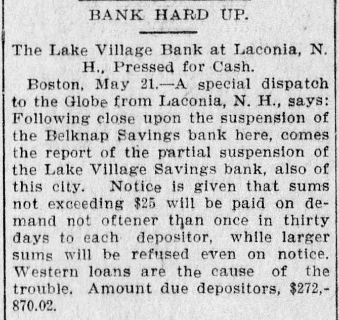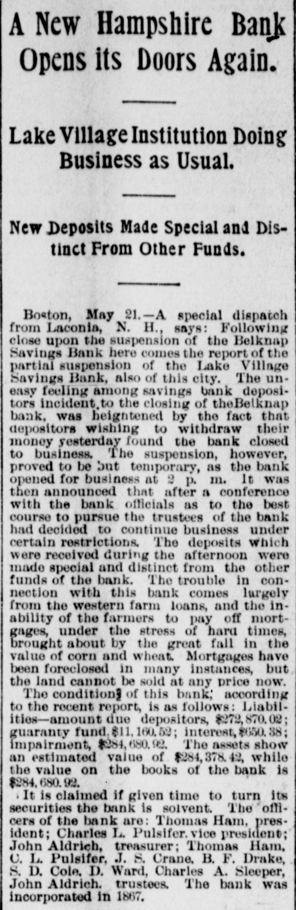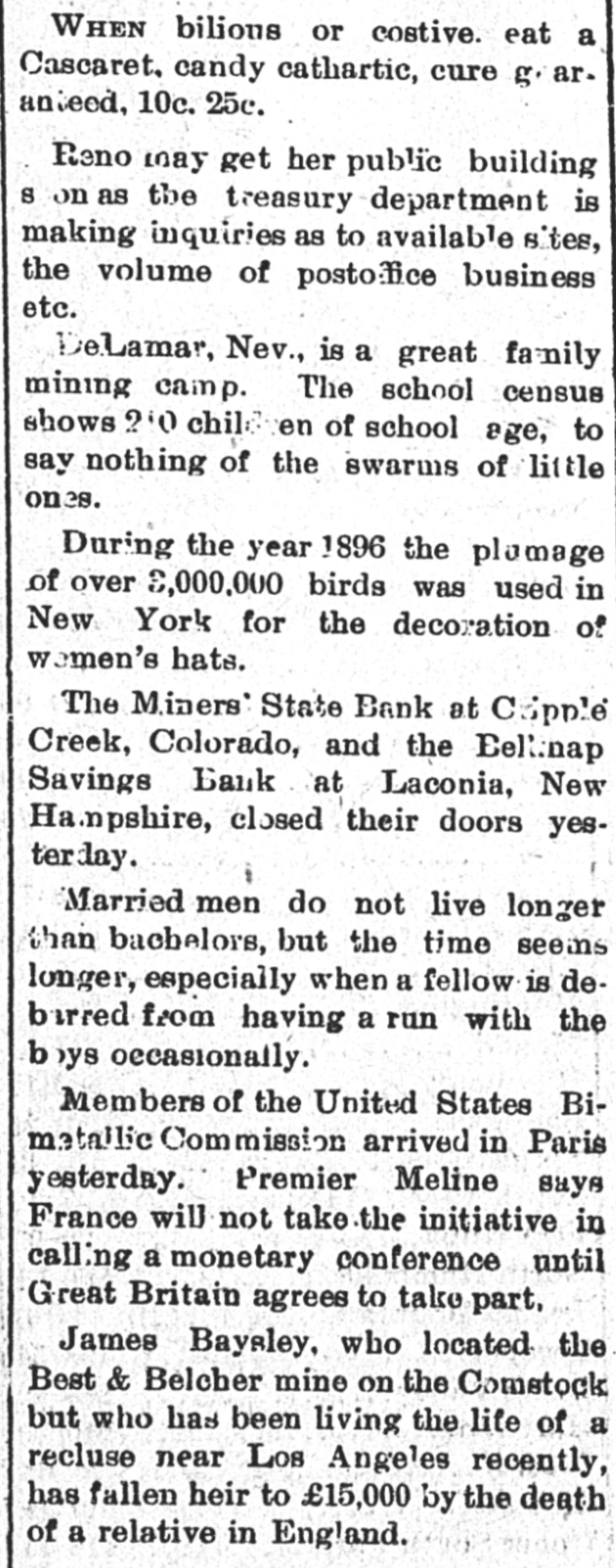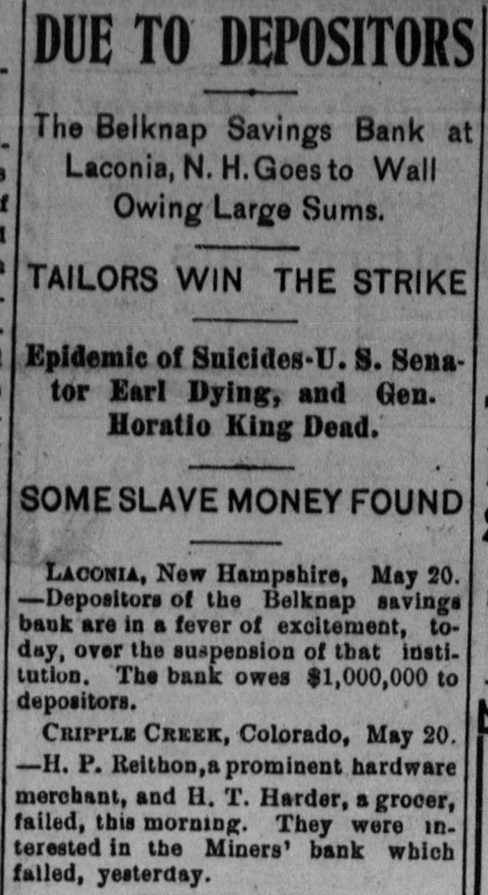 TELEGRAMS IN BRIEF. DOMESTIC MATTERS. The First National bank, of Orleaus, Neb., has failed. The doors of the Miners' State bank of Cripple Creek, Col., were closed. Assignee Clark says all creditors will be paid in full. At Rockford, III., James French was found guilty of the murder of his wife and was sentenced to hang June 11. The golden jubilee meeting of the American Medical association will be held in Philadelphia June 1-4. Representative Tongue of Oregon was struck by a cable car in Washington and painfully but not seriously injured. E. S. Fleischer, a Pittsburg real estate agent, was murdered and robbed while on his way home at "midnight. The store of H. B. Rose & Co., wholesale milliners of Pittsburg, Pa., was closed by the sheriff on executions amounting to $50,000. State Treasurer C. B. Collins of Florida has been impeached by the house of the legislature for malfeasance and incompetency. The General Assembly of the Southern Presbyterian church at Charlotte, N. C., resumed the celebration of the Westminster anniversary. Francis X. Gervais, for a number of years a leading dry goods merchant in Montreal, is missing, with several charges of fraud against him. Two hundred people who occupied fifteen flimsy frame structures in Jersey City were burned out and are now a charge on the authorities. The mountain-climbing expedition of the Italian Prince Luigi, which is to essay the summit of Mount St. Elias, will sail from Seattle, June 13. The Belknap Savings bank, of Laeonia, N. H., closed its doors. About $1,000,000 is due depositors. The bank will go into voluntary liquidation. Albert M. King, messenger for the Boylston National Bank, Boston, is missing, together with $19,409 and a United States certificate for $10,000. Govenor Black of New York, has refused to sign the graduated inheriambassador to France, will become tance tax bill passed by the recent legislature. Dr. C. M. Weldon of Brocton, Mass., has accepted the presidency of Clark University of Atlanta, Ga., one of the largest colored universities in the south. The mines on the upper level of the old Scotch Hill are on fire and threaten the existence of the town of Newburger, W. Va., which is built over the mines. The Buffalo ex-superintendent of Streets, Thomas F. Maloney, was sentenced by Judge Spring to pay a fine of $700 for attempting to bribe Superintendent of Police Bull. The monthly steamship service between Tacoma and Papete, the chief seaport of Tabita, and other South Sea islands has been arranged for by the French government. Cornelius Curran, of Baitimore, and C. E. Dunn, of Huntington, Ind., both delegates to the conductors' convention, at Los Angeles, Cal., have mysteriously disappeared. Inquiries at Helena and Butte, Mont., have failed to confirm the report that W. H. Hamilton, his wife, son and daughter, were recently murdered in a village near Helena. The Reformed Presbyterian synod, which is meeting at Pittsburg, decided to admit Rev. John W. Scott, a native of India. It elected Rev. Thomas Pretles of Minneapolis as moderator. Ex-Senator Dubois and Senators Cannon and Pettigrew will sail July 2 for China and Japan. It is understood they go to study the financial question from the oriental standpoint. Following close upon the suspension of the Belknap Savings bank, Laconia, N. H., comes the report of the partial suspension of the Lake Village Savings bank, also of that city. The New York police authorities have received information that Charles Fisher, who 18 wanted for robbing mail-boxes in the United States, has been arrested in London for shopbreaking. E. C. Morrow & Bro. of Clarkeville, Tean.. have closed a contract by which they will furnish the Italian government 15,000 hogsheads of fine dark tobacco, almost the entire crop in that section. Sim Glover of Rochester, N. N., became the champion shot of America and defender of the Kansas City Star cup, having killed 30 straight birds and outdistanced a field of 61 competitors. The Nashua stockholders of the defunct Sioux City bank of Sioux City, Iowa, have abandoned their fight