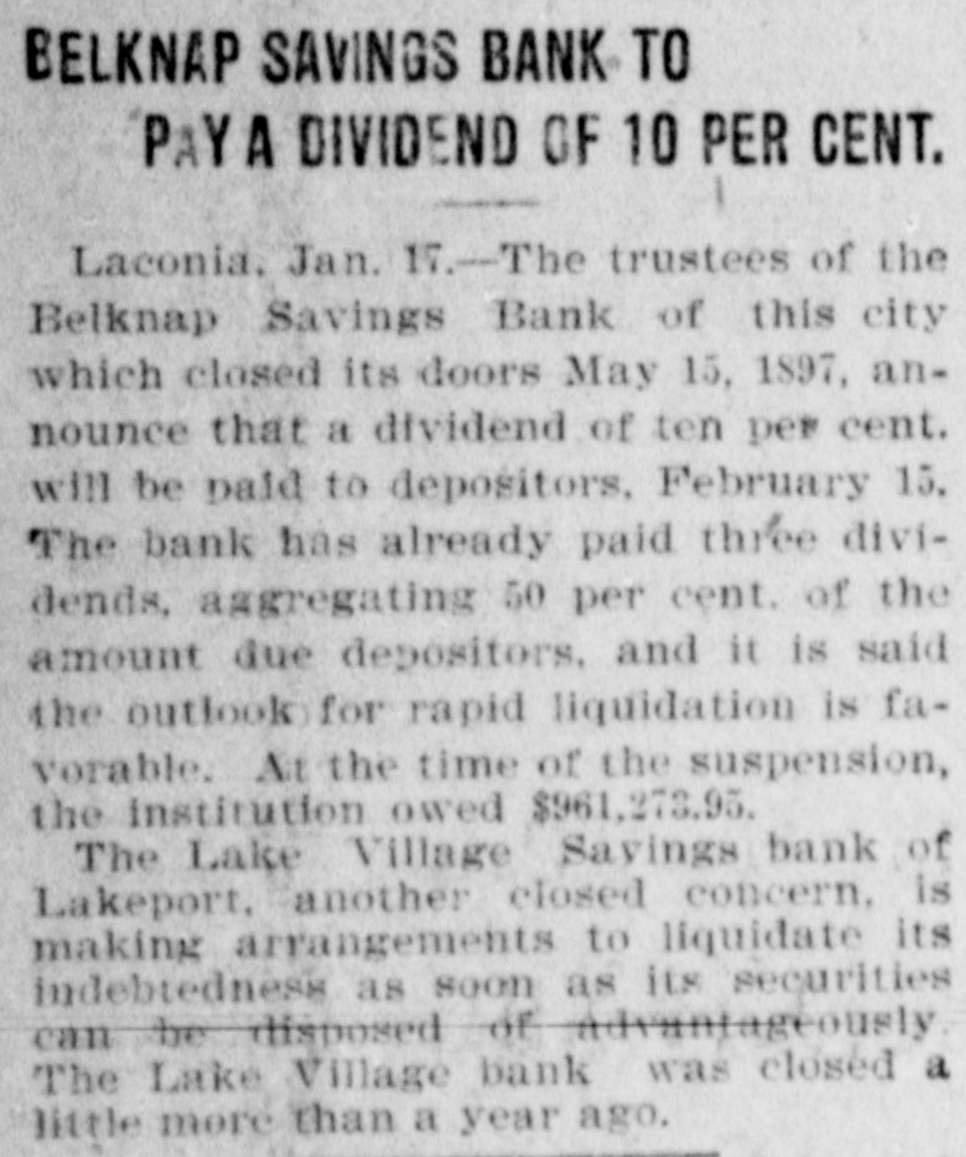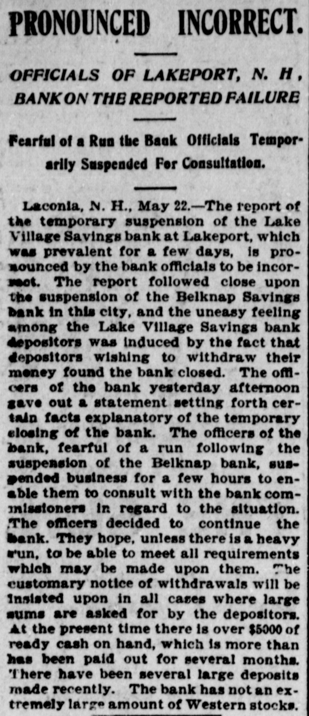 PRONOUNCED INCORRECT. OFFICIALS OF LAKEPORT, N. H BANKON THE REPORTED FAILURE Fearful of a Run the Bank Officials Temporarily Suspended For Consultation. Laconia, N. H., May 22.-The report of the temporary suspension of the Lake Village Savings bank at Lakeport, which was prevalent for a few days, is promounced by the bank officials to be incorrect. The report followed close upon the suspension of the Belknap Savings bank in this city, and the uneasy feeling among the Lake Village Savings bank depositors was induced by the fact that depositors wishing to withdraw their money found the bank closed. The officers of the bank yesterday afternoon zave out a statement setting forth certain facts explanatory of the temporary elosing of the bank. The officers of the bank, fearful of a run following the suspension of the Belknap bank, suspended business for a few hours to enable them to consult with the bank commissioners in regard to the situation. The officers decided to continue the bank. They hope, unless there is a heavy run, to be able to meet all requirements which may be made upon them. The customary notice of withdrawals will be Insisted upon in all cases where large sums are asked for by the depositors. At the present time there is over $5000 of ready cash on hand, which is more than has been paid out for several months. There have been several large deposits made recently. The bank has not an extremely large amount of Western stocks.