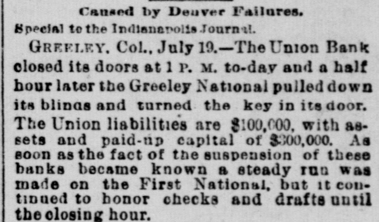 Caused by Deaver Failures. Special to the Indianapolis Journal. GREELEY. Col., July 19.-The Union Bank closed its doors at 1 P. M. to-day and a half hour later the Greeley National pulled down its blings and turned the key in its door. The Union liabilities are $100,000, with assets and paid-up capital of $300,000. As BOON as the fact of the suspension of these banks became known a steady run was made on the First National, but it continued to honor checks and drafts until the e losing hour.