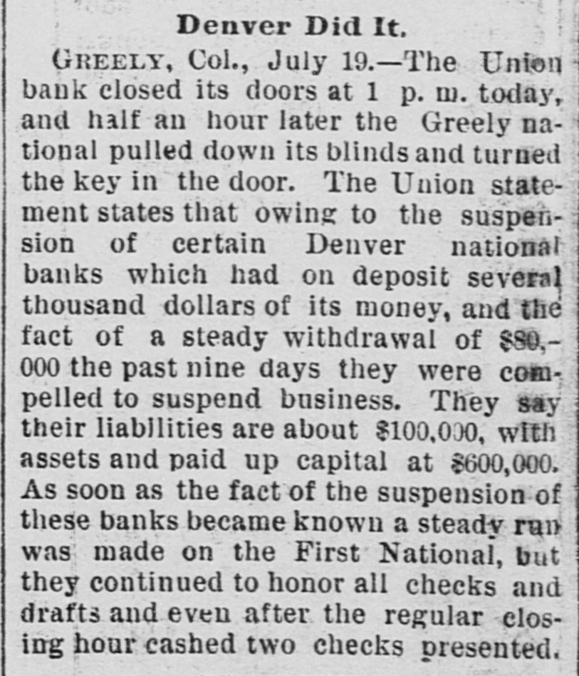 Suspension attributed to inability to raise ready cash following the suspension of Denver banks (which held deposits of local banks) and heavy withdrawals from depositors (~$80,000 over 90 days).