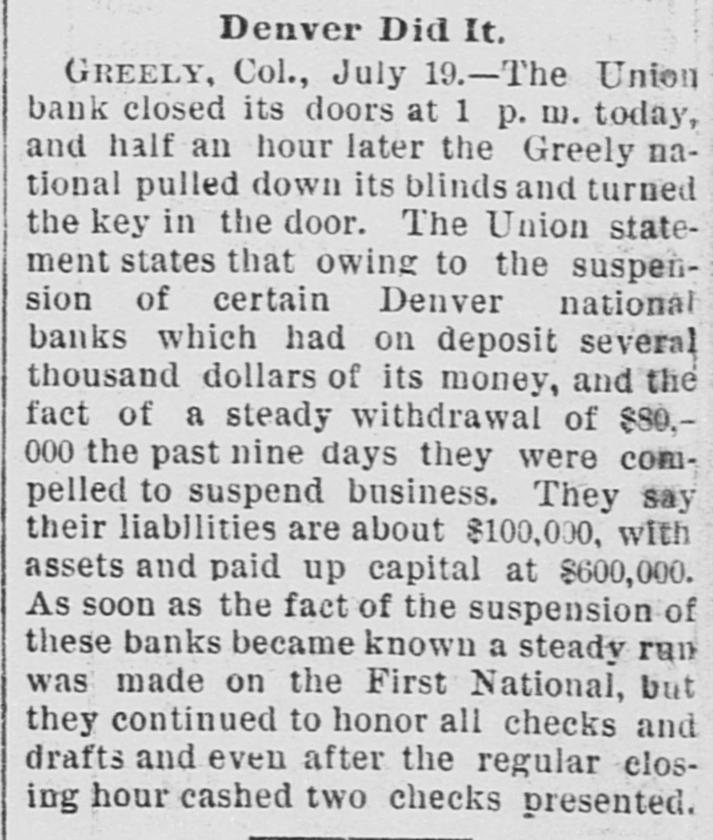 Denver Did It. GREELY, Col., July 19.-The Union bank closed its doors at 1 p. m. today, and half an hour later the Greely national pulled down its blinds and turned the key in the door. The Union statement states that owing to the suspension of certain Denver national banks which had on deposit several thousand dollars of its money, and the fact of a steady withdrawal of $80,000 the past nine days they were compelled to suspend business. They say their liabilities are about $100,000, with assets and paid up capital at $600,000. As soon as the fact of the suspension of these banks became known a steady run was made on the First National, but they continued to honor all checks and drafts and even after the regular closing hour cashed two checks presented.