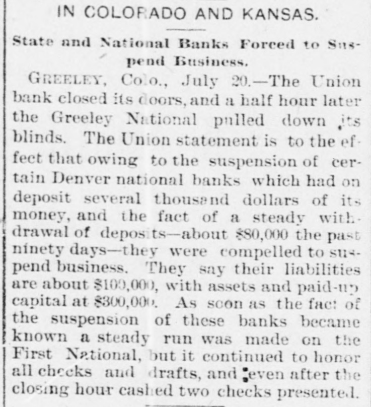 Newspaper accounts (Jul 19–20, 1893) report a run on the First National in Greeley after several Denver national banks suspended; some sources state the Greeley 'Greeley National' pulled down its blinds and other roundups list the First National among suspensions in the state. Contemporaneous items explicitly say the First National honored checks and even cashed two after closing, but later compilations list it as suspended. There is no clear statement of a permanent closure or receivership in these clippings, so I classify as run → suspension but uncertain whether it remained closed.