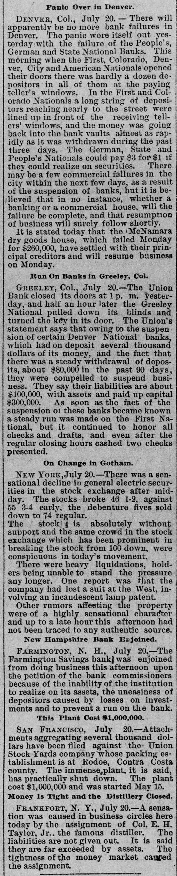 Panic Over in Denver. DENVER, Col., July 20. - There will apparently be no more bank failures in Denver. The panic wore itself out yesterday with the failure of the People's, German and State National Banks. This morning when the First, Colorado, Denver, City and American Nationals opened their doors there was hardly a dozen depositors in all of them at the paying teller's windows. In the First and Colorado Nationals a long string of depositors reaching nearly to the street were lined up in front of the receiving tellers' windows, and the money was going back into the bank vaults almost as rapidly as it was withdrawn during the past three days. The German, State and People's Nationals could pay $3 for $1 if There they could realize on securities. may be a few commercial fallures in the city within the next few days, as a result of the of banks, but it is believed that in no instance, a or a commercial failure be and banking suspension complete, that house, resumption whether will the of business will surely follow shortly. It is stated today that the McNamara dry goods house, which failed Monday for $260,000, have settled with their principal creditors and will resume business on Monday. Run On Banks in Greeley, Col. GREELEY, Col., July 20.-The Union Bank closed its doors at 1p. m. yesterday, and half an hour later the Greeley National pulled down its blinds and turned the key in its door. The Union's statement says that owing to the suspen sion of certain Denver National banks, which had on deposit several thousand dollars of its money, and the fact that there was a steady withdrawal of deposits, about $80,000 in the past 90 days, they were compelled to suspend business. They say their liabilities are about $100,000, with assets and paid up capital $300,000. As soon as the fact of the suspension ot these banks became known a steady run was made on the First National, but it continued to honor all checks and drafts, and even after the regular closing hours cashed two checks presented. On Change in Gotham. NEW YORK, July 20.-There was a sensational decline in general electric securities in the stock exchange after midday. The stocks broke 46 1-2, against 55 3-4 early, the debenture fives sold down to 74 regular. The stock| 1 is absolutely without support and the same crowd in the stock exchange which has been prominent in breaking the stock from 100 down, were conspicuous in today's movement. There were heavy liquidations, holders being unable to stand the pressure any longer. One report was that the company had lost a suit at the West, involving an incandescent lamp patent. Other rumors affeeting the property were of a highly sensational character and up to a late hour this afternoon had not been traced to any authentic source. New Hampshire Bank Enjoined. FARMINGTON, N. H., July 20.-The Farmington Savings bank was enjoined from doing business this afternoon upon the petition of the bank commissioners because of the inability of the institution to realize on its assets, the uneasiness of depositors caused by losses on investments and to prevent a run on the bank. This Plant Cost $1,000,000. SAN FRANCISCO, July 20.-Attachments aggregating several thousand dollars have been filed against the Union Stock Yards company whose packing establishment is at Rodoe, Contra Costa county. The immense,plant, it is said, has practically shut down. The plant cost $1,000,000 and was started May 15. Money Is Tight and the Distillery Closed. FRANKFORT, N. Y., July 20.-A sensation was caused in business circles here today by the assignment of Col. E. H. The Taylor, Jr.. the famous distiller. liabilities are not given out. It is said they are far exceeded by assets. The tightness of the money market caured the assignment.