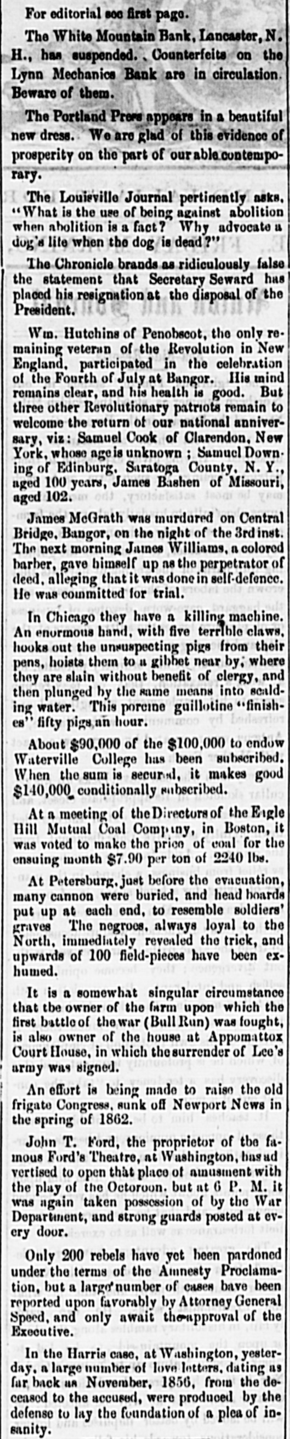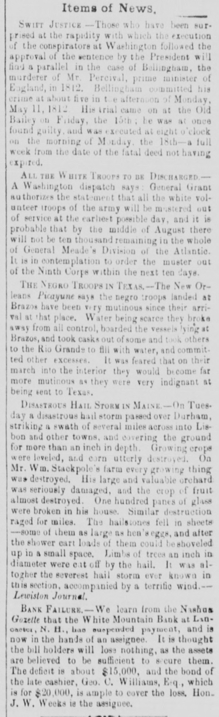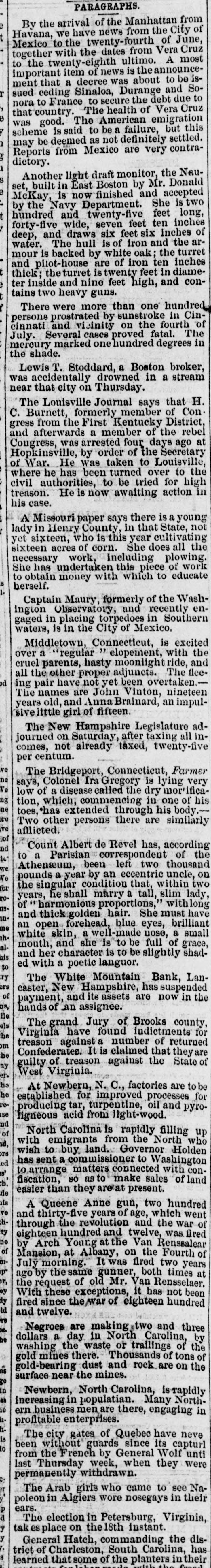 By the arrival of the Manhattan from Havana, we have news from the City of Mexico to the twenty-fourth of June, together with the dates from Vera Cruz to the twenty-eighth ultimo. A most important item of news is theannouncement that a decree was about to be issued ceding Sinaloa, Durange and Sonora to France to secure the debt due to that country. The health of Vera Cruz was good. The American emigration scheme is said to be a failure, but this may be deemed as not definitely settled. Reports from Mexico are very contradictory. Another light draft monitor, the Nauset, built in East Boston by Mr. Donald McKay, is now finished and accepted by the Navy Department. She is two hundred and twenty-five feet long, forty-five wide, seven feet ten inches deep, and draws six feet six inches of water. The hull is of iron and the armour is backed by white oak; the turret and pilot-house are of iron ten inches thick; the turret is twenty feet in diameter inside and nine feet high, and contains two heavy guns. There were more than one hundred persons prostrated by sunstroke in Cincinnati and vicinity on the fourth of July. Several cases proved fatal. The mercury marked one hundred degrees in the shade. Lewis T. Stoddard, a Boston broker, was accidentally drowned in a stream near that city on Thursday. The Louisville Journal says that H. C. Burnett, formerly member of Con. gress from the First Kentucky District, and afterwards a member of the rebel Congress, was arrested four days ago at Hopkinsville, by order of the Secretary of War. He was taken to Louisville, where he has been turned over to the civil authorities, to be tried for high treason. He is now awaiting action in his case. A Missouri paper says there is a young lady in Henry County, in that State, not yet sixteen, who is this year cultivating sixteen acres of corn. She does all the necessary work, Including plowing. She has undertaken this piece of work to obtain money with which to educate herself. Captain Maury, formerly of the Washington Observatory, and recently engaged in placing torpedoes in Southern waters, is in the City of Mexico. Middletown, Connecticut, is excited over a regular " elopement, with the cruel parents, hasty moonlight ride, and all the other proper adjuncts. The fleeing pair have not yet been overtaken. The names are John Vinton, nineteen years old, and Anna Brainard, an impulsivelittle girl of fifteen. The New Hampshire Legislature adjourned on Saturday, after taxing all incomes, not already taxed, twenty-five per centum. The Bridgeport, Connecticut, Farmer says, Colonel Ira Gregory is lying very low of a disease called the dry mortification, which, commencing in one of his toes, has extended through his body. Two other persons there are similarly afflicted. Count Albert de Revel has, according to a Parisian correspondent of the Athenseum, been left two thousand pounds a year by an eccentric uncle, on the singular condition that, within two years, he shall marry a tall, slim lady, of harmonious proportions,' withlong and thick.golden hair. She must have an open forehead, blue eyes, brilliant white skin, a well-made nose, a small mouth, and she is to be full of grace, and her character is to be slightly shaded with a poetic languor. The White Mountain Bank, Lancaster, New Hampshire, has suspended of payment, and its assets are now in the hands of an assignee. The grand Jury of Brooks county, Virginia have found indictments for he treason against a number of returned Confederates. It is claimed that theyare be guilty of treason against the State of West Virginia. At Newbern, N. C., factories are to be established for improved processes for producing tar, turpentine, oil and pyroligneous acid from light-wood. of North Carolina is rapidly filling up with emigrants from the North who wish to buy land. Governor Holden has sent a commissioner to Washington to arrange matters connected with confiscation, so as to make sales of land easier than they are at present. A Queene Anne gun, two hundred and thirty-five years of age, which went through the revolution and the war of eighteen hundred and twelve, was fired by Arch Young at the Van Renssalear of Mansion, at Albany, on the Fourth of July morning. It was fired two years ago by the same gunner, both times at the request of old Mr. Van Rensselaer. With these exceptions, it has not been fired since the war of eighteen hundred Id and twelve. Negroes are making two and three dollars a day in North Carolina, by washing the waste or trailings of the gold mines there. Thousands of tons of gold-bearing dust and rock are on the surface near the mines. Newbern, North Carolina, is rapidly increasing in populatian. Many Northern business men are there, engaging in profitable enterprises. The city gates of Quebec have neve been without guards since its capturl from the French by General Wolf unti last Thursday week, when they were permanently withdrawn. The Arab girls who came to see Napoleon in Algiers wore nosegays in their ears. The election in Petersburg, Virginia, tak place on the 18th instant. General Hatch, commanding the distriet of Charleston, South Carolina, has learned that some of the planters in their