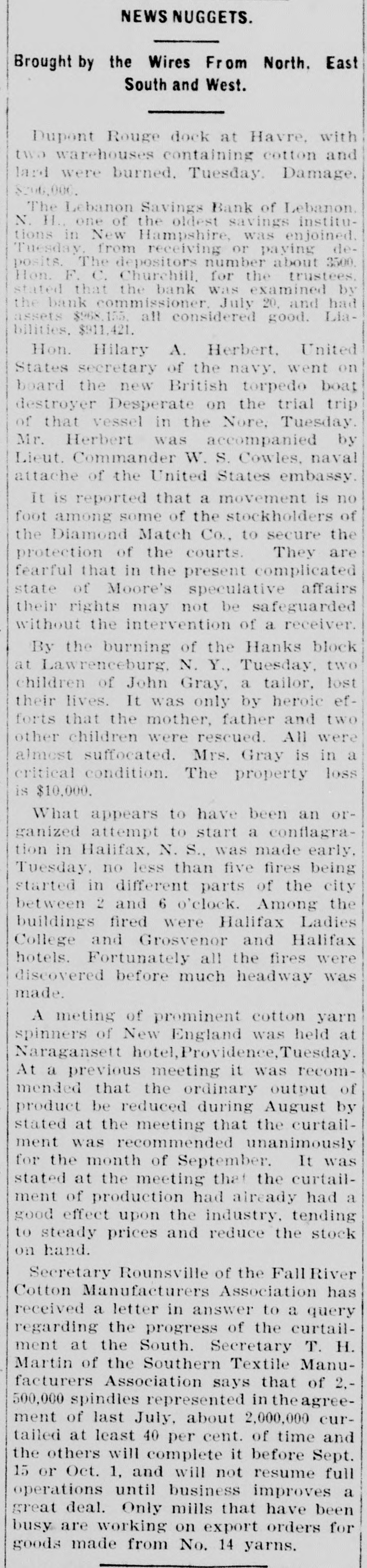 NEWS NUGGETS. Brought by the Wires From North. East South and West. Dupont Rouge dock at Havre, with two warehouses containing cotton and lard were burned. Tuesday. Damage. $200,000. The Lebanon Savings Bank of Lebanon. N. H., one of the oldest savings institutions in New Hampshire, was enjoined. Tuesday, from receiving or paying deposits. The depositors number about 3500. Hon. F. C. Churchill, for the trustees. stated that the bank was examined by the bank commissioner. July 20, and had assets $968,155. all considered good. Liabilities, $911,421. Hon. Hilary A. Herbert. United States secretary of the navy. went on board the new British torpedo boat destroyer Desperate on the trial trip of that vessel in the Nore, Tuesday. Mr. Herbert was accompanied by Lieut. Commander W. S. Cowles, naval attache of the United States embassy. It is reported that a movement is no foot among some of the stockholders of the Diamond Match Co., to secure the protection of the courts. They are fearful that in the present complicated state of Moore's speculative affairs their rights may not be safeguarded without the intervention of a receiver. By the burning of the Hanks block at Lawrenceburg, N. Y., Tuesday, two children of John Gray, a tailor, lost their lives. It was only by heroic efforts that the mother, father and two other children were rescued. All were almost suffocated. Mrs. Gray is in a critical condition. The property loss is $10,000. What appears to have been an organized attempt to start a conflagration in Halifax, N. S., was made early. Tuesday. no less than five fires being started in different parts of the city between 2 and 6 o'clock. Among the buildings fired were Halifax Ladies College and Grosvenor and Halifax hotels. Fortunately all the fires were discovered before much headway was made
