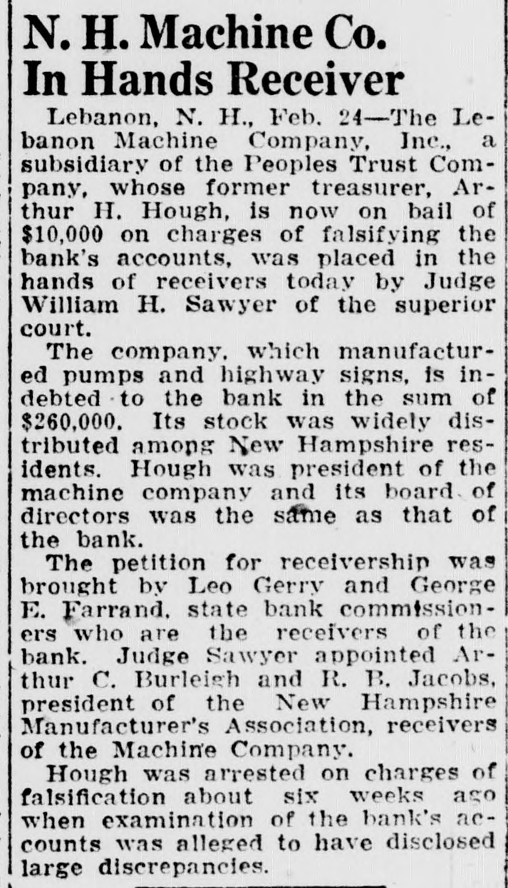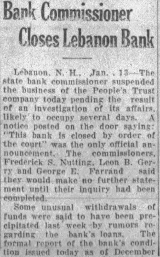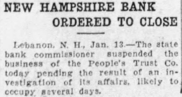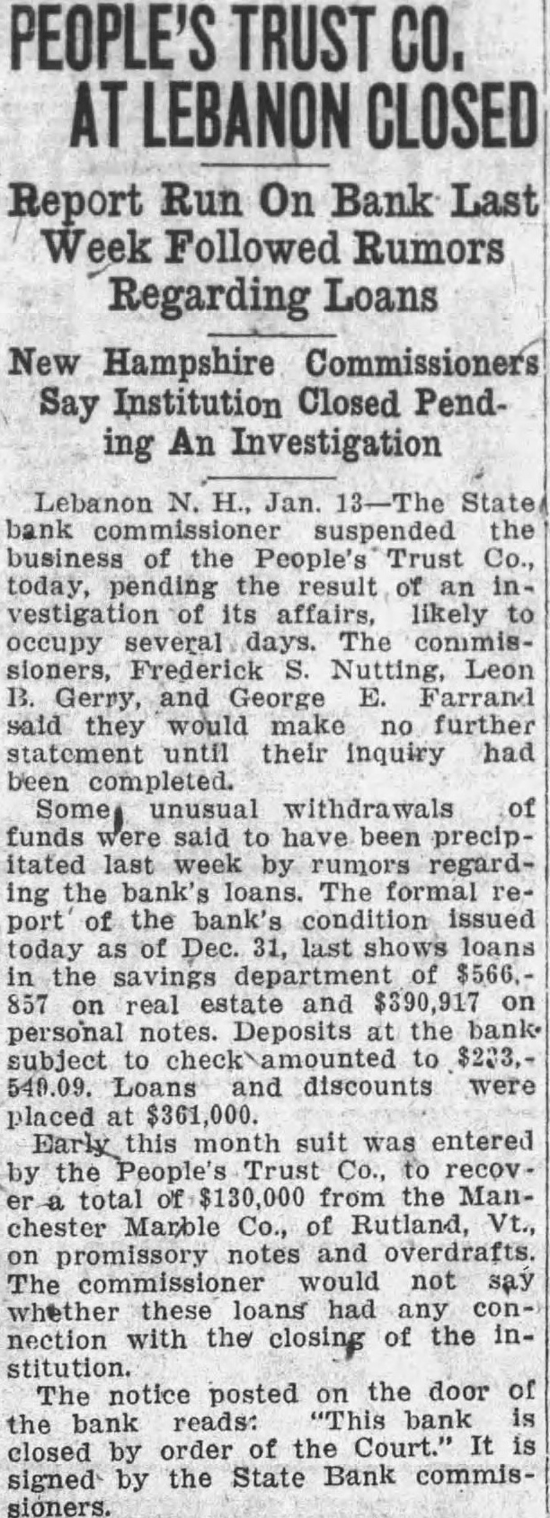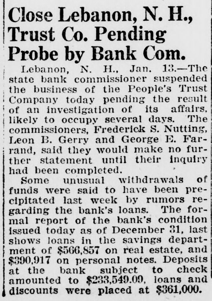 Close Lebanon, N. H., Trust Co. Pending Probe by Bank Com. Lebanon, N. H., Jan. 13.-The state bank commissioner suspended the business of the People's Trust Company today pending the result of an investigation of its affairs, likely to occupy several days. The commissioners, Frederick S. Nutting, Leon B. Gerry and George E. Farrand, said they would make no further statement until their inquiry had been completed. Some unusual withdrawals of funds were said to have been precipitated last week by rumors regarding the bank's loans. The formal report of the bank's condition issued today as of December 31, last shows loans in the savings department of $566,857 on real estate, and $390,917 on personal notes. Deposits at the bank subject to check amounted to $233,549.09, loans and discounts were placed at $361,000.