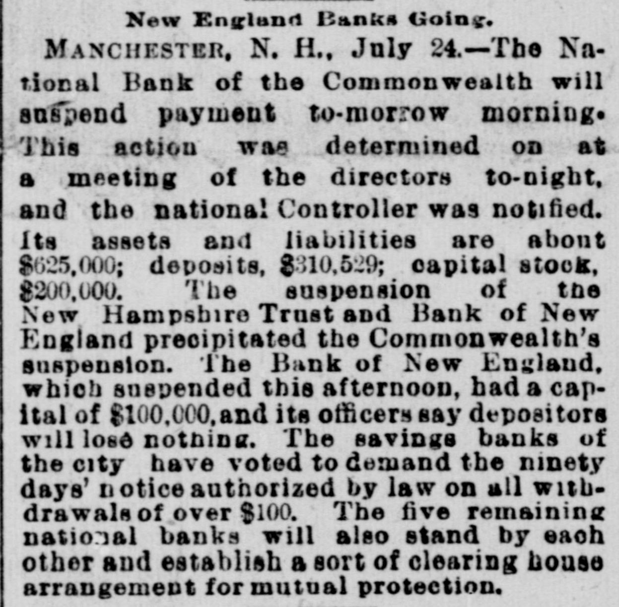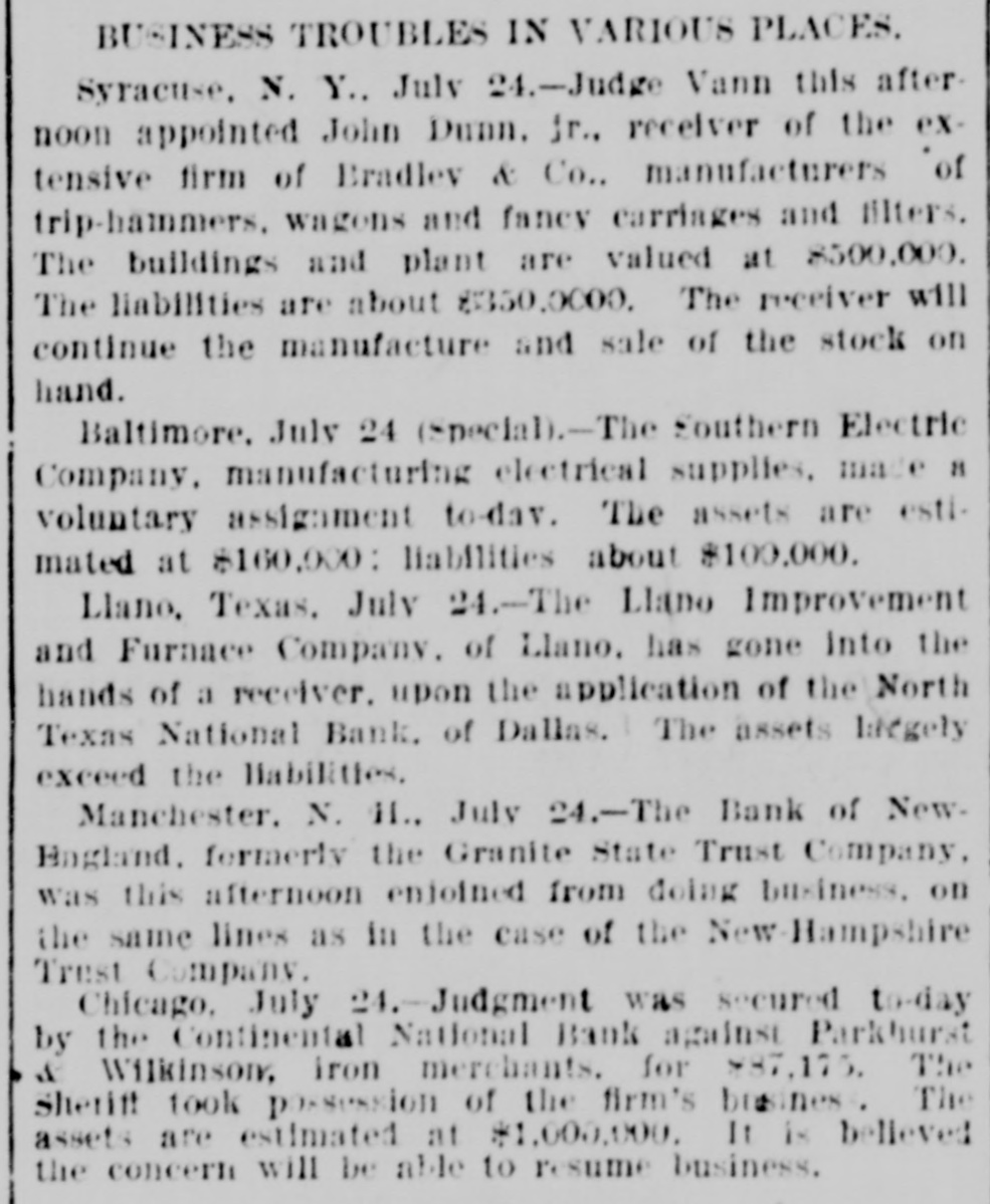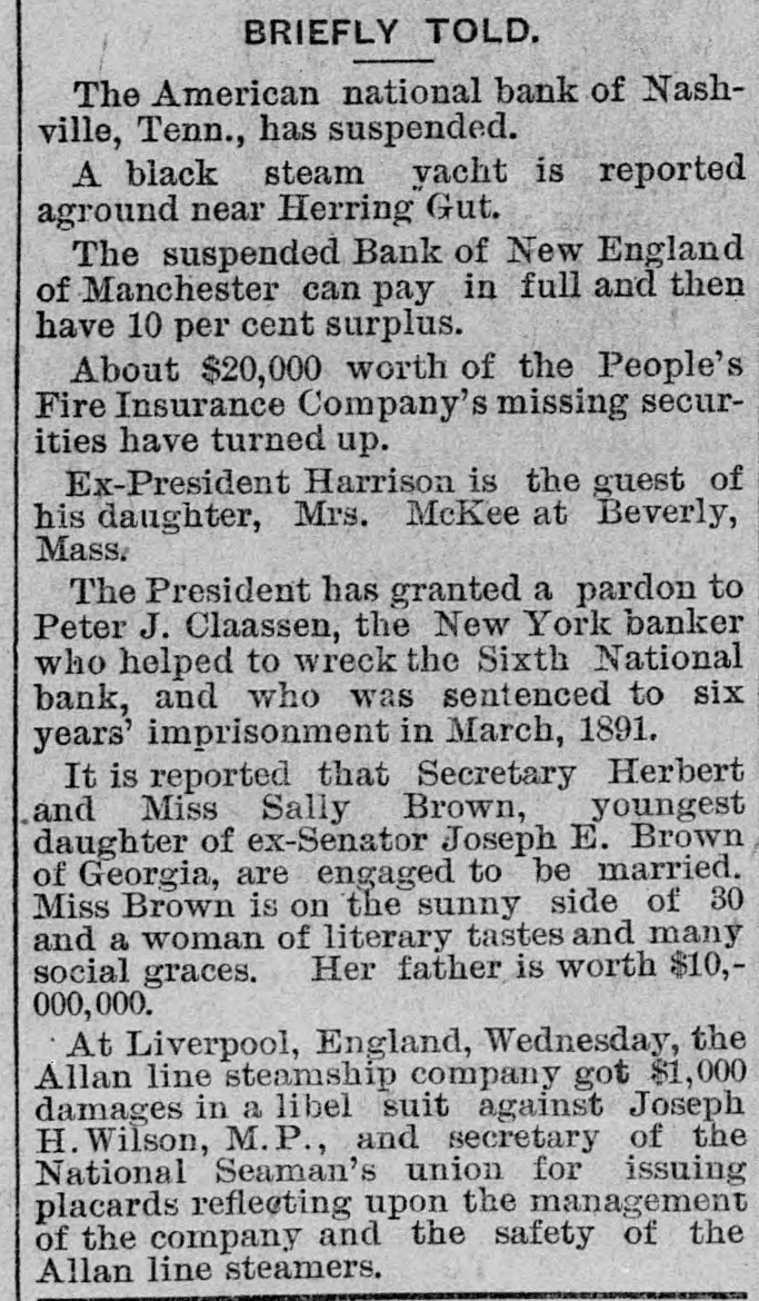 LATER. THE Forest and Dean mines near Highland Falls, N. Y., which had been in operation continuously for a hundred years, closed down for an indefinite period. SEVENTY guards in camp at Seagirt, N. J., were poisoned by drinking from cups washed in oxalic acid. A PIRATICAL outbreak occurred among the Achinez passengers on board the Dutch steamer Rajah Kongsee, trading on the eastern coast of Achon, and the Achinez killed the English captain, mate and twenty-two of the Asiatic sailors. DURING a gale at Buzzard's Bay, Mass., a yacht was capsized and six persons were drowned. THE Plainview (Neb.) State bank was robbed of $3,000 in cash, and in consequence the bank did not open its doors. THE extensive manufacturing firm of Bradley & Co. at Syracuse, N. Y., went into a receiver's hands with liabilities of $350,000. A SEVERE cyclone passed over the little town of Cale, I. T., destroying houses, barns, and everything in its path. FROM twenty to thirty Chinamen are said to enter the United States nightly via the Mexican border. A BLAZE in the Ohio Transfer & Storage company building at Columbus, O., destroyed the plant. Loss, $300,000. THREE boys and a man were killed by the explosion of a powder house near Huntington, Ind. BANK failures were reported as follows: The First national at Orlando, Fla., Tacoma national at Tacoma, Wash., City national at Louisville, Ky., Citizens at Connersville, Ind., Taylor county at Medford, Wis., and the National bank of the commonwealth and Bank of New England at Manchester, N. H. THE two hundredth anniversary of the birth of the city of Detroit, Mich., was celebrated. GAUDAUR defeated Hanlan in the boat race at Toronto, Ont., for the world's championship. DIRECTOR GENERAL DAVIS, President Higinbotham, Commissioner St. Clair, Commissioner Massey and Director C. H. Schwab were served with a notice to appear in court before Judge Stein in Chicago to show cause why they should not be attached for contempt of court in not opening the gates of the exposition on Sunday in violation of the injunction against closing issued in the Clingman case.
