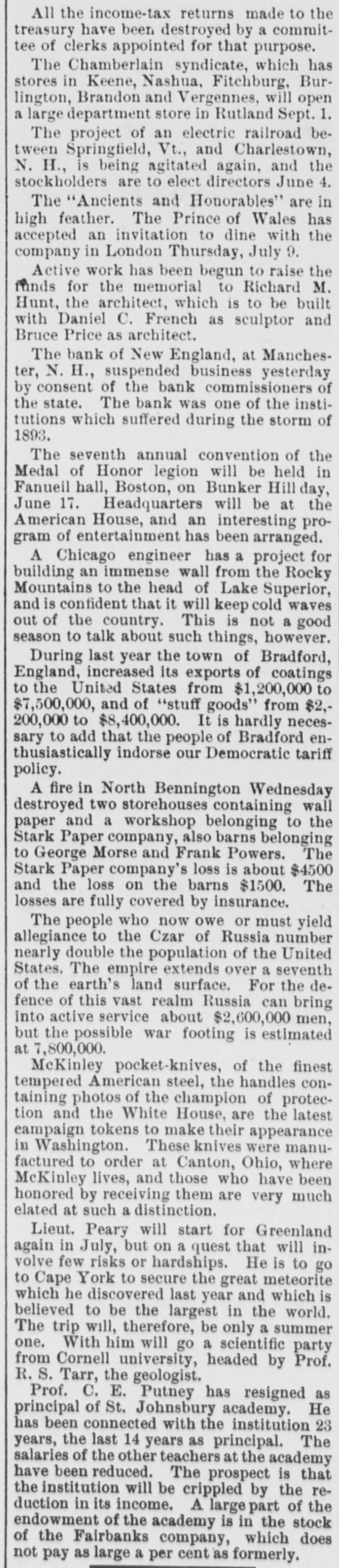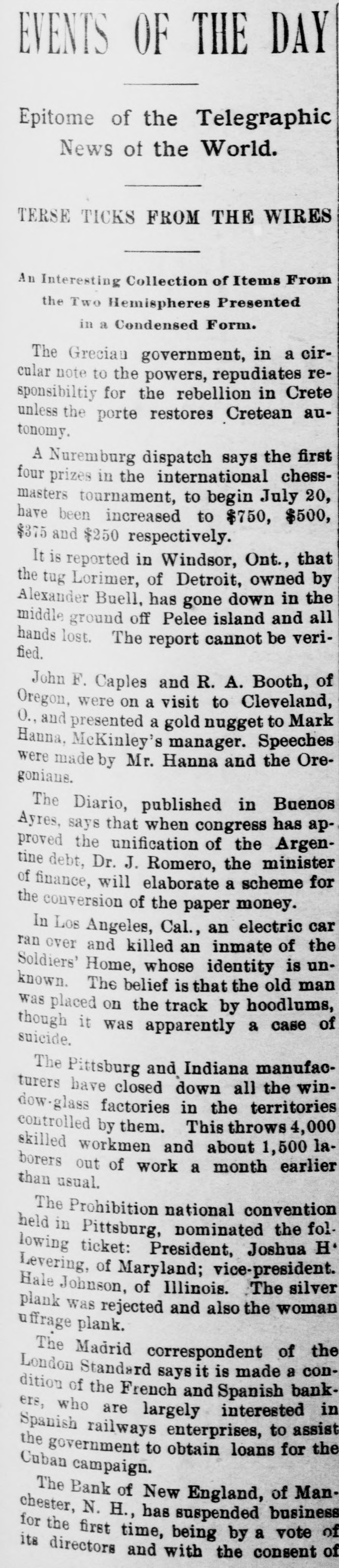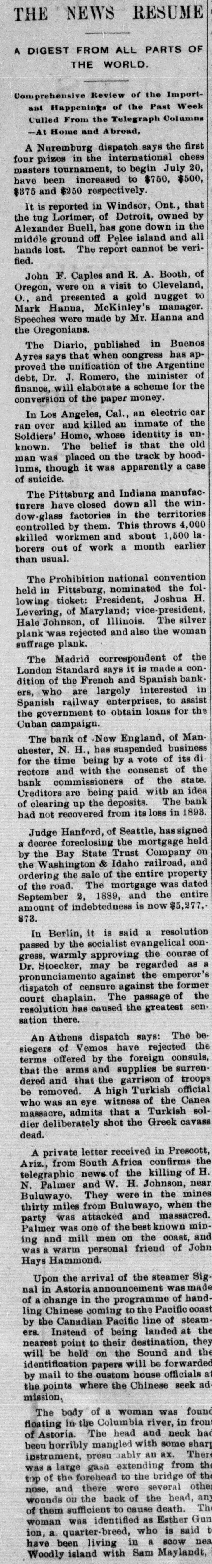 THE NEWS RESUME A DIGEST FROM ALL PARTS OF THE WORLD. Comprehensive Review of the Import- Week ant Happening* of the Past Culled From the Telegraph Columns -At Home and Abroad. Nuremburg dispatch says the chess first A prizes in the international 20, masters four tournament, to begin July $500, have been increased to $750, $375 and $250 respectively. It is reported in Windsor, Ont., owned that by Lorimer, of Detroit, in the Alexander the tug Buell, has gone down and all ground off Pelee island be verihands middle lost. The report cannot fied. F. Caples and R. A. Cleveland, Booth, of John were on a visit to to Oregon, and presented a gold nugget manager. O., Hanna, McKinley's and Speeches Mark were made by Mr. Hanna the Oregonians Diario, published in has Buenos apThe says that when congress Argentine Ayres the unification of the minister of proved Dr. J. Romero, the for the finance, debt, will elaborate a scheme conversion of the paper money. Los Angeles, Cal., an electric of car the In and killed an inmate is unran Soldiers' over Home, whose identity the old The belief is that hoodknown. was placed on the track by case man lums, though it was apparently a of suicide. Pittsburg and Indiana manufac- the winThe have closed down all territories turers factories in the 4,000 controlled dow-glass by them. This throws laworkmen and about 1,500 earlier skilled borers out of work a month than usual. Prohibition national convention the folThe Pittsburg, nominated H. held in ticket: President, Joshua Levering, lowing of Maryland; vice-president, The silver Johnson, of Illinois. the woman plank Hale was rejected and also suffrage plank. Madrid correspondent of a con- the The Standard says it is made bankLondon of the French and Spanish interested in dition who are largely to assist ers, railway enterprises, for the the Spanish government to obtain loans Cuban campaign. bank of New England, business of Man The N. H., has suspended of its di chester, time being by a vote of the for the and with the consenst state rectors commissioners of with the an idea bank are being paid The bank Creditors up the deposits. in 1893. of had clearing not recovered from its loss Hanford, of Seattle, has signed held Judge foreclosing the mortgage on 8 decree Bay State Trust railroad, Company and by the Washington & Idaho property the the sale of the entire was dated ordering the road. The mortgage the entire 873. September of amount of indebtedness 2, 1889, and is now $5,277, In Berlin, it is said evangelical a resolution conby the socialist course passed warmly approving regarded the as against gress, Dr. Stoecker, may be the emperor's pronunciamento of censure against the of former the dispatch chaplain. The passage senresolution court has caused the greatest sation there. Athens dispatch says: The the be An of Vemos have rejected consuls, siegers offered by the foreign be surrenterms arms and supplies of troops that the and that the garrison official dered be removed. A witness high Turkish of the Canea solwho was an admits eye that a Turkish cavass dead. dier massacre, deliberately shot the Greek A private letter received Africa confirms in Prescott, the Ariz., from South of the killing of H. news H. Johnson, N. They were in the telegraphic Palmer and W. the when mines near Buluwayo. miles from Buluwayo, massacred. thirty was attacked and known minparty was one of the best coast, and Palmer men on the John was ing a and warm mill personal friend of Hays Hammond. nal the arrival of the steamer smade Sig Upon in Astoria announcement programme of hand of a change in coming the to the Pacific steamling Chinese Canadian Pacific line landed of at the by the Instead of being they ers. point to their destination, and the nearest be held on the Sound forwarded will identification papers will be officials the oustom house seek ad by the mail points to where the Chinese mission. body of a woman was in found front floating The in the Columbia head and river, neck had mangled with some There been of Astoria. horribly presu The lably an ax. from sharp the instrument, gash extending of th was of a large the forehead to the several bridge other top and there were head, an nose, the back of the Th them identified as said wounds of on sufficient was to cause death. Esther is Gun ion, living woman a quarter-breed, in who a 800W nea t have Woodly been island with Sam Maylandt,