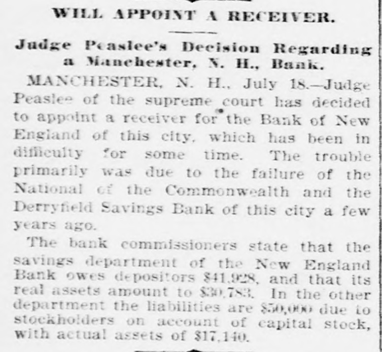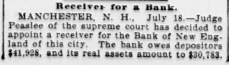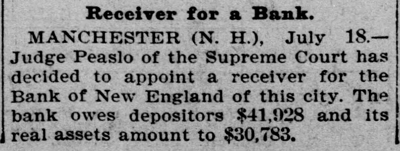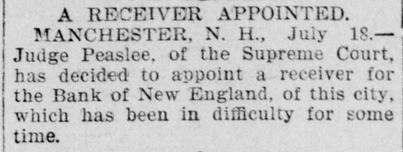 George I. McAllister has been appointed receiver of the Bank of New England of Manchester, N. H.
