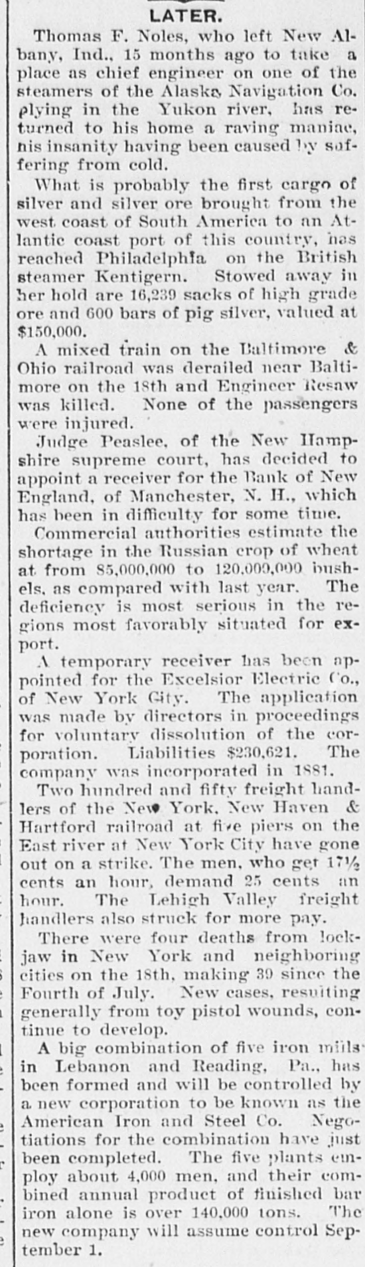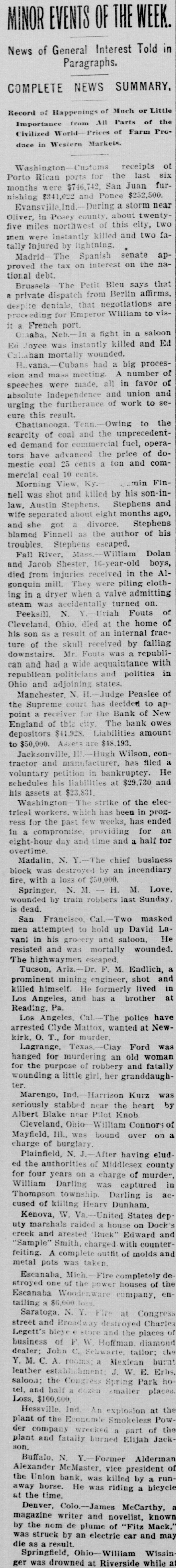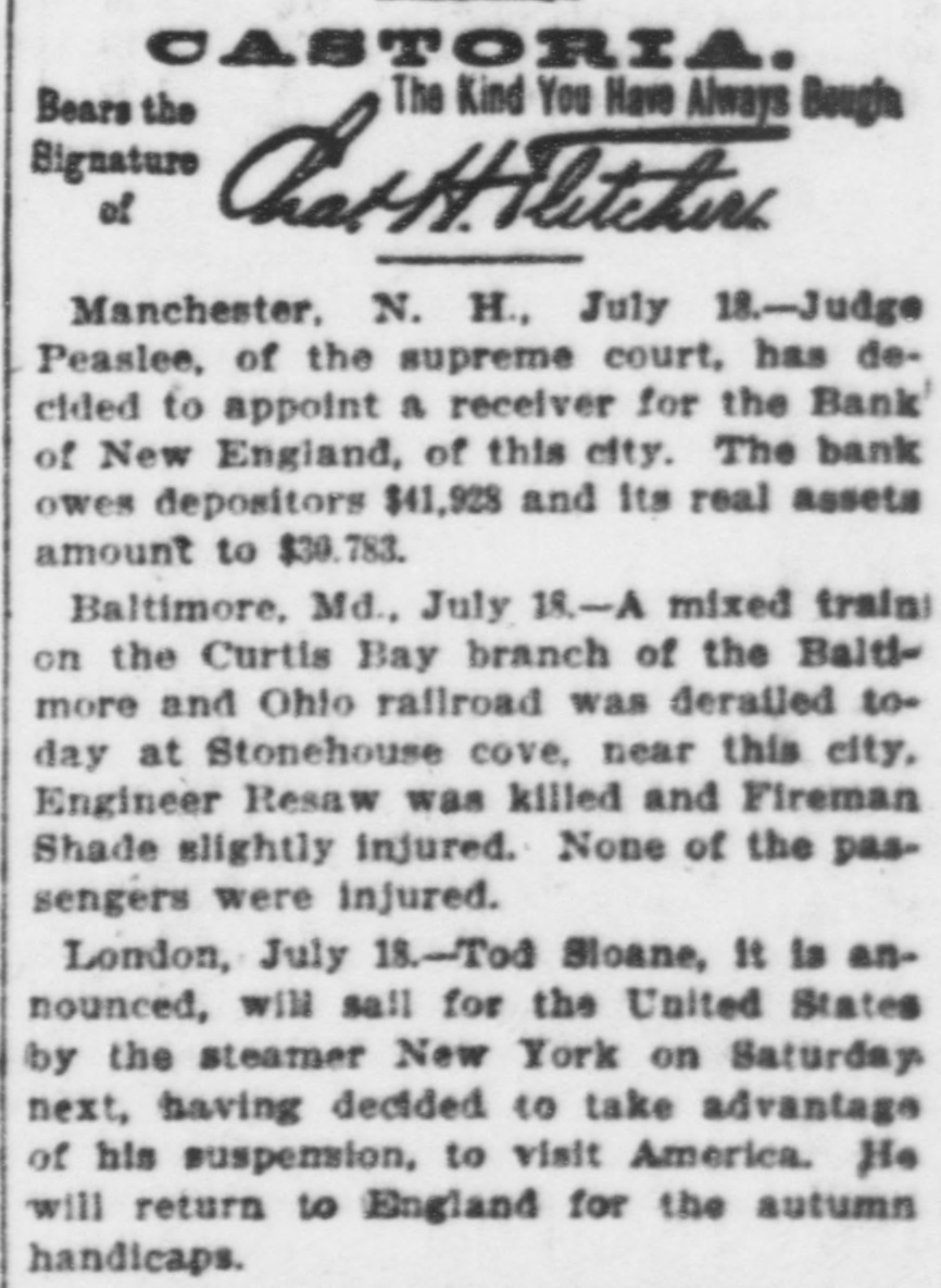 John Duffy, 3 years old, swallowed a small steel collar button at Olneyville, R. I., and was strangled.