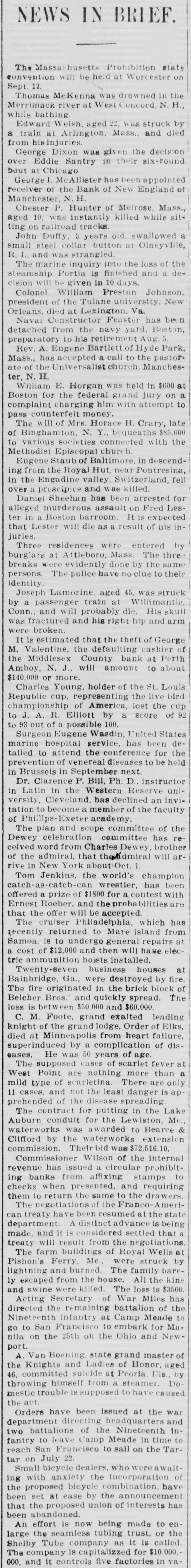 Thomas McKenna was drowned in the Merrimack river at West Concord, N. H., while bathing.