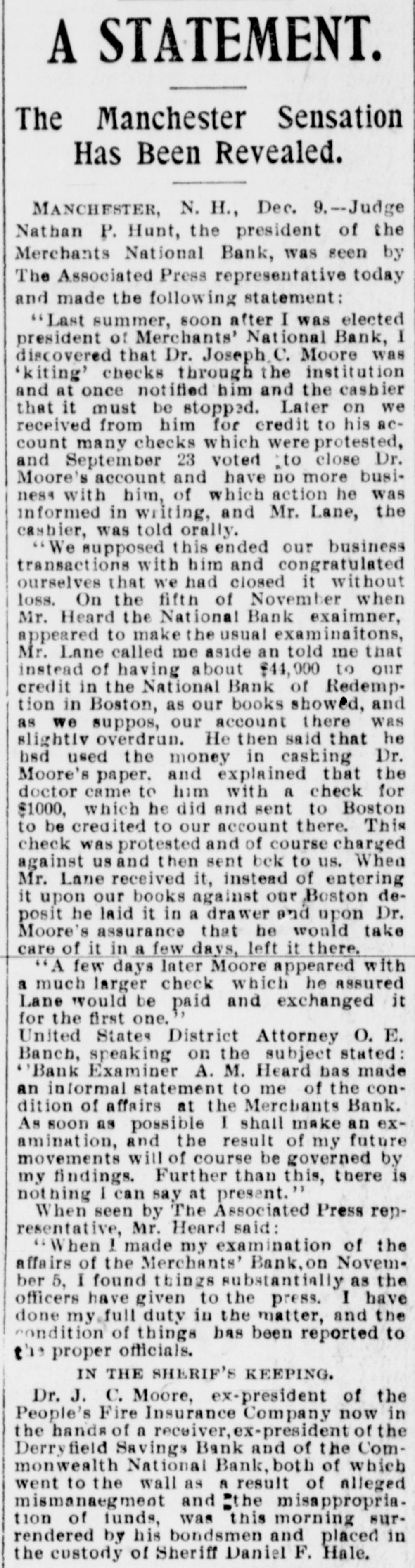 A STATEMENT. The Manchester Sensation Has Been Revealed. MANCHESTER, N. H., Dec. 9.-Judge Nathan P. Hunt, the president of the Merchants National Bank, was seen by The Associated Press representative today and made the following statement: "Last summer, soon after I was elected president of Merchants' National Bank, I discovered that Dr. Joseph C. Moore was 'kiting' checks through the institution and at once notified him and the cashier that it must be stopped. Later on we received from him for credit to his account many checks which were protested, and September 23 voted :to close Dr. Moore's account and have no more business with him, of which action he was informed in writing, and Mr. Lane, the cashier, was told orally. We supposed this ended our business transactions with him and congratulated ourselves that we had closed it without loss. On the fifth of November when Mr. Heard the National Bank exaimner, appeared to make the usual examinaitons, Mr. Lane called me aside an told me that instead of having about $44,000 to our credit in the National Bank of Redemption in Boston, as our books showed, and as we suppos, our account there was slightiv overdrun. He then said that he bsd used the money in cashing Dr. Moore's paper. and explained that the doctor came to him with a check for $1000, which he did and sent to Boston to be credited to our account there. This check was protested and of course charged against usand then sent bek to us. When Mr. Lane received it, instead of entering it upon our books against our Boston deposit he laid it in a drawer and upon Dr. Moore's assurance that be would take care of it in a few days, left it there. "A few days later Moore appeared with a much larger check which he assured Lane would be paid and exchanged it for the first one. United States District Attorney O. E. Banch, speaking on the subject stated: ''Bank Examiner A. M. Heard has made an informal statement to me of the condition of affairs at the Merchants Bank. As soon as possible I shall make an examination, and the result of my future movements will of course be governed by my findings. Further than this, there is nothing I can say at present." When seen by The Associated Press renresentative, Mr. Heard said: "When 1 made my examination of the affairs of the Merchants' Bank, on November 5, I found things substantially as the officers have given to the press. I have done my full duty in the matter, and the condition of things has been reported to the proper officials. IN THE SHERIF'S KEEPING. Dr. J. C. Moore, ex-president of the People's Fire Insurance Company now in the hands of a receiver, ex-president of the Derryfield Savings Bank and of the Commonwealth National Bank, both of which went to the wall as a result of alleged mismanaegment and "the misappropria. tion of funds, was this morning surrendered by his bondsmen and placed in the custody of Sheriff Daniel F. Hale.