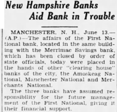 New Hampshire Banks Aid Bank in Trouble MANCHESTER N. June affairs of the First National bank. located in the same building with the Merrimac Savings bank which been closed by order of state officials. today were placed the hands other "clearing house' banks the city, the Amoskeag National. Manchester National and Merchants National The three banks have assumed responsibility for future management the First National, giving their financial support.