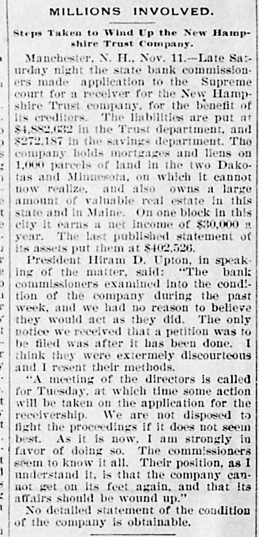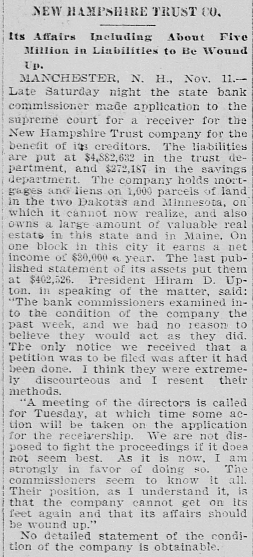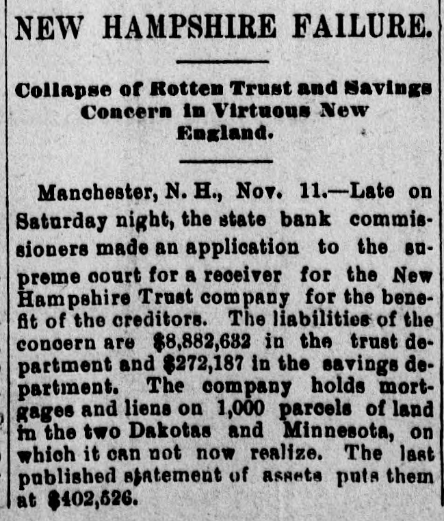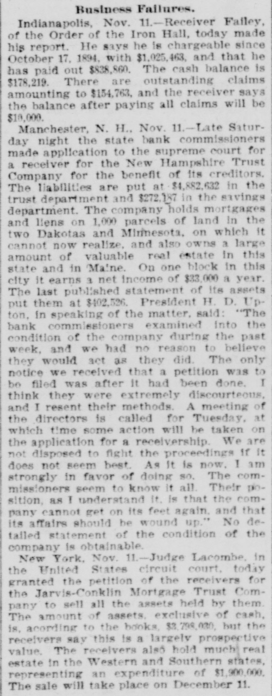 Business Failures. Indianapolis, Nov. 11.-Receiver Failey, of the Order of the Iron Hall, today made his report. He says he is chargeable since October 17, 1894, with $1,025,463. and that he has paid out $838,860. The cash balance is $178,219. There are outstanding claims amounting to $154,763, and the receiver says the balance after paying all claims will be $10,000. Manchester, N. H., Nov. 1.-Late Saturday night the state bank commissioners made application to the supreme court for a receiver for the New Hampshire Trust Company for the benefit of its creditors. The liabilities are put at $4,882,632 in the trust department and $272,187 in the savings department. The company holds mortgages and liens on 1,000 parcels of land in the two Dakotas and Minnesota, on which it cannot now realize, and also owns a large amount of valuable real estate in this state and in Maine. On one block in this city it earns 3 net income of $33,000 a year. The last published statement of its assets put them at $402,526. President H. D. Upton, in speaking of the matter, said: "The bank commissioners examined into the condition of the company during the past week, and we had no reason to believe they would act as they did. The only notice we received that a petition was to be filed was after it had been done. I think they were extremely discourteous, and I resent their methods. A meeting of the directors is called for Tuesday, at which time some action will he taken on the application for a receivership. We are not disposed to fight the proceedings If It does not seem best. As It is now. I am strongly in favor of doing so. The commissioners seem to know it all. Their pisition, as I understand it. is that the company cannot get on its feet again. and that its affairs should be wound up." No detailed statement of the condition of the company is obtainable. New York, Nov. 11.-Judge Lacombe, in the United States circuit court, today granted the petition of the receivers for the Jarvis-Conklin Mortgage Trust Company to sell all the assets held by them. The amount of assets. exclusive of cash, is, acording to the books, $3,798,030, but the receivers say this is a largely prospective value. The receivers also hold much real estate in the Western and Southern states, representing an expenditure of $1,900,000. The sale will take place on December 11.