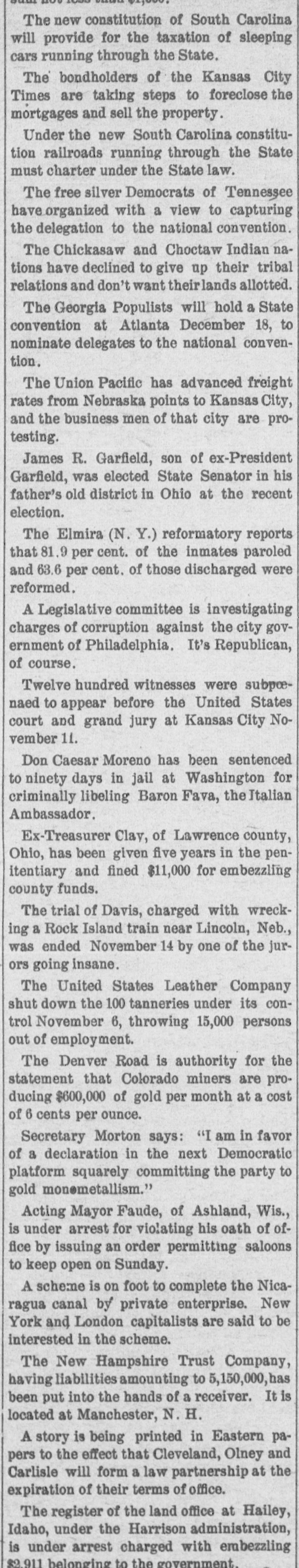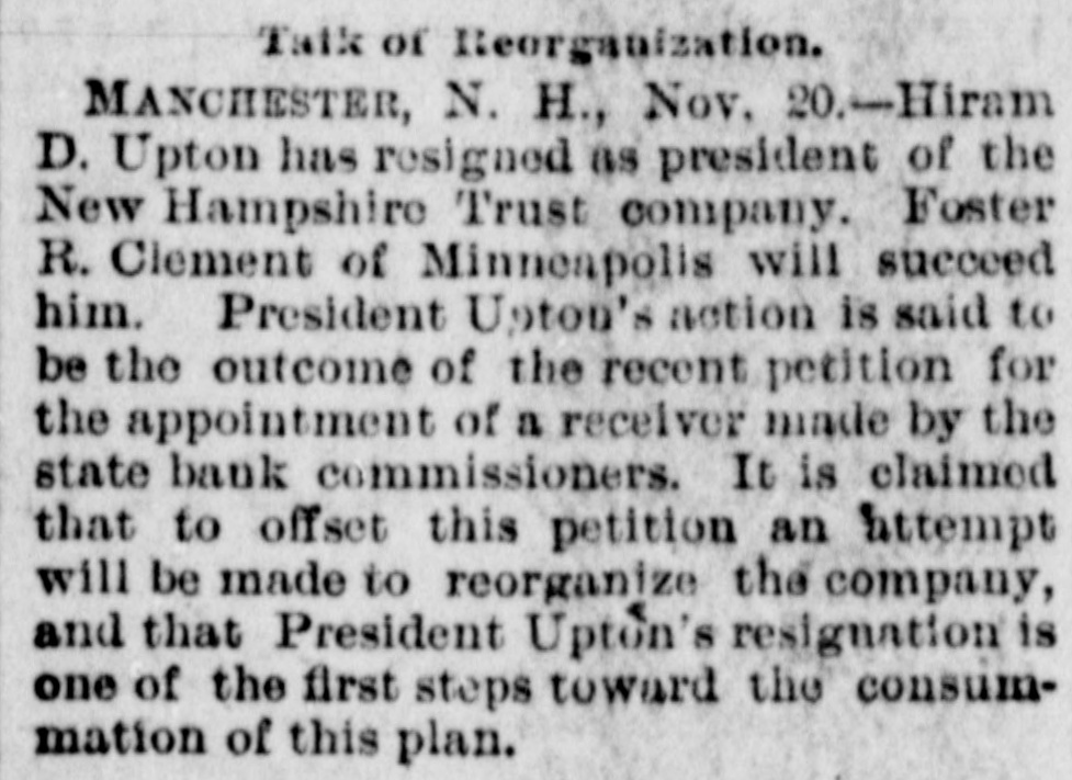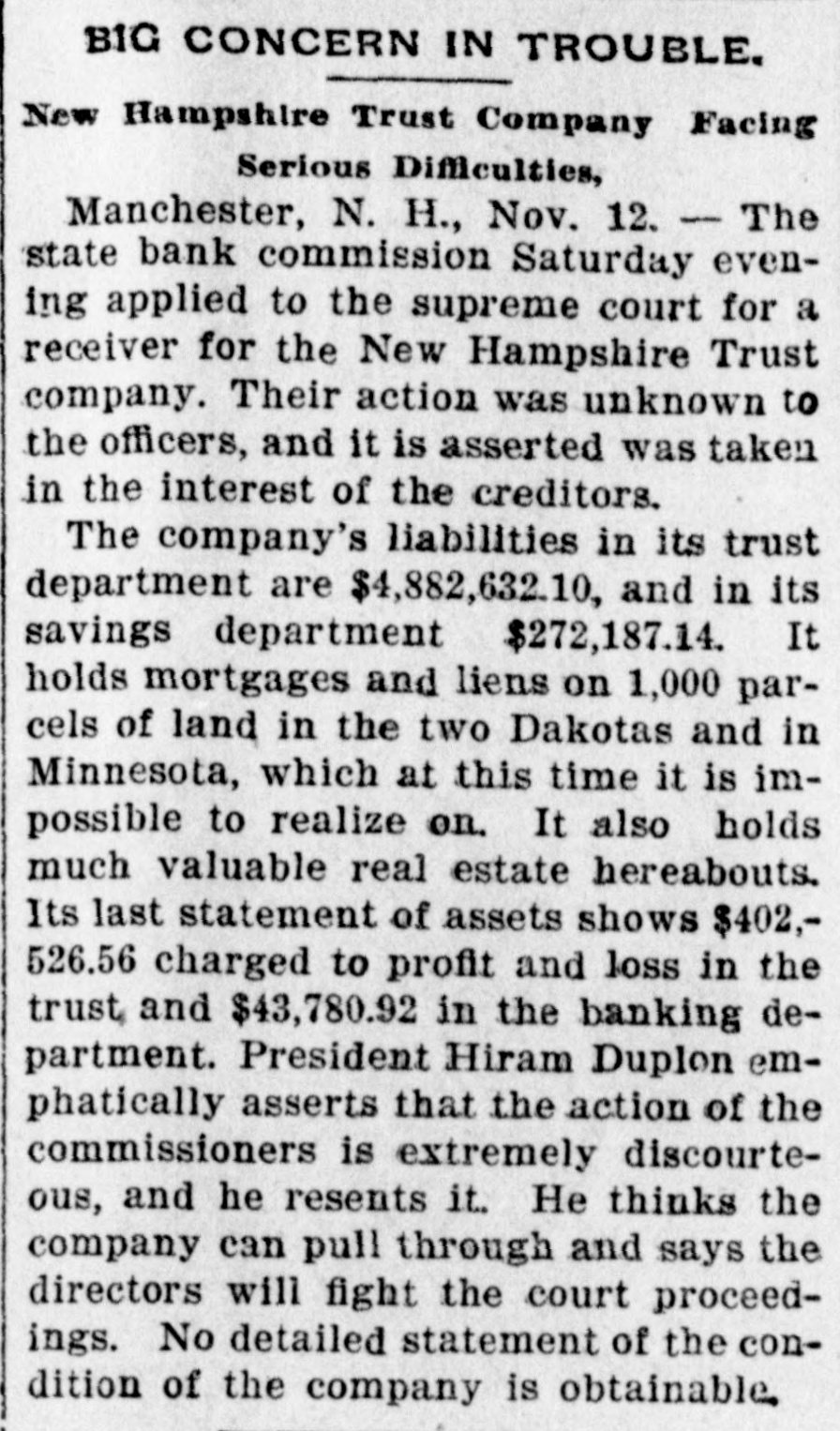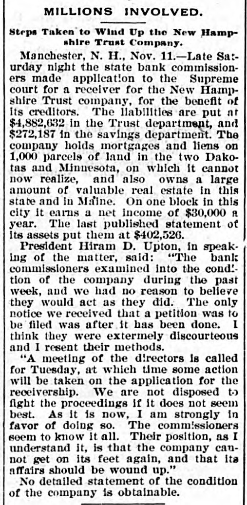 Business Failures. Indianapolis, Nov. 11.-Receiver Failey, of the Order of the Iron Hall, today made his report. He says he is chargeable since October 17, 1894, with $1,025,463. and that he has paid out $838,860. The cash balance is $178,219. There are outstanding claims amounting to $154,763, and the receiver says the balance after paying all claims will be $10,000. Manchester, N. H., Nov. 1.-Late Saturday night the state bank commissioners made application to the supreme court for a receiver for the New Hampshire Trust Company for the benefit of its creditors. The liabilities are put at $4,882,632 in the trust department and $272,187 in the savings department. The company holds mortgages and liens on 1,000 parcels of land in the two Dakotas and Minnesota, on which it cannot now realize, and also owns a large amount of valuable real estate in this state and in Maine. On one block in this city it earns 3 net income of $33,000 a year. The last published statement of its assets put them at $402,526. President H. D. Upton, in speaking of the matter, said: "The bank commissioners examined into the condition of the company during the past week, and we had no reason to believe they would act as they did. The only notice we received that a petition was to be filed was after it had been done. I think they were extremely discourteous, and I resent their methods. A meeting of the directors is called for Tuesday, at which time some action will he taken on the application for a receivership. We are not disposed to fight the proceedings If It does not seem best. As It is now. I am strongly in favor of doing so. The commissioners seem to know it all. Their pisition, as I understand it. is that the company cannot get on its feet again. and that its affairs should be wound up." No detailed statement of the condition of the company is obtainable. New York, Nov. 11.-Judge Lacombe, in the United States circuit court, today granted the petition of the receivers for the Jarvis-Conklin Mortgage Trust Company to sell all the assets held by them. The amount of assets. exclusive of cash, is, acording to the books, $3,798,030, but the receivers say this is a largely prospective value. The receivers also hold much real estate in the Western and Southern states, representing an expenditure of $1,900,000. The sale will take place on December 11.