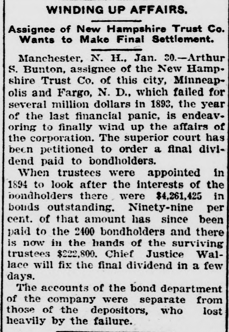 WINDING UP AFFAIRS. Assignee of New Hampshire Trust Co. Wants to Make Final Settlement. Manchester, N. H., Jan. 30.-Arthur S. Bunton, assignee of the New Hampshire Trust Co. of this city, Minneapolis and Fargo, N. D., which failed for several million dollars in 1893, the year of the last financial panic, is endeavoring to finally wind up the affairs of the corporation. The superior court has been petitioned to order a final dividend paid to bondholders. When trustees were appointed in 1894 to look after the interests of the bondholders there were $4,261,425 in bonds outstanding. Ninety-nine per cent. of that amount has since been paid to the 2400 bondholders and there is now in the hands of the surviving trustees $222,800. Chief Justice Wallace will fix the final dividend in a few days. The accounts of the bond department of the company were separate from those of the depositors, who lost heavily by the failure.