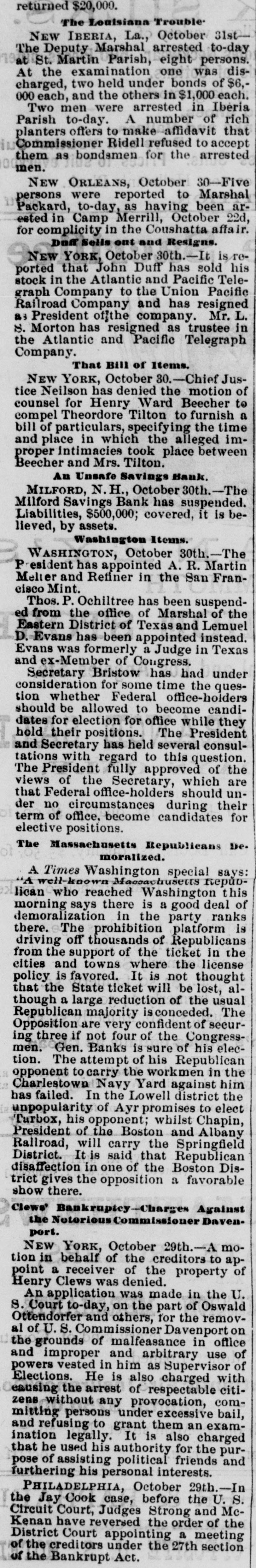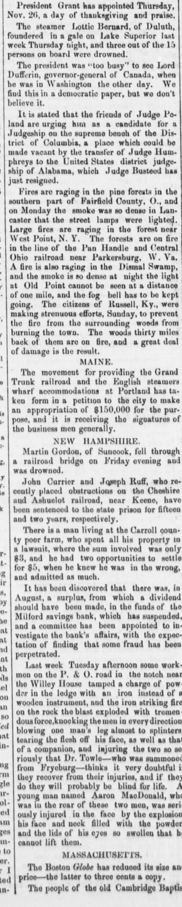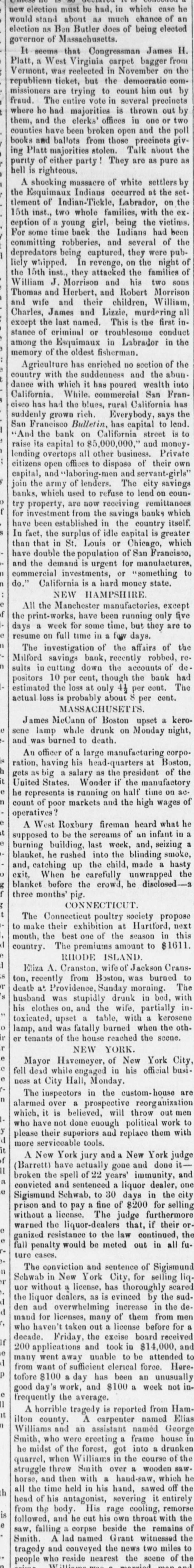 new election must be had, in which case he an would stand about as much chance of election as Ben Butler does of being elected governor of Massachusetts. It seems that Congressman James H. Platt, a West Virginia carpet bagger from Vermont was reelected in November on the republican ticket, but the democratic commissioners are trying to count him out by fraud. The entire vote in several precincts where he had majorities is thrown out by them, and the clerks' offices in one or two counties have been broken open and the poll books and ballots from those precincts giving Platt majorities stolen. Talk about the purity of either party! They are as pure hell is righteous. A shocking massacre of white settlers by the Esquimaux Indians occurred at the set. tlement of Indian-Tiekle, Labrador, on the 15th inst., two whole families, with the ex. ception of young girl, being the victims. For some time back the Indians had been committing robberies, and several of the depredators being captured they were pubwhipped. In revenge, on the night of the 15th inst., they attacked the families of William J. Morrison and his two SODS Thomas and Herbert, and Robert Morrison and wife and their children, William Charles, James and Lizzie, murdering all except the last named. This is the first in. stance of criminal or troublesome conduct among the Esquimaux in Labrador in the memory of the oldest fisherman. Agriculture has enriched no section of the country with the suddenness and the abun. dance with which it has poured wealth into California. While. commercial San Francisco has had the blues, rural California has suddenly grown rich, Everybody, says the San Francisco Bulletin, has capital to lend 'And the bank on California street to raise its capital to $5,000,000, and money. lending overtops all other business. Private citizens open offices to dispose of their own capital, and "laboring-men and servant-girls' join the army of lenders. The city savings banks, which used to refuse to lend on coun. try property, are now receiving remittances for investment from the savings banks which have been established in the country itself. In fact. the surplus of idle capital is greater than that in St. Louis or Chicago, which have double the population of San Francisco, and the demand is urgent for manufactures commercial investments, or "something to do. California is hard money state, NEW HAMPSHIRE All the Manchester manufactories, except the print-works, have been running only five days a week for some time, but they are to resume on full time in a for days. The investigation of the affairs of the Milford savings bank, recently robbed, re sults in cutting down the accounts of de positors 10 per cent, though the bank had estimated the loss at only 41 per cent. The actual loss is probably about 8 per cent. MASSACHUSETTS. James McCann of Boston upset a kero sene lamp while drunk on Monday night, and was burned to death. An officer of a large manufacturing corpo ration, having his head-quarters at Boston gets big salary as the president of the United States. Wonder if the manufactory he represents is running on half time on count of poor markets and the high wages of operatives? A West Roxbury fireman heard what he supposed to be the screams of an infant in burning building, last week, and, seizing blanket, he rushed into the blinding smoke, and, catching up the child, made a hasty exit. When he carefully unwrapped the blanket before the crowd, he disclosed three months' pig. CONNECTICUT. The Connecticut poultry society propose to make their exhibition at Hartford, next month, the best one of the season in this country. The premiums amount to $1611. RHODE ISLAND Eliza A. Cranston, wife of Jackson Cranston, recently from Boston, was burned to death at Providence, Sunday morning. The husband was stupidly drunk in bed, with his clothes on, and the wife, partially in toxicated, upset a table, with a kerosene lamp, and was fatally burned when the oth. er tenants of the house reached the scene. NEW YORK. Mayor Havemeyer, of New York City fell dead while engaged in his official business at City Hall, Monday. are The inspectors in the custom-house alarmed over a prospective reorganization which, it is believed, will throw out men who have not done enough political work to please their superiors and replace them with more serviceable tools. A New York jury and a New York judge (Barrett) have actually gone and done broken the spell of 22 years' immunity, and convicted and sentenced a liquor dealer, one Sigismund Schwab, to 30 days in the city prison and to pay fine of $200 for selling without a license, The judge furthermore warned the liquor-dealers that, if their ganized resistance to the law continued. the full penalty would be meted out in all future cases, The conviction and sentence of Sigismund Schwab in New York City, for selling liq uor without license, has thoroughly scared the liquor dealers, as is evinced by the sud. den and overwhelming increase in the de. mand for licenses, many of them from men who haven't taken out a license before for If decade. Friday, the excise board received 200 applications and took in $14,000, and many went away uuable to be attended from want of sufficient clerical force. Here. tofore $100 day has been an unusually good day's work, and $100 a week not infrequently the average. A horrible tragedy is reported from Ham ilton county. A carpenter named Elias Williams and an assistant named George Smith, who were erecting a frame house he midst of the forest, got into a drunken quarrel, when Williams in the course of the struggle throw Smith over a wooden saw horse, and then with a hand-saw, which h all the time held in his hand, sawed off the head of his antagonist, severing it entirely from the body. His rage cooling, remorse followed, and he cut his own throat with the saw, falling corpse beside the remains of Smith. A lad named Grant witnessed the tragedy and conveyed the news two miles to peop