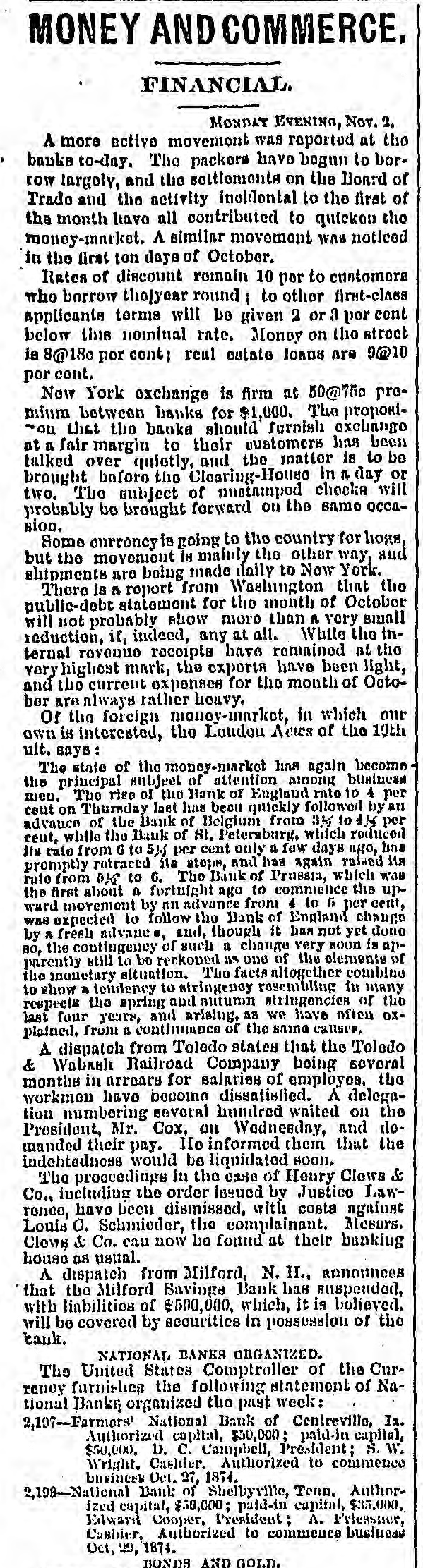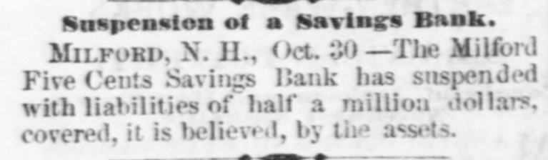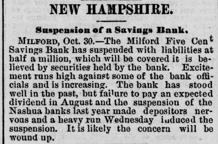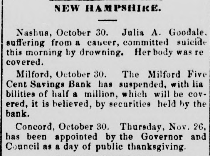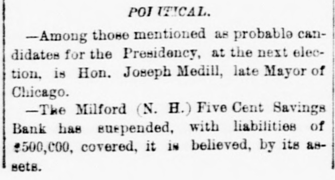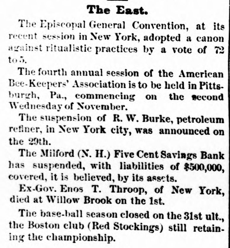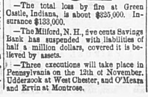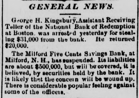 new election must be had, in which case he an would stand about as much chance of election as Ben Butler does of being elected governor of Massachusetts. It seems that Congressman James H. Platt, a West Virginia carpet bagger from Vermont was reelected in November on the republican ticket, but the democratic commissioners are trying to count him out by fraud. The entire vote in several precincts where he had majorities is thrown out by them, and the clerks' offices in one or two counties have been broken open and the poll books and ballots from those precincts giving Platt majorities stolen. Talk about the purity of either party! They are as pure hell is righteous. A shocking massacre of white settlers by the Esquimaux Indians occurred at the set. tlement of Indian-Tiekle, Labrador, on the 15th inst., two whole families, with the ex. ception of young girl, being the victims. For some time back the Indians had been committing robberies, and several of the depredators being captured they were pubwhipped. In revenge, on the night of the 15th inst., they attacked the families of William J. Morrison and his two SODS Thomas and Herbert, and Robert Morrison and wife and their children, William Charles, James and Lizzie, murdering all except the last named. This is the first in. stance of criminal or troublesome conduct among the Esquimaux in Labrador in the memory of the oldest fisherman. Agriculture has enriched no section of the country with the suddenness and the abun. dance with which it has poured wealth into California. While. commercial San Francisco has had the blues, rural California has suddenly grown rich, Everybody, says the San Francisco Bulletin, has capital to lend 'And the bank on California street to raise its capital to $5,000,000, and money. lending overtops all other business. Private citizens open offices to dispose of their own capital, and "laboring-men and servant-girls' join the army of lenders. The city savings banks, which used to refuse to lend on coun. try property, are now receiving remittances for investment from the savings banks which have been established in the country itself. In fact. the surplus of idle capital is greater than that in St. Louis or Chicago, which have double the population of San Francisco, and the demand is urgent for manufactures commercial investments, or "something to do. California is hard money state, NEW HAMPSHIRE All the Manchester manufactories, except the print-works, have been running only five days a week for some time, but they are to resume on full time in a for days. The investigation of the affairs of the Milford savings bank, recently robbed, re sults in cutting down the accounts of de positors 10 per cent, though the bank had estimated the loss at only 41 per cent. The actual loss is probably about 8 per cent. MASSACHUSETTS. James McCann of Boston upset a kero sene lamp while drunk on Monday night, and was burned to death. An officer of a large manufacturing corpo ration, having his head-quarters at Boston gets big salary as the president of the United States. Wonder if the manufactory he represents is running on half time on count of poor markets and the high wages of operatives? A West Roxbury fireman heard what he supposed to be the screams of an infant in burning building, last week, and, seizing blanket, he rushed into the blinding smoke, and, catching up the child, made a hasty exit. When he carefully unwrapped the blanket before the crowd, he disclosed three months' pig. CONNECTICUT. The Connecticut poultry society propose to make their exhibition at Hartford, next month, the best one of the season in this country. The premiums amount to $1611. RHODE ISLAND Eliza A. Cranston, wife of Jackson Cranston, recently from Boston, was burned to death at Providence, Sunday morning. The husband was stupidly drunk in bed, with his clothes on, and the wife, partially in toxicated, upset a table, with a kerosene lamp, and was fatally burned when the oth. er tenants of the house reached the scene. NEW YORK. Mayor Havemeyer, of New York City fell dead while engaged in his official business at City Hall, Monday. are The inspectors in the custom-house alarmed over a prospective reorganization which, it is believed, will throw out men who have not done enough political work to please their superiors and replace them with more serviceable tools. A New York jury and a New York judge (Barrett) have actually gone and done broken the spell of 22 years' immunity, and convicted and sentenced a liquor dealer, one Sigismund Schwab, to 30 days in the city prison and to pay fine of $200 for selling without a license, The judge furthermore warned the liquor-dealers that, if their ganized resistance to the law continued. the full penalty would be meted out in all future cases, The conviction and sentence of Sigismund Schwab in New York City, for selling liq uor without license, has thoroughly scared the liquor dealers, as is evinced by the sud. den and overwhelming increase in the de. mand for licenses, many of them from men who haven't taken out a license before for If decade. Friday, the excise board received 200 applications and took in $14,000, and many went away uuable to be attended from want of sufficient clerical force. Here. tofore $100 day has been an unusually good day's work, and $100 a week not infrequently the average. A horrible tragedy is reported from Ham ilton county. A carpenter named Elias Williams and an assistant named George Smith, who were erecting a frame house he midst of the forest, got into a drunken quarrel, when Williams in the course of the struggle throw Smith over a wooden saw horse, and then with a hand-saw, which h all the time held in his hand, sawed off the head of his antagonist, severing it entirely from the body. His rage cooling, remorse followed, and he cut his own throat with the saw, falling corpse beside the remains of Smith. A lad named Grant witnessed the tragedy and conveyed the news two miles to peop
