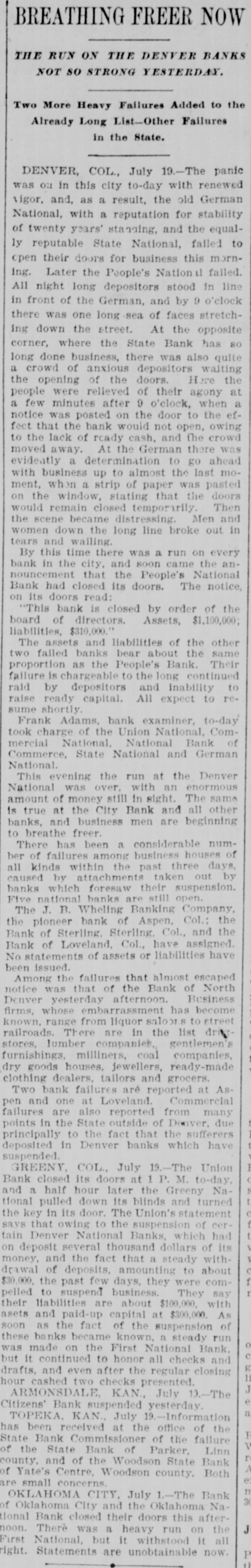 Two More Heavy Failures Added to the Already Long List-Other Failures in the State. DENVER, COL., July 19.-The panic was on in this city to-day with renewed vigor, and, as a result, the old German a for stability of and the National, twenty with years' standing, reputation equally reputable State National, failed to open their doors for business this morning. Later the People's National failed. All night long depositors stood in line in front of the German, and by 9 o'clock there was one long sea of faces stretchthe street. At the ing down opposite corner, where the State Bank has so long done business, there was also quite a crowd of anxious depositors waiting the opening of the doors. Here the people were relieved of their agony at a few minutes after 9 o'clock, when a notice was posted on the door to the effect that the bank would not open, owing to the lack of roady cash, and the crowd moved away. At the German there was evidently a determination to go ahead with business up to almost the last moment, when a strip of paper was pasted on the window, stating that the doors would remain closed temporarily Then the scene became distressing. Men and women down the long line broke out in tears and wailing. By this time there was a run on every bank in the city, and soon came the announcement that the People's National Bank had closed its doors. The notice, on its doors read: "This bank is closed by order of the board of directors. Assets, $1,100,000; liabilities, $310,000. The assets and liabilities of the other two failed banks bear about the same proportion as the People's Bank. Their failure is chargeable to the long continued raid by depositors and inability to raise ready capital. All expect to resume shortly. Adams, bank to-day took of the Union ComFrank charge examiner, National, mercial National, National Bank of Commerce, State National and German National. This the run at the Denver was National evening over. with an enormous amount of still in sight. The same Is true and at money the business City Bank and all other banks, men are beginning to breathe freer. There has been a considerable number of failures among business houses of all kinds within the past three days, caused by attachments taken out by banks which foresaw their suspension. Five national banks are still open. The J. B. Wheling Banking Company, the pioneer bank of Aspen, Col.: the Bank of Sterling Sterling Col., and the Bank of Loveland, Col., have assigned. No statements of assets or liabilities have been issued. Among the failures that almost escaped notice was that of the Bank of North Denver yesterday afternoon. Business firms, whose embarrassment has become known, range from liquor saloors to street ailroads. There are in the list drive tores, lumber companies, gentlemen's furnishings, milliners, coal companies, ry goods houses, jewellers, ready-made lothing dealers, tailors and grocers. Two bank failures are reported at Asen and one at Loveland. Commercial ailures are also reported from many points in the State outside of Denver, due principally to the fact that the sufferers Reposited in Denver banks which have uspended. GREENY, COL., July 19.-The Union Bank closed its doors at 1 P. M. to-day, S nd a half hour later the Greeny Na1 lonal pulled down its blinds and turned ( he key in its door. The Union's statement avs that owing to the suspension of cert n in deposit Denver several National thousand Banks, dollars which of had its honey, and the fact that a steady with( rawal of deposits, amounting to about I $0,000. the past few days, they were comI elled to suspend business. They say heir liabilities are about $100,000. with sets and paid-up capital at $300,000. As oon as the fact of the suspension of hese banks became known, a steady run o as made on the First National Bank, e ut it continued to honor all checks and g rafts, and even after the regular closing II our cashed two checks presented. J ARMONSDALE, KAN., July 13.-The e itizens' Bank suspended yesterday. a TOPEKA, KAN. July 9.-Information as been received at the office of the I tate Bank Commissioner of the failure V e the State Bank of Parker, Linn r ounty, and of the Woodson State Bank A : Yate's Centre, Woodson county. Both e re small concerns n CITY, 1.-The OKLAHOMA July Bank 3 Oklahoma City and the Oklahoma Naonal closed their doors afterJ Bank There heavy run this on on. was a the irst National, but it withstood it all ght Statements are