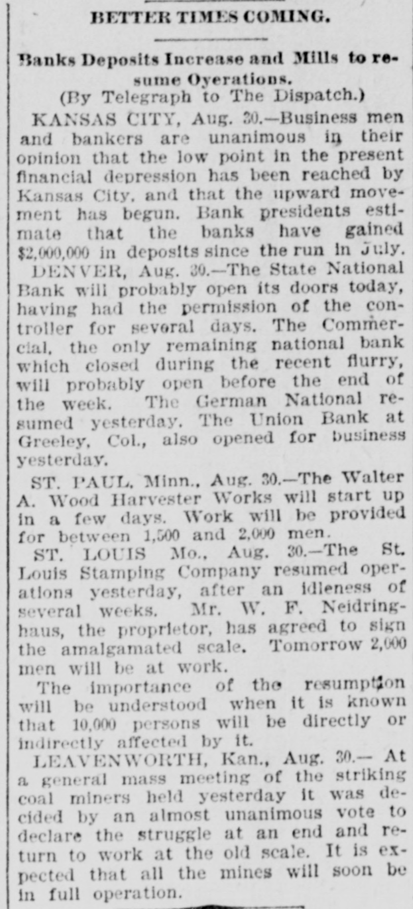 BETTER TIMES COMING. Banks Deposits Increase and Mills to resume Oyerations. (By Telegraph to The Dispatch.) KANSAS CITY, Aug. -Business men and bankers are unanimous in their opinion that the low point in the present financial depression has been reached by Kansas City, and that the upward movement has begun. Bank presidents estimate that the banks have gained $2,000,000 in deposits since the run in July. DENVER, Aug. 30.-The State National Bank will probably open its doors today, having had the permission of the controller for several days. The Commercial, the only remaining national bank which closed during the recent flurry, will probably open before the end of the week. The German National resumed yesterday. The Union Bank at Greeley, Col., also opened for business yesterday. ST. PAUL, Minn., Aug. 30.-The Walter A. Wood Harvester Works will start up in a few days. Work will be provided for between 1,500 and 2,000 men. ST. LOUIS Mo., Aug. 30.-The St. Louis Stamping Company resumed operations yesterday, after an idleness of several weeks. Mr. W. F. Neidringhaus, the proprietor, has agreed to sign the amalgamated scale. Tomorrow 2,000 men will be at work. The importance of the resumption will be understood when it is known that 10,000 persons will be directly or indirectly affected by it. LEAVENWORTH, Kan., Aug. 30.- At a general mass meeting of the striking coal miners held yesterday it was decided by an almost unanimous vote to declare the struggle at an end and return to work at the old scale. It is expected that all the mines will soon be in full operation.