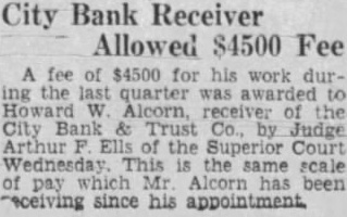 City Bank Receiver Allowed $4500 Fee A fee of $4500 for his work during the last quarter was awarded to Howard W. Alcorn, receiver of the Bank & Trust by Judge Arthur F Ells of the Superior Court Wednesday This is the same scale of pay Mr. Alcorn has been aceiving since his appointment