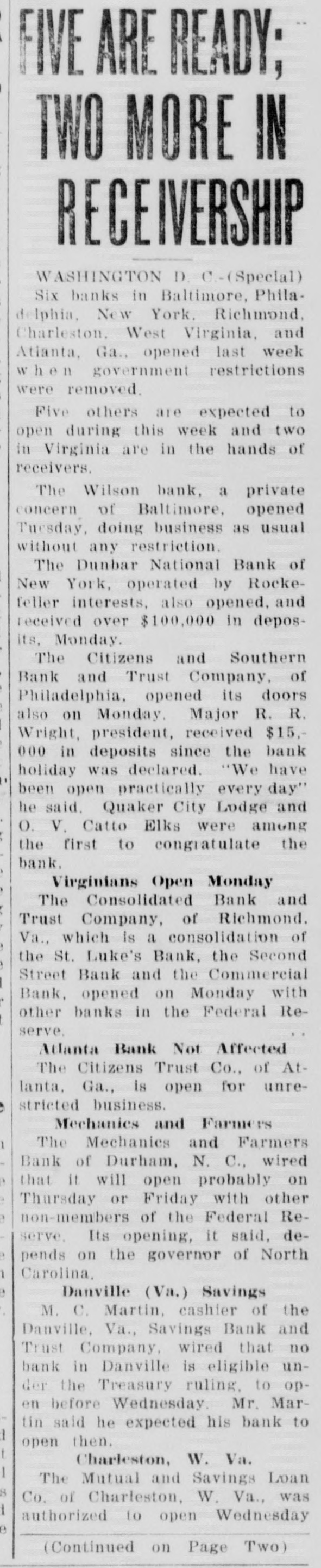 FIVE ARE READY; TWO MORE IN RECEIVERSHIP WASHINGTON D. C.-(Special) Six banks in Baltimore, Philadelphia, New York, Richmond, Charleston, West Virginia, and Atlanta, Ga., opened last week when government restrictions were removed. Five others are expected to open during this week and two in Virginia are in the hands of receivers. The Wilson bank, a private concern of Baltimore, opened Tuesday, doing business as usual without any restriction. The Dunbar National Bank of New York, operated by Rockefeller interests, also opened, and received over $100,000 in deposits. Monday. The Citizens and Southern Bank and Trust Company, of Philadelphia, opened its doors also on Monday. Major R. R. Wright, president, received $15.000 in deposits since the bank holiday was declared. "We have been open practically every day" he said. Quaker City Lodge and O. V. Catto Elks were among the first to congratulate the bank. Virginians Open Monday The Consolidated Bank and Trust Company, of Richmond. Va., which is a consolidation of the St. Luke's Bank, the Second Street Bank and the Commercial Bank, opened on Monday with other banks in the Federal Reserve. Atlanta Bank Not Affected The Citizens Trust Co., of Atlanta, Ga., is open for unrestricted business. Mechanics and Farmers The Mechanics and Farmers Bank of Durham, N. C., wired that it will open probably on Thursday or Friday with other non-members of the Federal Reserve. Its opening, it said, depends on the governor of North Carolina. Danville (Va.) Savings M. C. Martin, cashier of the Danville, Va., Savings Bank and Trust Company, wired that no bank in Danville is eligible under the Treasury ruling, to open before Wednesday. Mr. Martin said he expected his bank to open then. Charleston, W. Va. The Mutual and Savings Loan Co. of Charleston, W. Va., was authorized to open Wednesday (Continued on Page Two)