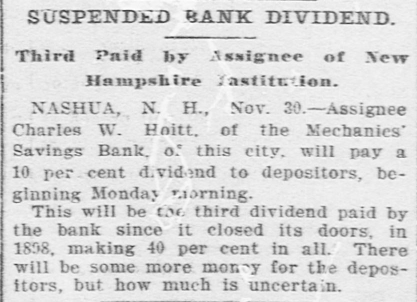 SUSPENDED BANK DIVIDEND. Third Paid by Assignee of New Hampshire Tastitution. NASHUA, N. H., Nov. 30.-Assignee Charles W. Hoitt, of the Mechanies' Savings Bank, of this city, will pay a 10 per cent dividend to depositors, beginning Monday thorning. This will be the third dividend paid by the bank since it closed its doors, in 1898, making 40 per cent in all. There will be some more money for the depositors, but how much is uncertain.