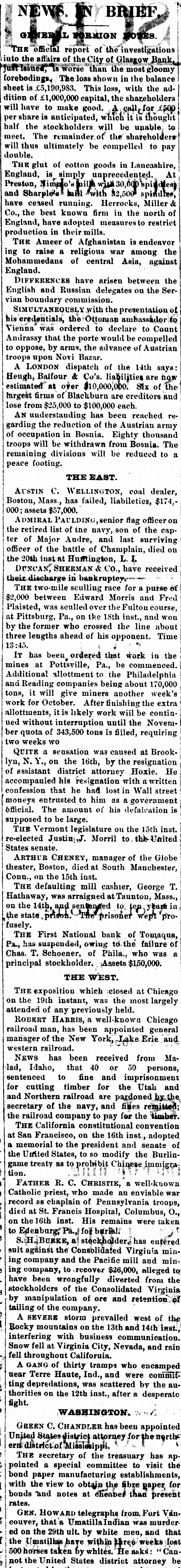 QUITE a sensation was caused at Brooklyn, N. Y., on the 16th, by the resignation of assistant district attorney Hoxie. He accompanied his resignation with a written confession that he had lost in Wall street moneys entrusted to him as a government official. The amount of his defalcation is supposed to be large.