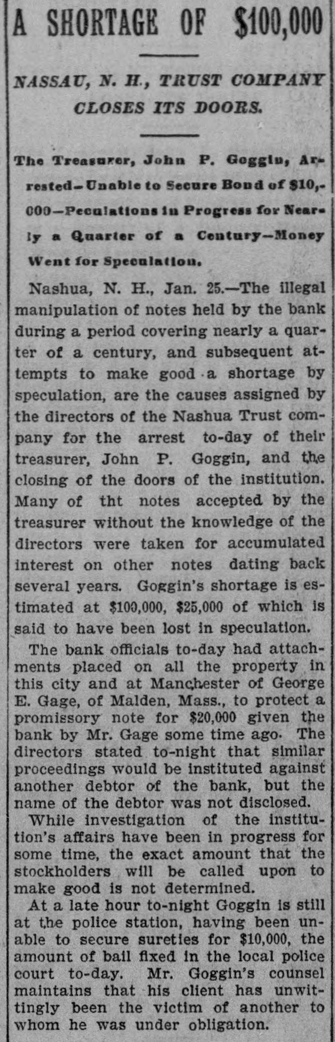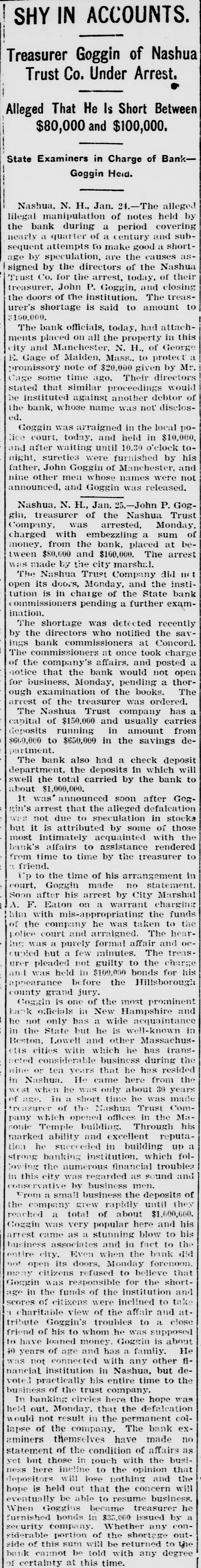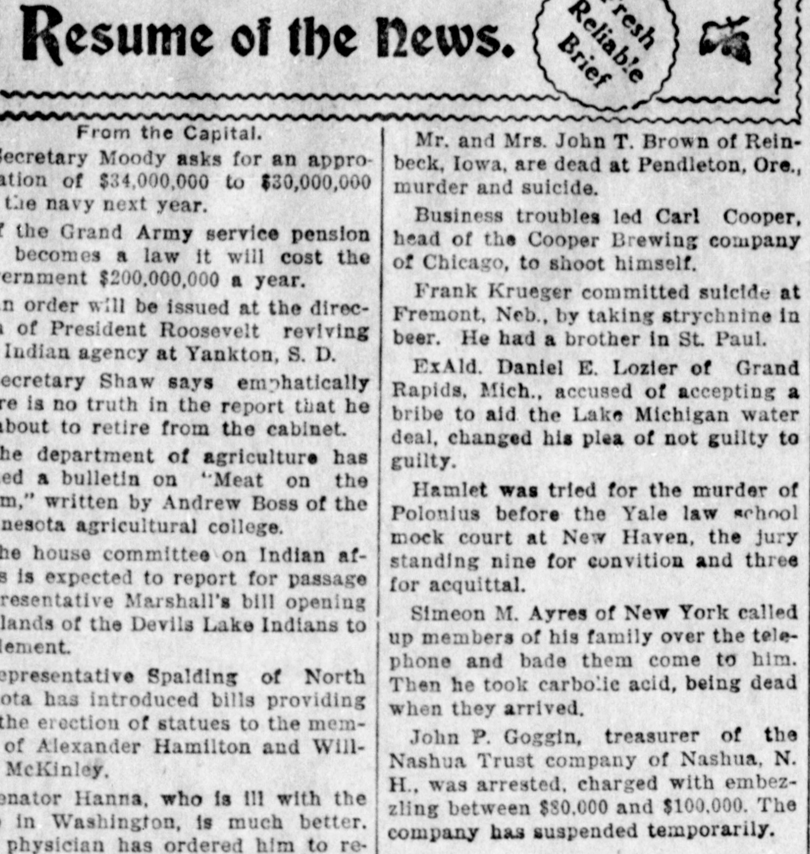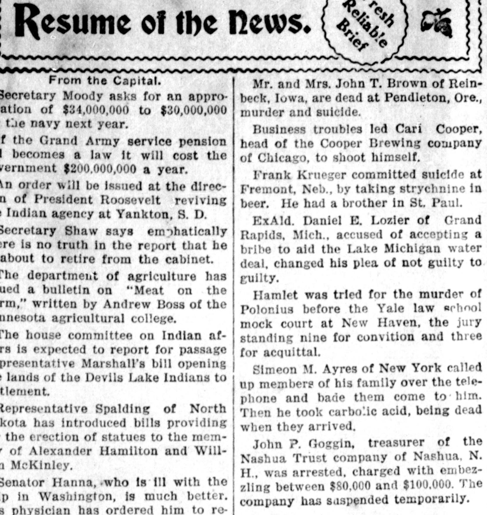 News of the Week. Of every 100 alcoholies attacked by pneumonia, 70 die, while of every 100 non-alcoholics SO attacked only 23 die. The new trans-Canadian route from Liverpool to Yokohama will be 2,200 miles shorter than that across the United States. John P. Goggin, treasurer of the Nashua (N. H.) Trust Company, has been arrested on the charge of embezzling $100, 000. Fifty-nine per cent. of deaths from consumption are people under 45 years of age, 29 per cent. from 45 to 60, and 12 per cent. of people over 60. A steel like grass from the volcanic slopes of Oran, Algeria, is SO elastic that it can be used instead of springs in the manufacture of furniture. Most dromedaries, according to menageries proprietor, are particularly fond of tobacco smoke, and can be made to do almost anything under its influence. Now that cotton presses reduce the size of a bale until it weighs 45 pounds to the square foot, one ship will carry the product of 40,000 acres of average cotton land. Great damage was done to fruit trees in Orange county, N. Y., by sleet January 22. The damage to peachgrowers is estimated at $100,000, many orchards being ruined. George A Rose, cashier of the Produce Exchange National Bank, Cleveland, Ohio, has been indicted for stealing $189. 000 of the bank funds. The bank has been closed. The Metropolitan Arm Museum of New York has just purchased an old chariot for $50 000. It was unearthed near Rome some time ago, and is 000 years old and splendidly preserved. The Masonic Temple in Chicago was damaged to the extent of $20,000 by fire, January 23, and a panie started among the 4000 occupants of the building: all escaped without serious injury. Second Assistant Postmaster General Shallenberger. in his annual report, says nearly 16. 000 000 000 pieces of mail matter were handled and that its trans portation cost more than $63,000, 000. J 1. Broderick. formerly president W L. Coldness formerly cashier, and Walter Brown, formerly director of the Indiana National Bank. have been arrested at Elk hart. Indiana, for embezzlement of $542. 000. S. B. Allen, president of the Farmers and Merchants National Bank at Cle burne. Texas. has been arrested, charged with the embezzlement of $29 000 of the bank funds He was released on $8. 000 bond Willard Catt. alleged to have been the the leader of the ging of ruffians who as saulted Mrs. Lafe Dedman, of Petersburg Indiana in the presence of her husband was apprehended at the home of Peter Gladish. but afterward escaped L. Wolfson's large dry goods store at San Antonio, Texas, which carried stock of goods valued at $333 000, was destroy ed by fire last Sunday The building was valued at $85,000. Considerable damage was done to surrounding property More than $12,000 worth of jewelry was found on James Walters, said to be one of the cleverest diamond thieves in the country. when he was arrested at Minne apolis. January 23, charged with having robbed Baroness Helena Radzikwele of $6000 worth of diamonds at the Colonial Hotel in San Francisco. The town of Aalesund, Norway, was completely destroyed by fire January 23. but there was no of life. The damage is estimated at $4,000,000 The entire population is homeless Provisions and medical stores, which are greatly needed, have been sent from several cities. Aale sund is a busy seaport trading town of Norway with over 8000 inhabitants At Jonestown, Miss., on the night of January 22. a large store was turned com pletely over, a residence was demolished, and the warehouse of the Jonestown Cotton Oil Company was unroofed and the con tents materially damaged by an electric storm, Negro cabins suffered to a great extent. Three cars on the Yazo and Mississippi Valley tracks were completely demolished by lightning. Disastrous floods occurred Friday and Saturday of last week in New York, New Jersey Delaware, Maryland, Virginia, Pennsylvania, and along the Ohio and Mis sissippi rivers and their tributaries. Mil lions of dollars damage resulted to property and much distress prevails among those who were compelled to abandon their homes. caused by the intense cold of Sat urday night and Sunday. Fire Chief Musham, in a report to May or Harrison, in Chicago, placed the blame for the Iroquois Theatre catastrophe upon the management and builders of the play house Harry Klawans, son of a wealthy Chicago man, has been arrested. charged with having in his possession plunder taken from the body of William M. Reid, of Waukegan, Illinois, who was burned with his wife in the theatre fire. United States enator Burton, Repub lican, Kansas, has been indicted by the Federal Grand Jury at St. Louis, charged with having accepted five checks of $500 each from the Rialto Grain and Securities Company while he was a United States Senator. It said he accepted the money as reward for preventing the issuance of a fraud order against the company. The Senator, in Washington, said that the money paid him was for his services as at torney for the Rialto Company The oyster-shucking industry on the ocean side of the Virginia Eastern Shore is fast growing in extent and prominence Over 3,000 gallons of shucked oysters are daily shipped from Onaneock to city markets. Orders are taken from Jacksonville Florida, to Portland. Maine, and from Montreal, Canada, to Omaha, Nebraska Several thousand people are employed This section is without the Baylor survey and is known as the "planting district. It was developed by private parties plant ing oyster on barren rock. Right Rev. Thomas Underwood Dud ley, Episcopal Bishop of Kentucky, died in New York, January 23. He was one of the most eloquent preachers among the Episcopal clergy. He was born on September 26, 1837, at Richmond, Va. and was graduated from the University of Vir-