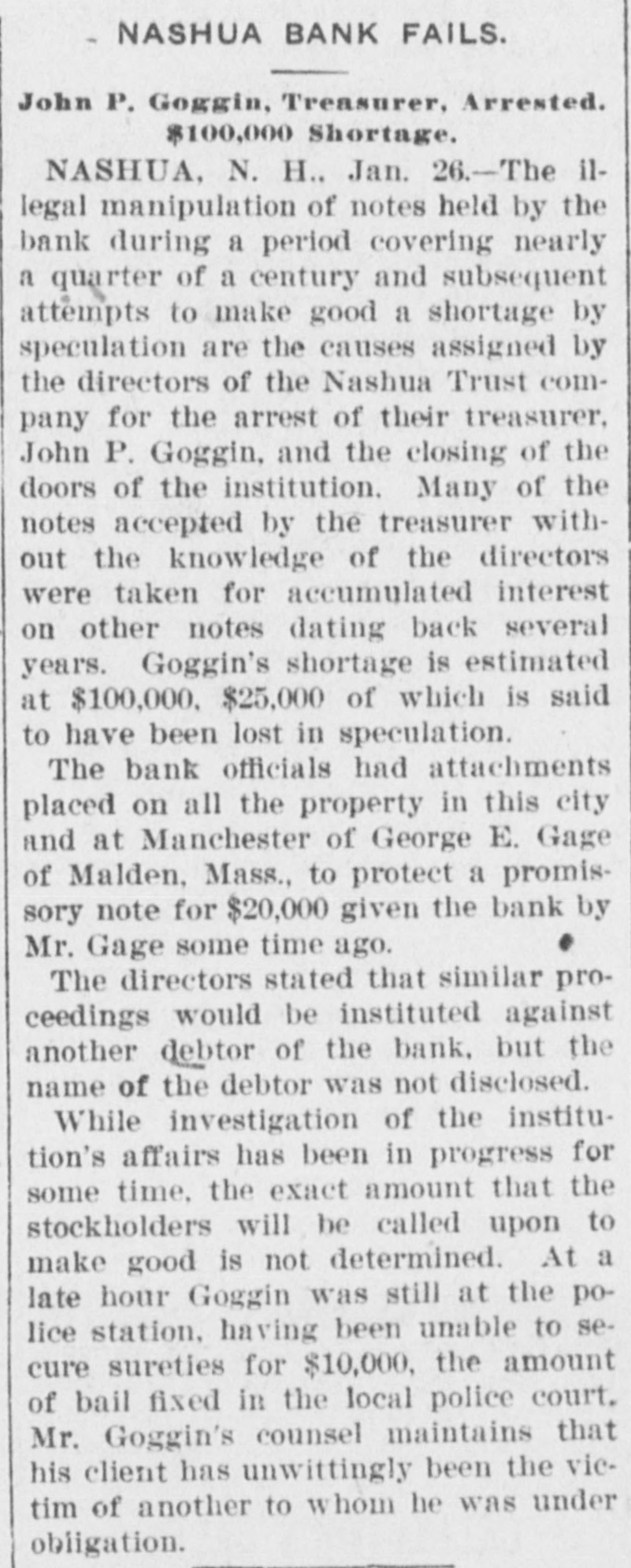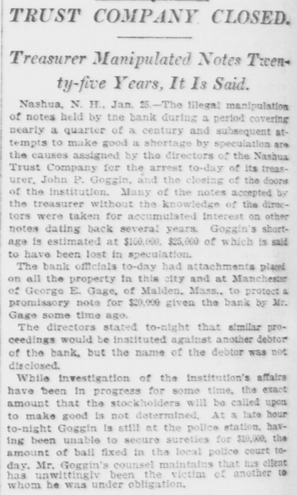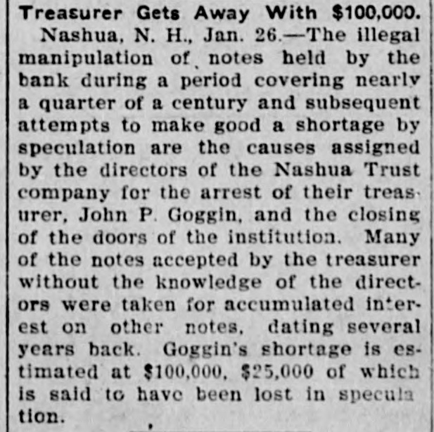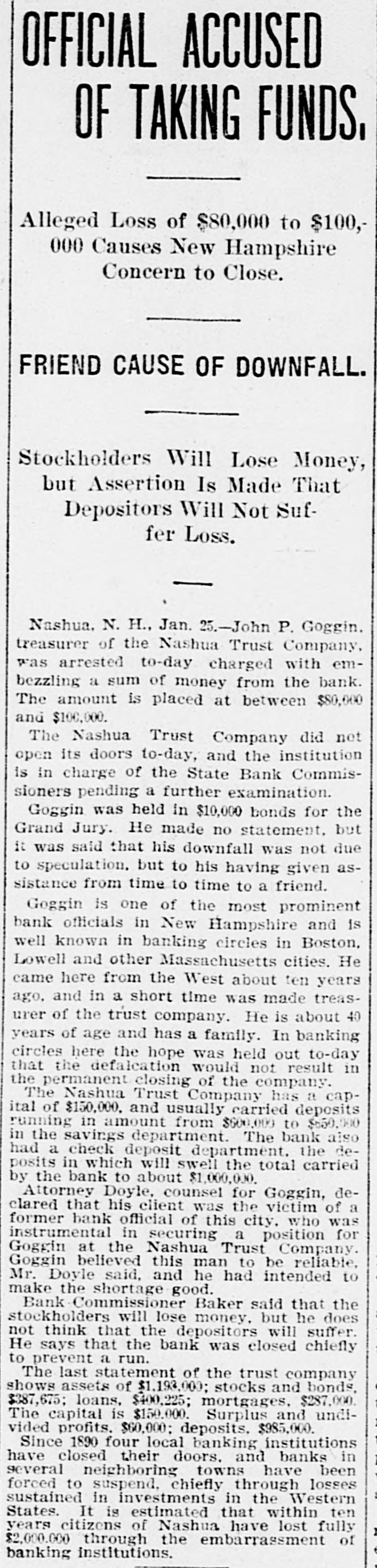 News of the Week. Of every 100 alcoholies attacked by pneumonia, 70 die, while of every 100 non-alcoholics SO attacked only 23 die. The new trans-Canadian route from Liverpool to Yokohama will be 2,200 miles shorter than that across the United States. John P. Goggin, treasurer of the Nashua (N. H.) Trust Company, has been arrested on the charge of embezzling $100, 000. Fifty-nine per cent. of deaths from consumption are people under 45 years of age, 29 per cent. from 45 to 60, and 12 per cent. of people over 60. A steel like grass from the volcanic slopes of Oran, Algeria, is SO elastic that it can be used instead of springs in the manufacture of furniture. Most dromedaries, according to menageries proprietor, are particularly fond of tobacco smoke, and can be made to do almost anything under its influence. Now that cotton presses reduce the size of a bale until it weighs 45 pounds to the square foot, one ship will carry the product of 40,000 acres of average cotton land. Great damage was done to fruit trees in Orange county, N. Y., by sleet January 22. The damage to peachgrowers is estimated at $100,000, many orchards being ruined. George A Rose, cashier of the Produce Exchange National Bank, Cleveland, Ohio, has been indicted for stealing $189. 000 of the bank funds. The bank has been closed. The Metropolitan Arm Museum of New York has just purchased an old chariot for $50 000. It was unearthed near Rome some time ago, and is 000 years old and splendidly preserved. The Masonic Temple in Chicago was damaged to the extent of $20,000 by fire, January 23, and a panie started among the 4000 occupants of the building: all escaped without serious injury. Second Assistant Postmaster General Shallenberger. in his annual report, says nearly 16. 000 000 000 pieces of mail matter were handled and that its trans portation cost more than $63,000, 000. J 1. Broderick. formerly president W L. Coldness formerly cashier, and Walter Brown, formerly director of the Indiana National Bank. have been arrested at Elk hart. Indiana, for embezzlement of $542. 000. S. B. Allen, president of the Farmers and Merchants National Bank at Cle burne. Texas. has been arrested, charged with the embezzlement of $29 000 of the bank funds He was released on $8. 000 bond Willard Catt. alleged to have been the the leader of the ging of ruffians who as saulted Mrs. Lafe Dedman, of Petersburg Indiana in the presence of her husband was apprehended at the home of Peter Gladish. but afterward escaped L. Wolfson's large dry goods store at San Antonio, Texas, which carried stock of goods valued at $333 000, was destroy ed by fire last Sunday The building was valued at $85,000. Considerable damage was done to surrounding property More than $12,000 worth of jewelry was found on James Walters, said to be one of the cleverest diamond thieves in the country. when he was arrested at Minne apolis. January 23, charged with having robbed Baroness Helena Radzikwele of $6000 worth of diamonds at the Colonial Hotel in San Francisco. The town of Aalesund, Norway, was completely destroyed by fire January 23. but there was no of life. The damage is estimated at $4,000,000 The entire population is homeless Provisions and medical stores, which are greatly needed, have been sent from several cities. Aale sund is a busy seaport trading town of Norway with over 8000 inhabitants At Jonestown, Miss., on the night of January 22. a large store was turned com pletely over, a residence was demolished, and the warehouse of the Jonestown Cotton Oil Company was unroofed and the con tents materially damaged by an electric storm, Negro cabins suffered to a great extent. Three cars on the Yazo and Mississippi Valley tracks were completely demolished by lightning. Disastrous floods occurred Friday and Saturday of last week in New York, New Jersey Delaware, Maryland, Virginia, Pennsylvania, and along the Ohio and Mis sissippi rivers and their tributaries. Mil lions of dollars damage resulted to property and much distress prevails among those who were compelled to abandon their homes. caused by the intense cold of Sat urday night and Sunday. Fire Chief Musham, in a report to May or Harrison, in Chicago, placed the blame for the Iroquois Theatre catastrophe upon the management and builders of the play house Harry Klawans, son of a wealthy Chicago man, has been arrested. charged with having in his possession plunder taken from the body of William M. Reid, of Waukegan, Illinois, who was burned with his wife in the theatre fire. United States enator Burton, Repub lican, Kansas, has been indicted by the Federal Grand Jury at St. Louis, charged with having accepted five checks of $500 each from the Rialto Grain and Securities Company while he was a United States Senator. It said he accepted the money as reward for preventing the issuance of a fraud order against the company. The Senator, in Washington, said that the money paid him was for his services as at torney for the Rialto Company The oyster-shucking industry on the ocean side of the Virginia Eastern Shore is fast growing in extent and prominence Over 3,000 gallons of shucked oysters are daily shipped from Onaneock to city markets. Orders are taken from Jacksonville Florida, to Portland. Maine, and from Montreal, Canada, to Omaha, Nebraska Several thousand people are employed This section is without the Baylor survey and is known as the "planting district. It was developed by private parties plant ing oyster on barren rock. Right Rev. Thomas Underwood Dud ley, Episcopal Bishop of Kentucky, died in New York, January 23. He was one of the most eloquent preachers among the Episcopal clergy. He was born on September 26, 1837, at Richmond, Va. and was graduated from the University of Vir-