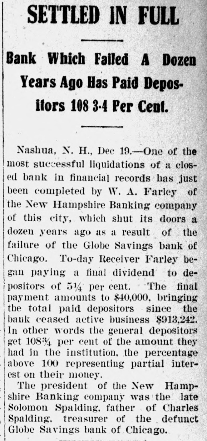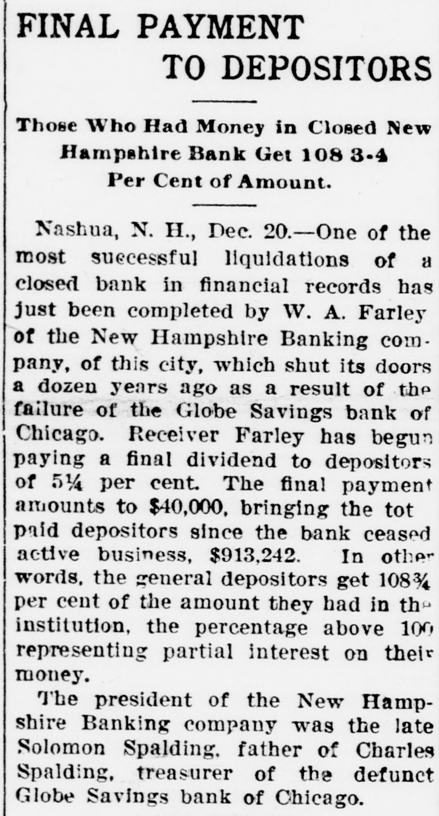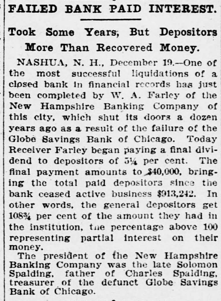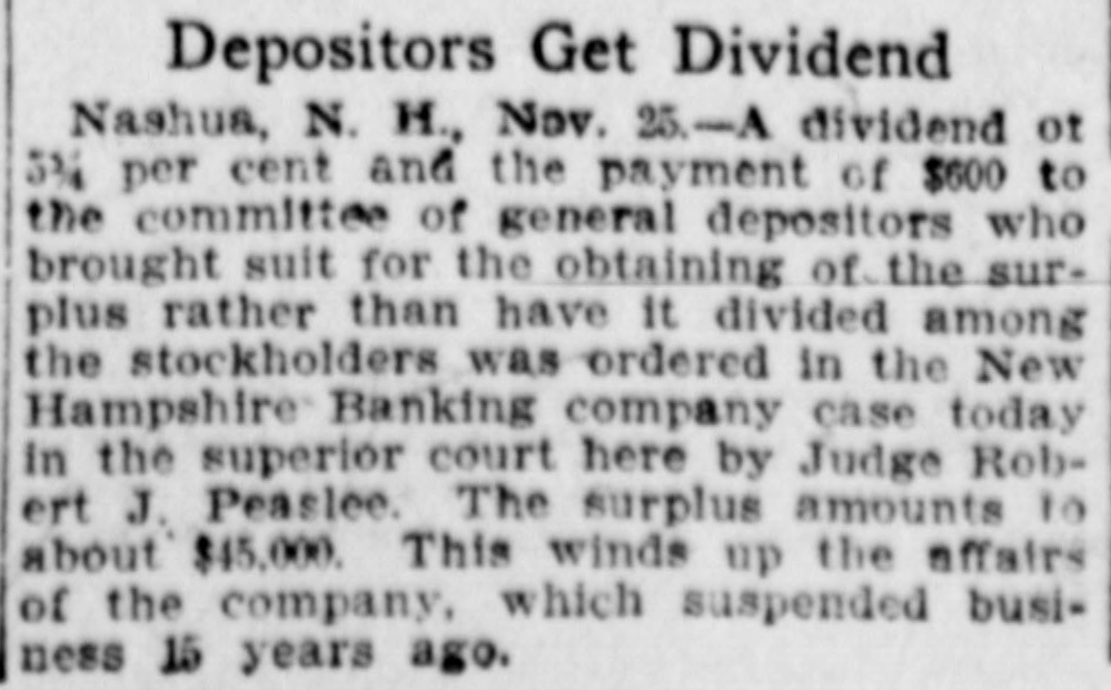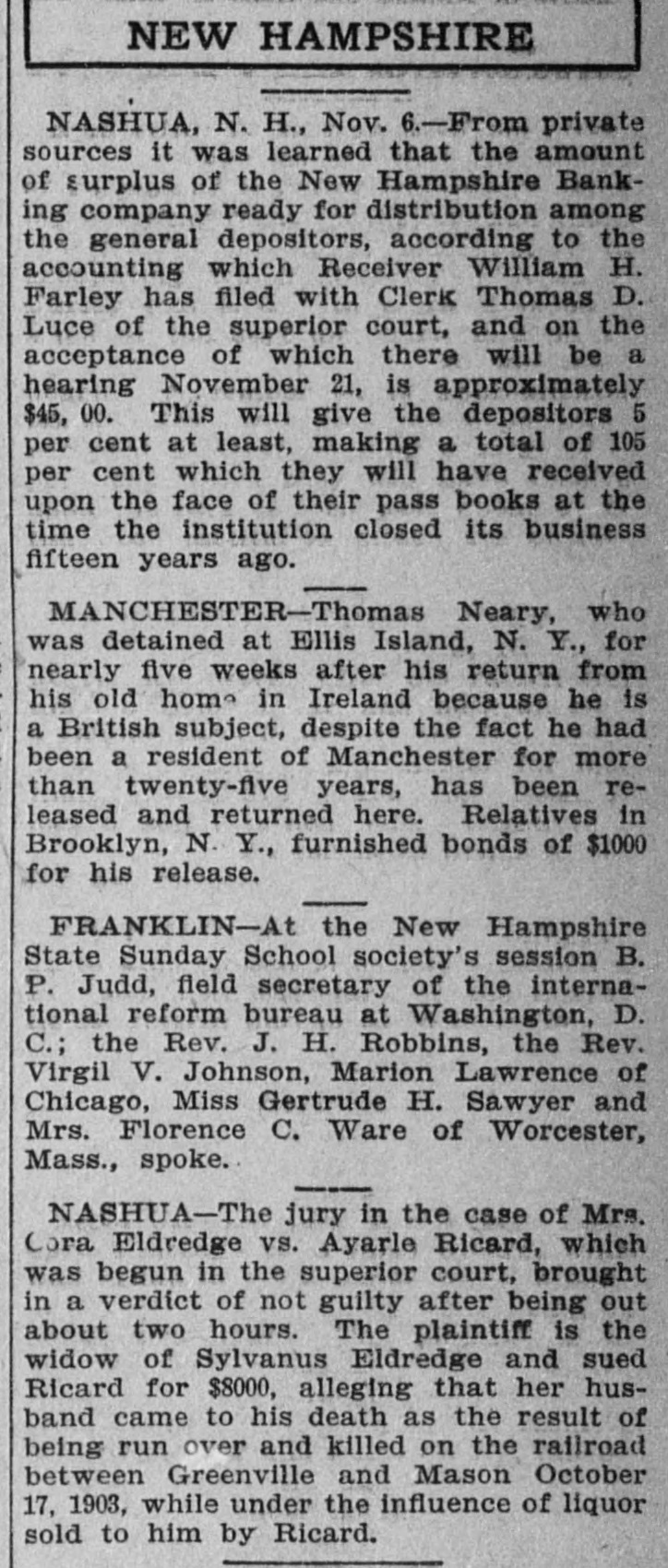 NEW HAMPSHIRE NASHUA, N. H., Nov. 6.-From private sources it was learned that the amount of surplus of the New Hampshire Banking company ready for distribution among the general depositors, according to the accounting which Receiver William H. Farley has filed with Clerk Thomas D. Luce of the superior court, and on the acceptance of which there will be a hearing November 21, is approximately $45, 00. This will give the depositors 5 per cent at least, making a total of 105 per cent which they will have received upon the face of their pass books at the time the institution closed its business fifteen years ago. MANCHESTER-Thomas Neary, who was detained at Ellis Island, N. Y., for nearly five weeks after his return from his old home in Ireland because he is a British subject, despite the fact he had been a resident of Manchester for more than twenty-five years, has been released and returned here. Relatives in Brooklyn, N. Y., furnished bonds of $1000 for his release. FRANKLIN-At the New Hampshire State Sunday School society's session B. P. Judd, field secretary of the international reform bureau at Washington, D. C.; the Rev. J. H. Robbins, the Rev. Virgil V. Johnson, Marion Lawrence of Chicago, Miss Gertrude H. Sawyer and Mrs. Florence C. Ware of Worcester, Mass., spoke. NASHUA-The jury in the case of Mrs. Cora Eldredge vs. Ayarle Ricard, which was begun in the superior court, brought in a verdict of not guilty after being out about two hours. The plaintiff is the widow of Sylvanus Eldredge and sued Ricard for $8000, alleging that her husband came to his death as the result of being run over and killed on the railroad between Greenville and Mason October 17, 1903, while under the influence of liquor sold to him by Ricard.