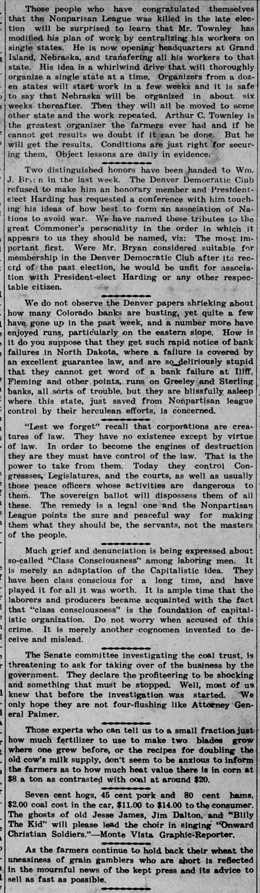 Those people who have congratulated themselves that the Nonparisan League was killed in the late election will be surprised to learn that Mr. Townley has modified his plan of work by centralizing his workers on single states. He is now opening headquarters at Grand Island, Nebraska, and transfering all his workers to that state. His idea is a whirlwind drive that will thoroughly organize a single state at a time, Organizers from a dozen states will start work in a few weeks and it is safe to say that Nebraska will be organized in about six weeks thereafter. Then they will all be moved to some other state and the work repeated. Arthur C. Townley is the greatest organizer the farmers ever had and if he cannot get results we doubt if it can be done. But he will get the results. Conditions are just right for securing them, Object lessons are daily in evidence. Two distinguished honors have been handed to Wm. J. Bry: n in the last week. The Denver Democratic Club refused to make him an honorary member and Presidentelect Harding has requested a conference with him touching his ideas of how best to form an association of Nations to avoid war. We have named these tributes to the great Commoner's personality in the order in which it appears to us they should be named, viz: The most important first. Were Mr. Bryan considered suitable for membership in the Denver Democratic Club after its record of the past election, he would be unfit for association with President-elect Harding or any other respectable citizen. We do not observe the Denver papers shrieking about how many Colorado banks are busting, yet quite a few have gone up in the past week, and a number more have enjoyed runs, particularly on the eastern slope. How is it do you suppose that they get such rapid notice of bank failures in North Dakota, where a failure is covered by an excellent guarantee law, and are so_deliriously stupid that they cannot get word of a bank failure at Iliff, Fleming and other points, runs on Greeley and Sterling banks, all sorts of trouble, but they are blissfully asleep where this state, just saved from Nonpartisan league control by their herculean efforts, is concerned. "Lest we forget" recall that corporations are creatures of law. They have no existence except by virtue of law. In order to become the engines of destruction they are they must have control of the law. That is the power to take from them. Today they control Congressses, Legislatures, and the courts, as well as usually those peace officers whose activities are dangerous to them. The sovereign ballot will dispossess them of all these. The remedy is a legal one and the Nonpartisan League points the sure and peaceful way for making them what they should be, the servants, not the masters of the people. Much grief and denunciation is being expressed about so-called "Class Consciousness" among laboring men. It is merely an adaptation of the Capitalistic idea. They have been class conscious for a long time, and have played it for all it was worth. It is ample time that the laborers and producers became acquainted with the fact that "class consciousness" is the foundation of capitalistic organization. Do not worry when accused of this crime. It is merely another cognomen invented to deceive and mislead. The Senate committee investigating the coal trust, is threatening to ask for taking over of the business by the government. They declare the profiteering to be shocking and something that must be stopped. Well, most of us knew that before the investigation was started. We only hope they are not four-flushing like Attorney General Palmer. Those experts who can tell us to a small fraction just how much fertilizer to use to make two blades grow where one grew before, or the recipes for doubling the old cow's milk supply, don't seem to be anxious to inform the farmers as to how much heat value there is in corn at $8 a ton as contrasted with coal at around $20. Seven cent hogs, 45 cent pork and 80 cent hams, $2.00 coal cost in the car, $11.00 to $14.00 to the consumer. The ghosts of old Jesse James, Jim Dalton, and "Blily The Kid" will please lead the choir in singing "Onward Christian Soldiers."-Monte Vista Graphic-Reporter. As the farmers continue to hold back their wheat the uneasiness of grain gamblers who are short is reflected in the mournful news of the kept press and its advice to sell as fast as possible.