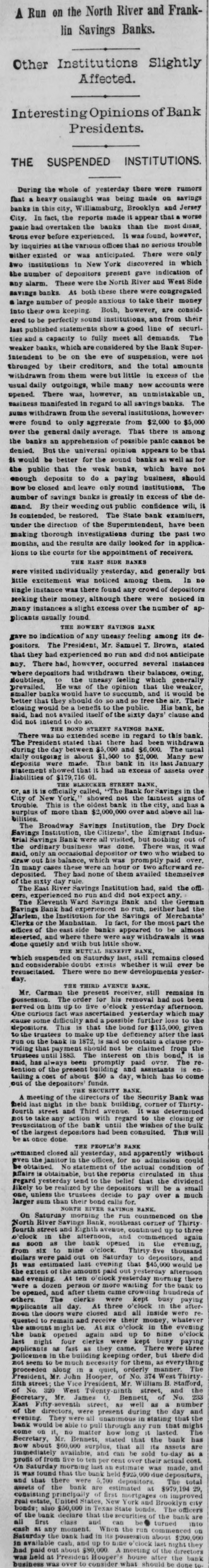 A Run on the North River and Franklin Savings Banks. Other Institutions Slightly Affected. Interesting Opinions of Bank Presidents. THE SUSPENDED INSTITUTIONS. During the whole of yesterday there were rumors that heavy onslaught was being made on savings banks in this city, Williamsburg, Brooklyn and Jersey City. In fact, the reports made it appear that worse panichad overtaken the banks than the most disas trons ever before experienced. It was found, however, by inquiries the various offices that no serious trouble either existed or was anticipated. There were only Swo institutions in New York discovered in which the number of depositors present gave ndication of any alarm. These were the North River and West Side savings banks. At both these there were congregated a large number of people anxious to take their money into their own keeping. Both, however, are consid. ered to be perfectly sound institutions. and from their last published statements. show good line of securi ties and capacity to fully meet all demands. The weaker banks, which are considered by the Bank Superintendent to be on the eve of suspension, were not thronged by their creditors, and the total amounts withdrawn from them were but little in excess of the usual daily outgoings while many new accounts were opened. There was, however, an mistakable un. easiness manifested in regard to all savings banks. The sums withdrawn from the several institutions. however were found to only aggregate from 2,000 to $5,000 over the general daily average. That there IS among the banks an apprehension of possible panic cannot be denied. But the universal opinion appears to be that it would be better for the sound banks as well as for the public that the weak banks, which have not enough deposits to do paying business, should now be closed and leave only sound institutions, The number of savings banks is greatly in excess of the demand. By their weeding out public confidence will, it is contended, be restored. The State bank examiners, under the direction of the Superintendent, have been making thorough investigations during the past two months, and the results are daily looked for in applica. Lions to the courts for the appointment of receivers. BANKS SIDE THE EAST were visited individually yesterday. and generally but little excitement was noticed among them. In no single instance was there found any crowd of depositors seeking their money although there were noticed in many instances slight excess over the number of applicants usually found BANK BOWERY THE SAVINGS gave no indication of any uneasy feeling among its de. positors. The President, Mr. Samuel T. Brown, stated that they had experienced no run and did not anticipate any. There had, however occurred several instances where depositors had withdrawn their balances. owing, doubtless, the uneasy feeling which generally prevailed He was of the opinion that the weaker. smaller banks would have succumb and would be better that they should do tree the Their His the be he public. bank. benefit would closing said. had ailed itself of the sixty days clause and did not intend do so. BANK BOND THE There scene in regard to this bank The President stated that there been during the day between and 000. The usual daily outgoing about $1,500 2,000. Many new deposits were made. This bank in its last January statement had an excess of assets over liabilities of STREET BANK officially called, 'The Bank Savings in the City New the faintest signs of trouble. This the oldest bank the city, has a surplus of more than $2,000,000 over and above all liabilities. The Broadway Savings Institution. the Dry Dock Savings Institution the Citizens' the Emigrant Indus trial Savings Bank were all visited, but nothing of the ordinary business done. There was who wished to said, only draw out his balance, which was prom paid over In many cases these were hour two afterward deposited. They had none of them availed themselv es rule. day of the sixty The East River Savings Institution had. said the offi cers, experienced run and did not expect any The Eleventh Ward Savings Bank and the Savings Bank had experienced no run. neither had the Harlem, the Institution for the Savings of Clerks or the Manhattan fact. for the most part the offices of the east side banks appeared to be almost deserted and where there were any withdrawals it was done quietly and with but little show. THE BANK, which suspended on Saturday last, still remains closed and considerable doubt exists whether will ever be resuscitated. There were no new developments yesterday. AVENUE THIRD THE BANK Mr. Carman the present still remains in possession. The order for his removal had not been served him up to tive o'clock yesterday afternoon One fact curious yesterday ascertained which may some difficulty and possible to the depositors. This is that the bond for $115,000. given to the trustees : make up the effciency after the last 1872. bank run viding that should not be claimed from the bond.i 1883 The trustees on this until said, has always been promptly paid over. The represent Bention assistants and the enof tailing cost about $50 day, which has to come out of the depositors funds THE BANK A meeting of the directors the Security Bank was fheld last night the bank building, corner Thirty. fourth street and Third was determine take any action with regard to the closing or of the bank until the wishes of the bulk of the largest depositors had been consulted This will ac once done BANK THE PEOPLE'S remained closed all vesterday, and apparently without even the janitor in the offices. for no admission could of the ctual conditions affairs obtainable. but the reports lated in this regard esterday tend the belief that the dividend likely be realized by the depositors will small unless the trustees decide pay over much larger sum than their bond calls NORTH BANK On Saturday morning the on the North River corner Thirty fourth Eighth the o'clock again bank the s