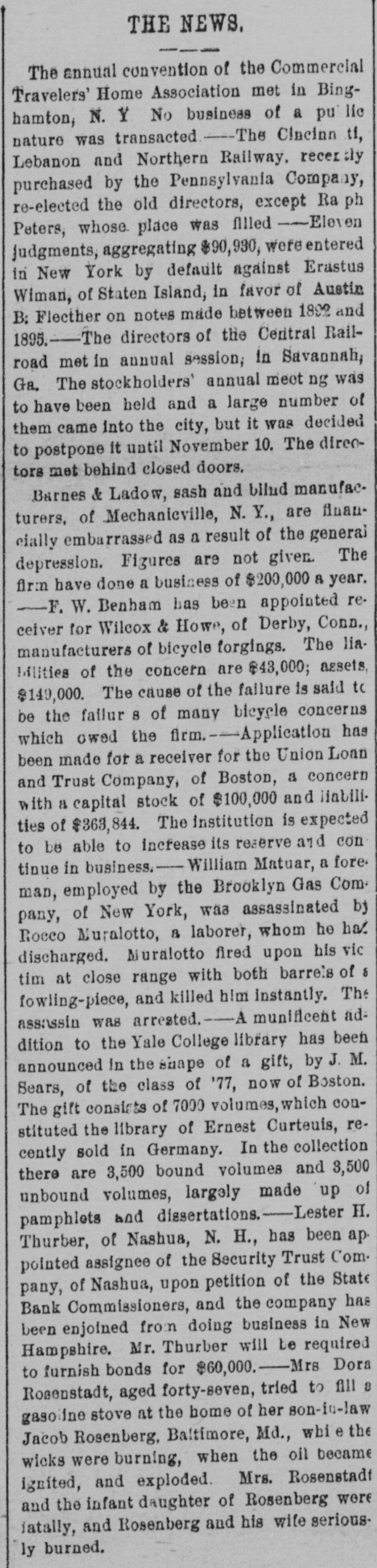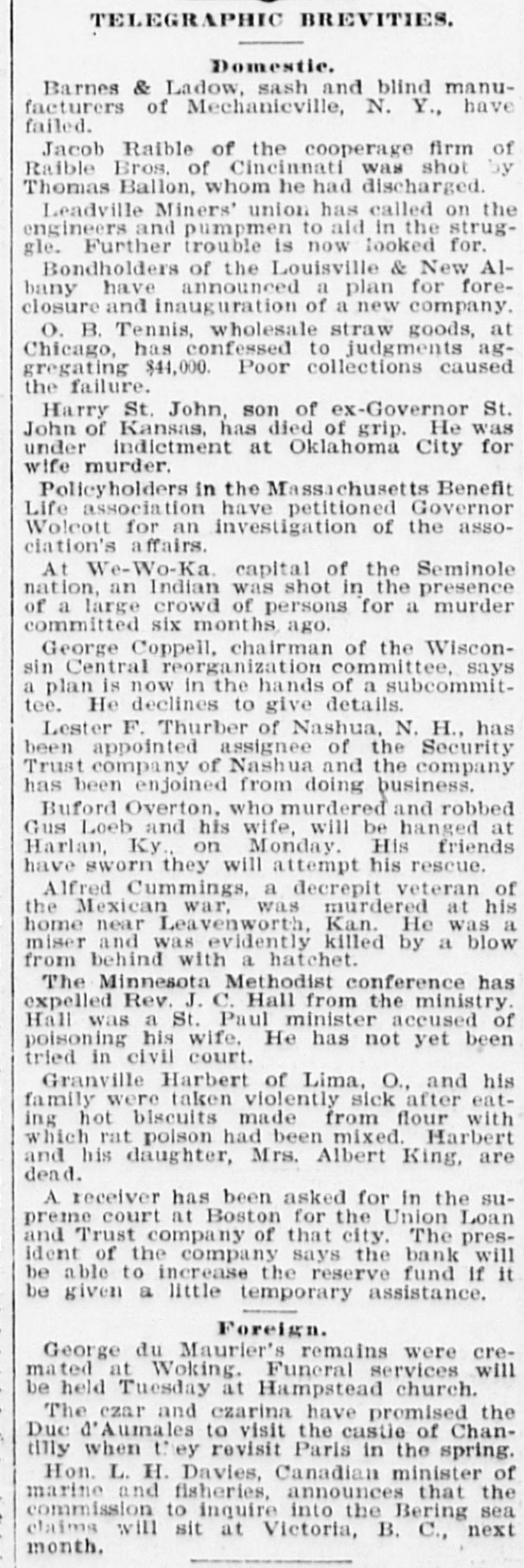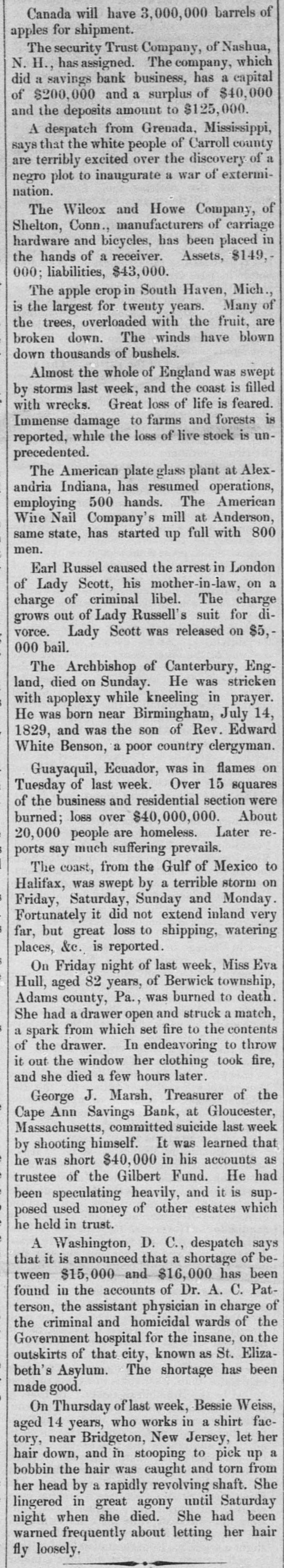 Albert Bray, aged 39, a farmer living Noblesville, Ind., cut the throats ot his near wife, his 9-year-old son, Carl, his 2year-old daughter, Edna, and then killed himself. No cause is known for the deed. Mrs. Henry Grundy. a rich widow aged died nt Youngstown, O., as the result 50, of starvation. Her husband recently died and she afterward refused all food. The Jasper county jail at Paulding, was burned and two prisoners, a Miss., E. A. Strickland and Mollie Daniels, negro woman. were cremated. George Sanders fatally assaulted Fisher with a club a piano tuner named at La Grange, Ind., and then hanged himself to a rafter in a deserted house. Corning, Ia., was visited by a busi- fire which destroyed one-third of the ness houses. the loss being $200,000. Dr. Andrew J. Purdy, aged 50. pasof the Asbury Methodist church at in Buffalo, tor dropped dead on the street Corning, N. Y. For spitting in his son's face Temple J. Houston shot and fatally wounded B. Jenkins at Woodward, O.T. Fred Pratt, the companion of John Sair in the bank robbery and double armurder D. at Sherburne, Minn., was rested at Albert Lea, in that state. James Anderson and Henry Cyat, a colored, were shot to death by both mob near Taylor's Ferry, Ala. They and were accused of having murdered robbed Randolph Falls, a farmer. hurricane caused immense damage A property on the New England coast and to the loss of several lives. At Garfield park, Chicago, James seconds Michael, the Welchman, clipped 18 the American five-mile bicycle was record. off His time for the distance 9:20. Mrs. G. Walsdorfer, of Leo, O., child was playing with her baby. when the with its struck its mother in the eyes finger nails, rendering her hopelessly a blind. The Security Trust company. banking concern at Nashua, N.H., failed for $300,000. Charles Hadworth and Henry Welsh for were executed at Wewoka, O. T., murder. The exports of specie from the port the New York for the week ended on and 10th of amounted to $1,000 in gold $873,740 in silver. The imports were: Gold, $2,213,296 silver, $57,907. Prof. J. A. Blaisdell, aged 69 years. Beloit college. committed suicide at of Kenosha, Wis. Sickness was the cause. Snow fell in portions of Nebraska with a temperature of only ten degrees above zero. After a four months' recess the United in States supreme court reconvened The Washington for the October term. court docket contains 615 cases. against Oc751 at the beginning of last year's tober term. An unknown man jumped into the at Prospect point, Niagara Falls, the and water was immediately swept over American falls. The visible supply of grain in the United States on the 12th was: Wheat, bush434,000 bushels; corn. 14,468,000 els; 52, oats. 9,533,000 bushels: rye, bushels. 2,032. 000 bushels: barley, 2,920,000 The effect of the political agitation business throughout the country upon indicated by the falling off in postal endreceipts is of $63,000 for the quarter ing September 30. The forty-third session of the International Typographical union convened at Colorado Springs. Col. The First national bank of Eddy, N. of M., closed its doors with liabilities $75.000. By the assignment of Printer follow- E. F. Bigelow, of Portland, Conn., the in his papers, which were printed to susestablishment, ing are compelled the The Middletown Tribune, Wespend: Middletown County Record, Colchester the leyan College Argus and the Advocate. Col. J. R. McLain. a large lumber asdealer of Putnam county. W. Va., signed with liabilities of $100,000. Because his sweetheart, Miss Tillie Dietzman. would not consent to marry Philip Zimmer shot and fatally then wounded him. the girl in St. Louis and killed himself Epping, N. H., was visited by a busi- fire destroyed six of its principal $100, that ness houses and caused a loss of 000. While Preserved Grant was Chardon, coma patent medicine at a Mrs. pounding the mixture exploded and in Perry O., and her child were fataMy jured. The Atlantic coast in both directions with New York was strewn from wrecks of bathhouses, piers and yachts, broke result of a high tide which the records. At many resorts summer moorhotels all were plucked from their and floated out to sea. ings Fire destroyed business buildings at at Great Barrington, Mass.. valued $200,000. Bufford Overton was executed at Har- 1895. Ky., for the murder, June 21, Jewish lan, of Gustave and Julia Loeb, two peddlers. PERSONAL AND POLITICAL. Y. Atkinson was reelected gover by a ( W. of Georgia by the democrats 35,000. majority nor of not less than once Gen. George A. Sheridan, political of speaker Louisfamous