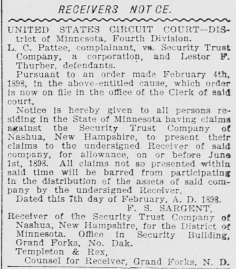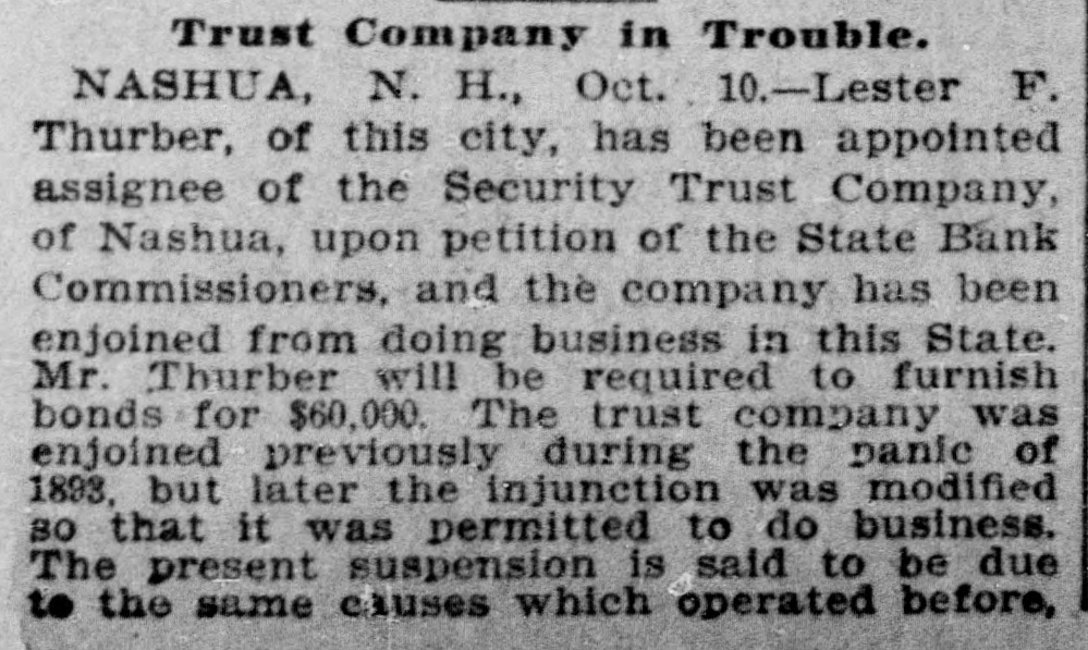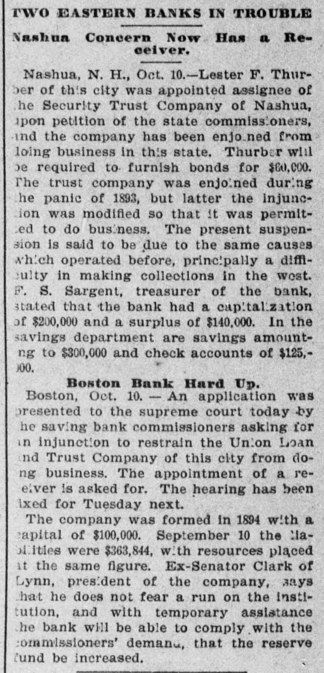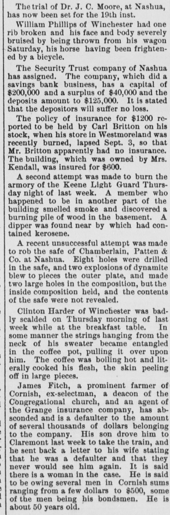 Albert Bray, aged 39, a farmer living Noblesville, Ind., cut the throats ot his near wife, his 9-year-old son, Carl, his 2year-old daughter, Edna, and then killed himself. No cause is known for the deed. Mrs. Henry Grundy. a rich widow aged died nt Youngstown, O., as the result 50, of starvation. Her husband recently died and she afterward refused all food. The Jasper county jail at Paulding, was burned and two prisoners, a Miss., E. A. Strickland and Mollie Daniels, negro woman. were cremated. George Sanders fatally assaulted Fisher with a club a piano tuner named at La Grange, Ind., and then hanged himself to a rafter in a deserted house. Corning, Ia., was visited by a busi- fire which destroyed one-third of the ness houses. the loss being $200,000. Dr. Andrew J. Purdy, aged 50. pasof the Asbury Methodist church at in Buffalo, tor dropped dead on the street Corning, N. Y. For spitting in his son's face Temple J. Houston shot and fatally wounded B. Jenkins at Woodward, O.T. Fred Pratt, the companion of John Sair in the bank robbery and double armurder D. at Sherburne, Minn., was rested at Albert Lea, in that state. James Anderson and Henry Cyat, a colored, were shot to death by both mob near Taylor's Ferry, Ala. They and were accused of having murdered robbed Randolph Falls, a farmer. hurricane caused immense damage A property on the New England coast and to the loss of several lives. At Garfield park, Chicago, James seconds Michael, the Welchman, clipped 18 the American five-mile bicycle was record. off His time for the distance 9:20. Mrs. G. Walsdorfer, of Leo, O., child was playing with her baby. when the with its struck its mother in the eyes finger nails, rendering her hopelessly a blind. The Security Trust company. banking concern at Nashua, N.H., failed for $300,000. Charles Hadworth and Henry Welsh for were executed at Wewoka, O. T., murder. The exports of specie from the port the New York for the week ended on and 10th of amounted to $1,000 in gold $873,740 in silver. The imports were: Gold, $2,213,296 silver, $57,907. Prof. J. A. Blaisdell, aged 69 years. Beloit college. committed suicide at of Kenosha, Wis. Sickness was the cause. Snow fell in portions of Nebraska with a temperature of only ten degrees above zero. After a four months' recess the United in States supreme court reconvened The Washington for the October term. court docket contains 615 cases. against Oc751 at the beginning of last year's tober term. An unknown man jumped into the at Prospect point, Niagara Falls, the and water was immediately swept over American falls. The visible supply of grain in the United States on the 12th was: Wheat, bush434,000 bushels; corn. 14,468,000 els; 52, oats. 9,533,000 bushels: rye, bushels. 2,032. 000 bushels: barley, 2,920,000 The effect of the political agitation business throughout the country upon indicated by the falling off in postal endreceipts is of $63,000 for the quarter ing September 30. The forty-third session of the International Typographical union convened at Colorado Springs. Col. The First national bank of Eddy, N. of M., closed its doors with liabilities $75.000. By the assignment of Printer follow- E. F. Bigelow, of Portland, Conn., the in his papers, which were printed to susestablishment, ing are compelled the The Middletown Tribune, Wespend: Middletown County Record, Colchester the leyan College Argus and the Advocate. Col. J. R. McLain. a large lumber asdealer of Putnam county. W. Va., signed with liabilities of $100,000. Because his sweetheart, Miss Tillie Dietzman. would not consent to marry Philip Zimmer shot and fatally then wounded him. the girl in St. Louis and killed himself Epping, N. H., was visited by a busi- fire destroyed six of its principal $100, that ness houses and caused a loss of 000. While Preserved Grant was Chardon, coma patent medicine at a Mrs. pounding the mixture exploded and in Perry O., and her child were fataMy jured. The Atlantic coast in both directions with New York was strewn from wrecks of bathhouses, piers and yachts, broke result of a high tide which the records. At many resorts summer moorhotels all were plucked from their and floated out to sea. ings Fire destroyed business buildings at at Great Barrington, Mass.. valued $200,000. Bufford Overton was executed at Har- 1895. Ky., for the murder, June 21, Jewish lan, of Gustave and Julia Loeb, two peddlers. PERSONAL AND POLITICAL. Y. Atkinson was reelected gover by a ( W. of Georgia by the democrats 35,000. majority nor of not less than once Gen. George A. Sheridan, political of speaker Louisfamous