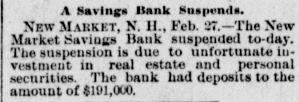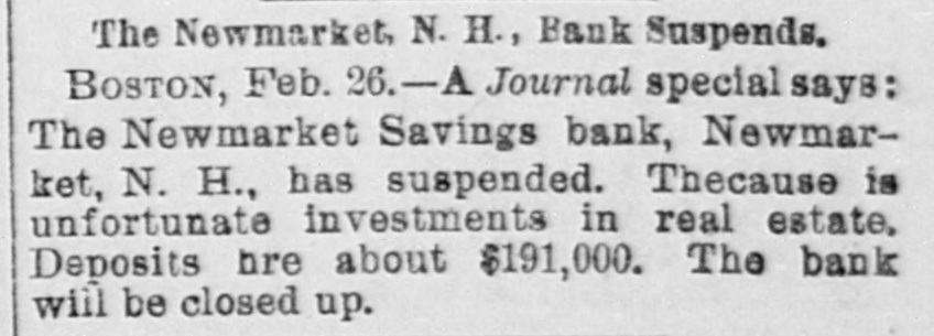 The Newmarket, N. H., Bank Suspends. BOSTON, Feb. 26.-A Journal special says: The Newmarket Savings bank, Newmarket, N. H., has suspended. Thecause is unfortunate investments in real estate, Deposits hre about $191,000. The bank will be closed up.