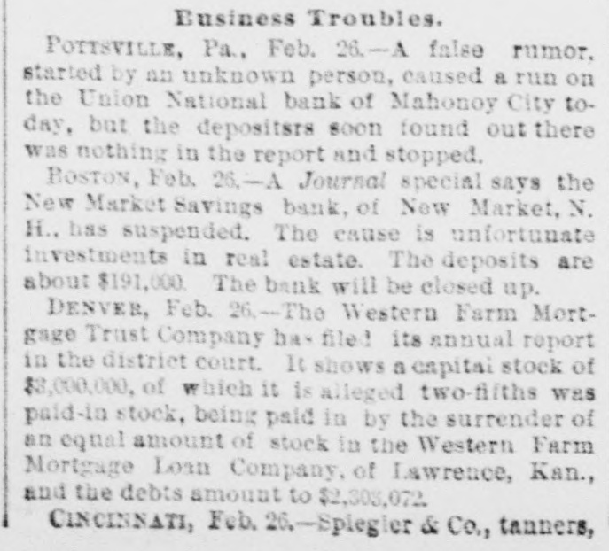 Business Troubles. POTTSVILLE, Pa., Feb. 26-A false rumor. started by nn unknown person, caused a run on the Union National bank of Mahonoy City today, but the depositsrs soon found out there was nothing in the report and stopped. BOSTON, Feb. 26,-A Journal special says the New Market Savings bank, of New Market, N. H., has suspended. The cause is unfortunate investments in real estate. The deposits are about $191,000. The bank will be closed up. DENVER, Feb. 26.-The Western Farm Mortgage Trust Company has filed its annual report in the district court. It shows a capital stock of $8,000,000, of which it is alleged two-filths was paid-in stock, being paid in by the surrender of an equal amount of stock in the Western Farm Mortgage Loan Company, of Lawrence, Kan., and the debts amount to $2,303,072. CINCINNATI, Feb. 26,-Spiegier & Co., tanners,