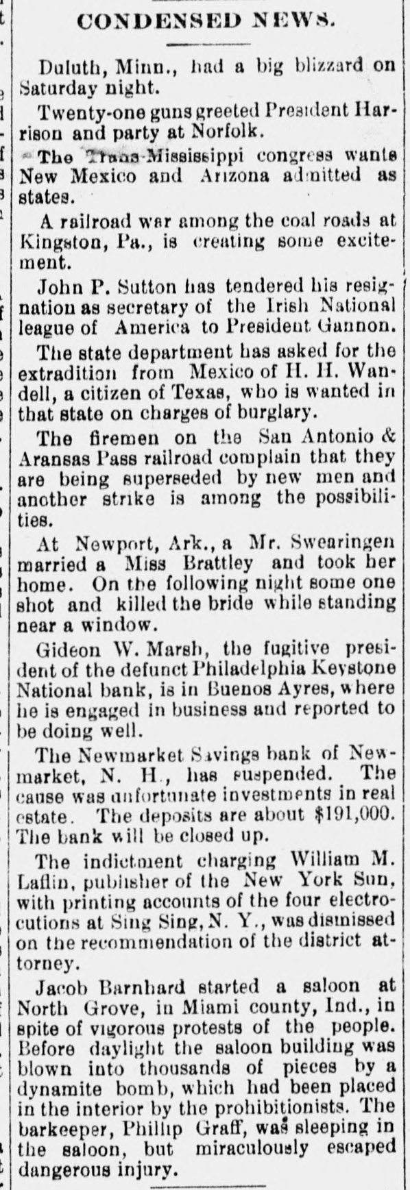 CONDENSED NEWS. Duluth, Minn., had a big blizzard on Saturday night. Twenty-one guns greeted President Harrison and party at Norfolk. The Trans-Mississippi congress wante New Mexico and Arizona admitted as states. A railroad war among the coal roads at Kingston, Pa., is creating some excitement. John P. Sutton has tendered his resignation as secretary of the Irish National league of America to President Gannon. The state department has asked for the extradition from Mexico of H. H. Wandell, a citizen of Texas, who is wanted in that state on charges of burglary. The firemen on the San Antonio & Aransas Pass railroad complain that they are being superseded by new men and another strike is among the possibilities. At Newport, Ark., a Mr. Swearingen married a Miss Brattley and took her home. On the following night some one shot and killed the bride while standing near a window. Gideon W. Marsh, the fugitive president of the defunct Philadelphia Keystone National bank, is in Buenos Ayres, where he is engaged in business and reported to be doing well. The Newmarket Savings bank of Newmarket, N. H, has suspended. The cause was anfortunate investments in real estate. The deposits are about $191,000. The bank will be closed up. The indictment charging William M. Laflin, publisher of the New York Sun, with printing accounts of the four electrocutions at Sing Sing, N. Y., was dismissed on the recommendation of the district attorney. Jacob Barnhard started a saloon at North Grove, in Miami county, Ind., in spite of vigorous protests of the people. Before daylight the saloon building was : blown into thousands of pieces by a dynamite bomb, which had been placed The in the interior by the prohibitionists. barkeeper, Phillip Graff, was sleeping in the saloon, but miraculously escaped dangerous injury.