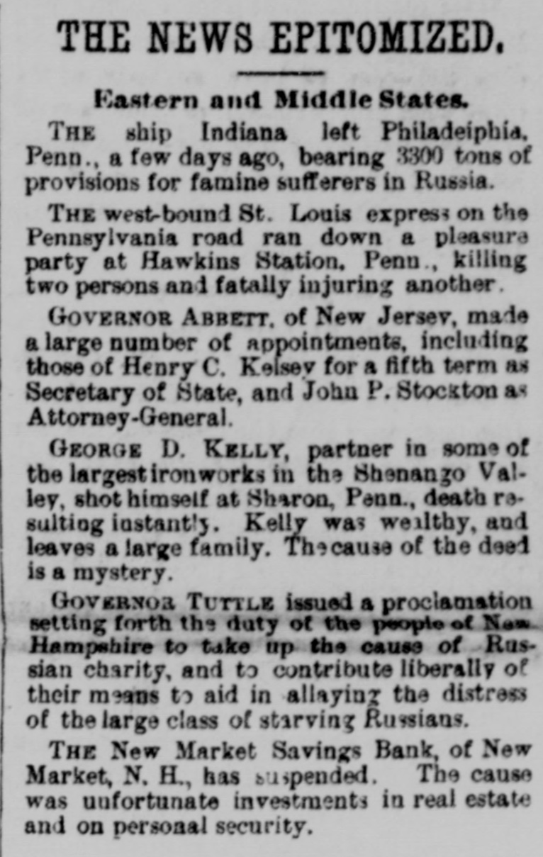 THE NEWS EPITOMIZED. Eastern and Middle States. THE ship Indiana left Philadeiphia, Penn. a few days ago, bearing 3300 tons of provisions for famine sufferers in Russia. THE west-bound St. Louis express on the Pennsylvania road ran down a pleasure party at Hawkins Station. Penn., killing two persons and fatally injuring another. GOVERNOR ABBETT. of New Jersev, made a large number of appointments, including those of Henry C. Kelsey for a fifth term as Secretary of State, and John P. Stockton as Attorney-General. GEORGE D. KELLY, partner in some of the largestironworks in the Shenango Valley, shot thimself at Sharon, Penn., death resulting instantly. Kelly was wealthy, and leaves a large family. The cause of the deed is a mystery. GOVERNOR TUTTLE issued a proclamation setting forth the duty of the people of New Hampshire to take up the cause of Russian charity, and to contribute liberally of their means to aid in allaying the distress of the large class of starving Russians. THE New Market Savings Bank, of New Market, N. H., has suspended. The cause was unfortunate investments in real estate and on personal security.
