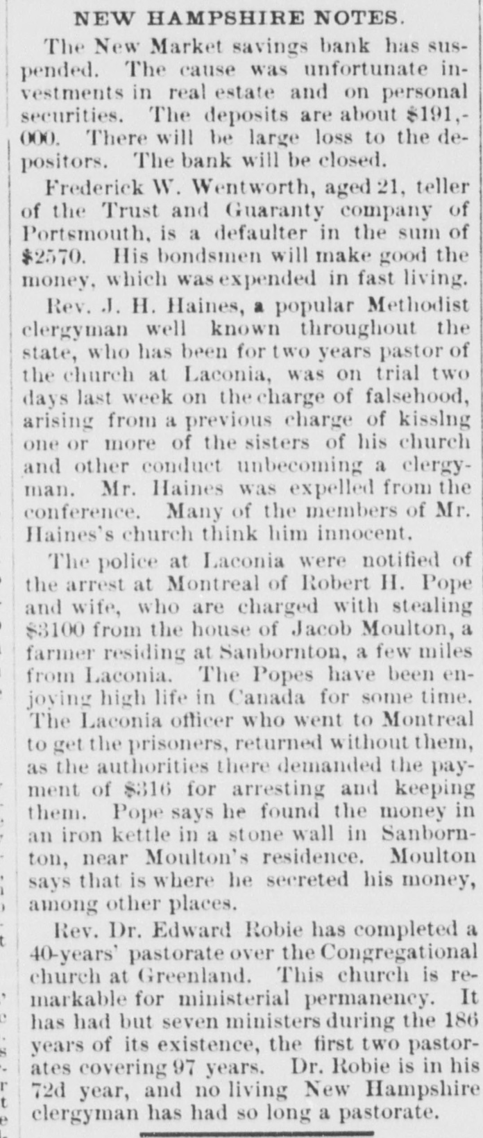 NEW HAMPSHIRE NOTES. The New Market savings bank has suspended. The cause was unfortunate investments in real estate and on personal securities. The deposits are about $191,000. There will be large loss to the depositors. The bank will be closed. Frederick W. Wentworth, aged 21, teller of the Trust and Guaranty company of Portsmouth, is a defaulter in the sum of $2570. His bondsmen will make good the money, which was expended in fast living. Rev. J. H. Haines, a popular Methodist clergyman well known throughout the state, who has been for two years pastor of the church at Laconia, was on trial two days last week on the charge of falsehood, arising from a previous charge of kisslng one or more of the sisters of his church and other conduct unbecoming a clergyman. Mr. Haines was expelled from the conference. Many of the members of Mr. Haines's church think him innocent. The police at Laconia were notified of the arrest at Montreal of Robert H. Pope and wife, who are charged with stealing $3100 from the house of Jacob Moulton, a farmer residing at Sanbornton, a few miles from Laconia. The Popes have been enjoying high life in Canada for some time. The Laconia officer who went to Montreal to get the prisoners, returned without them, as the authorities there demanded the payment of $316 for arresting and keeping them. Pope says he found the money in an iron kettle in a stone wall in Sanbornton, near Moulton's residence. Moulton says that is where he secreted his money, among other places. Rev. Dr. Edward Robie has completed a 40-years' pastorate over the Congregational church at Greenland. This church is remarkable for ministerial permanency. It has had but seven ministers during the 186 years of its existence, the first two pastorates covering 97 years. Dr. Robie is in his 72d year, and no living New Hampshire clergyman has had so long a pastorate.