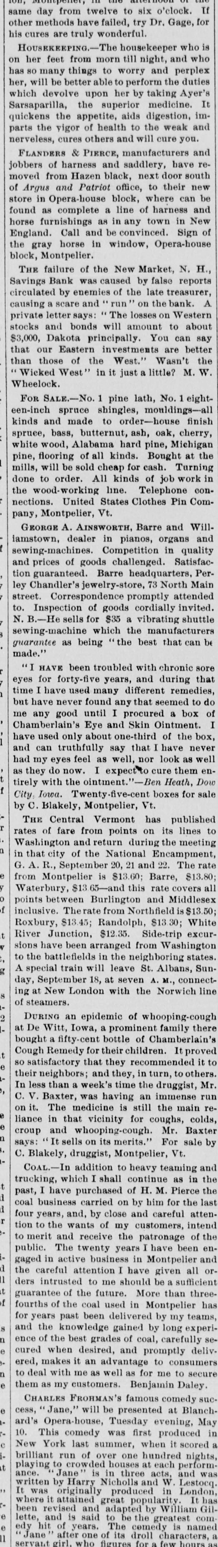 If Montpener, from twelve to six o'clock. same methods day have failed, try Dr. Gage, for his other cures are truly wonderful. is who HOUSEKEEPING. The housekeeper and who feet from morn till night, perplex on her things to worry and the duties has so will many be better able to perform taking Ayer's It her, which devolve upon her by medicine. Sarsaparilla, the superior digestion, imquickens the appetite, of health aids to the weak and parts nerveless, the vigor cures others and will cure you. and & PIERCE, manufacturers have reFLANDERS of harness and saddlery, door south jobbers from Hazen black, next to their new moved and Patriot office, where can be of Argus Opera-house block, harness and store in complete a line of in New found furnishings as as in any town Sign of horse Call and be convinced. Opera-house the England. gray horse in window, block, Montpelier. H., failure of the New Market, false reports N. THE Bank was caused by treasurer, Savings by enemies of the late bank. A circulated and run' on the private causing and letter a scare bonds says: " will The amount losses on to Western can about say stocks Dakota principally You are better $3,000, Eastern investments Wasn't the that our those of the West." little? M. W. than Wicked West" in it just a Wheelock. SALE.-No. 1 pine lath, mouldings-all No. 1 eightFOR spruce shingles, finish een-inch made to order-house kinds and butternut, ash, oak, cherry, spruce, wood, bass, Alabama hard pine, Bought Michigan at the white flooring of all kinds. Turning pine, be sold cheap for cash. work in mills, will order. All kinds of job condone wood-working to line. Telephone Pin Comnections. the United States Clothes pany, Montpelier, Vt. WillA. AINSWORTH, Barre organs and and GEORGE dealer in pianos, quality sewing-machines. iamstown, Competition in Satisfacof goods challenged. Perand prices Barre headquarters, Main street. tion Chandler's guaranteed. jewelry-store, 73 North attended goods ley Correspondence promptly cordially invited. to. Inspection for of $35 a vibrating shuttle N. He sells which the manufacturers be gewing-machine guarantee as being the best that can made." been troubled with chronic during that sore "I for HAVE forty-five years, and remedies, eyes have used many different seemed to do time I never found any that box of I but have good until I procured Ointment. a me any Eye and Skin of the box, Chamberlain's used only about one-third I have never have truthfully say that look as well and can feel as well, nor them enhad my eyes expect to cure Dow do now. I -Ben Heath, f as they the ointment.' for sale tirely Iowa. with Twenty-five-cent Vt. boxes by City: Blakely, Montpelier, r C. Central Vermont has its published lines to 1 THE of fare from points during on the meeting rates Washington and return National Encampment, el in that city September of the 20, 21 and Barre, 22. The $13.80 rate y G. A. Montpelier R., is $13.60; rate covers al o f from Waterbury, $13.65-and Burlington this and Middlesex points between from Northfield is $13.50 White t inclusive. Therate Randolph, $13.30 excurRoxbury, $13.45; $12.35. Side-trip V River Junction, arranged from Washington , sions have been the neighboring states. train g special A. M., to the battlefields will in leave St. Albans, connect- Sunof steamers. day, ing A at September New London 18, at with seven the Norwich line 2 an epidemic of whooping-cough family there t at bought DURING De Witt, a fifty-cent Iowa, a bottle prominent children. of Chamberlain's It proved e Cough Remedy for their they recommended it In a less than , an so their satisfactory neighbors; week's that and they, time in the turn, druggist, to others. Mr. run immense a C. V. Baxter, medicine was having is still the main colds, ree on it. The in that vicinity for coughs, Mr. Baxter a liance and whooping-cough. For sale by croup It sells on its merits.' Vt. and says: Blakely, druggist, Montpelier, C. addition to heavy teaming as in the t 1 trucking, COAL.- which I shall of continue H. M. Pierce the I past, business I have purchased carried on by him careful for the atten- last r coal and, by close and intend four years, wants of my customers, of the tion to the receive the patronage been ento merit and twenty years I have and I public. The business in Montpelier all or 1 gaged careful in active attention I have be given a sufficient t the intrusted to me should than threef ders future. More has guarantee used in S fourths of of the the coal been delivered Montpelier by my teams, experia for years knowledge past gained by carefully long see and the best grades of coal, delivence of when the desired, and promptly consumers a cured makes it an advantage for to me to secure e ered, to deal with my customers. me as well as Benjamin comedy Daley. suc e them as FROHMAN'S famous at Blanch CHARLES Jane," will be presented evening, May in cess, Opera-house, Tuesday produced c a ard's This comedy was first when it scored 10. New York last summer, one hundred nights, t brilliant run crowded of over houses at acts, each and perform- was playing to is in three and W. , written by Harry produced in e where it attained adapted by com ance. It was Jane' originally and great Nicholls popularity. greatest William Lestocq London It has Gile lette, and is said The comedy is a 1 girl, servant edy Jane hit after one figures of its for few hours as been revised of years. to be droll the characters, named who